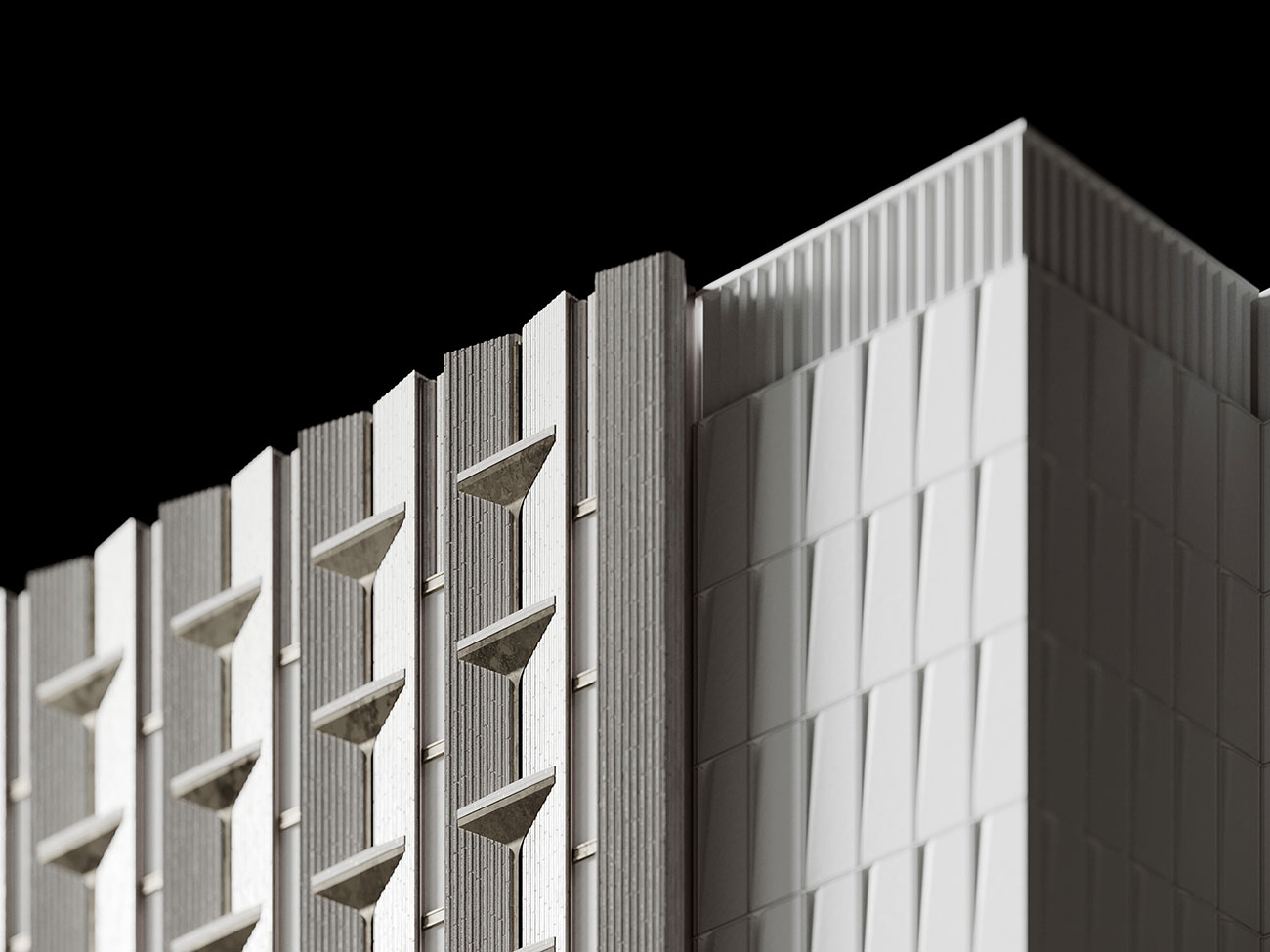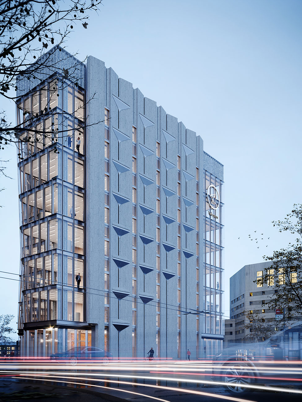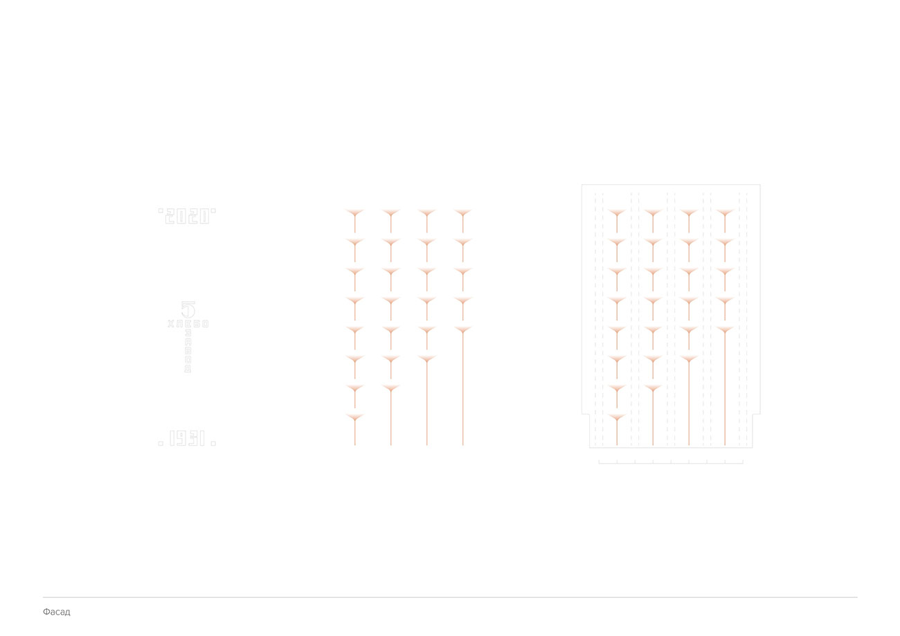 Фасадные решения реализованы посредством сочетания стекла, камня, металла и современных форм использования обозначенных материалов. Основной акцент сделан на части фасада, ориентированной на основную видовую точку со стороны главной улицы. Решение основано на использовании вертикальных простенков с узкими оконными проемами. Простенки облицованы декоративными каменными плитами и композитными металлическими панелями, для того чтобы избежать монотонности и посредством сочетания выразить эстетическую сторону каждого материала.