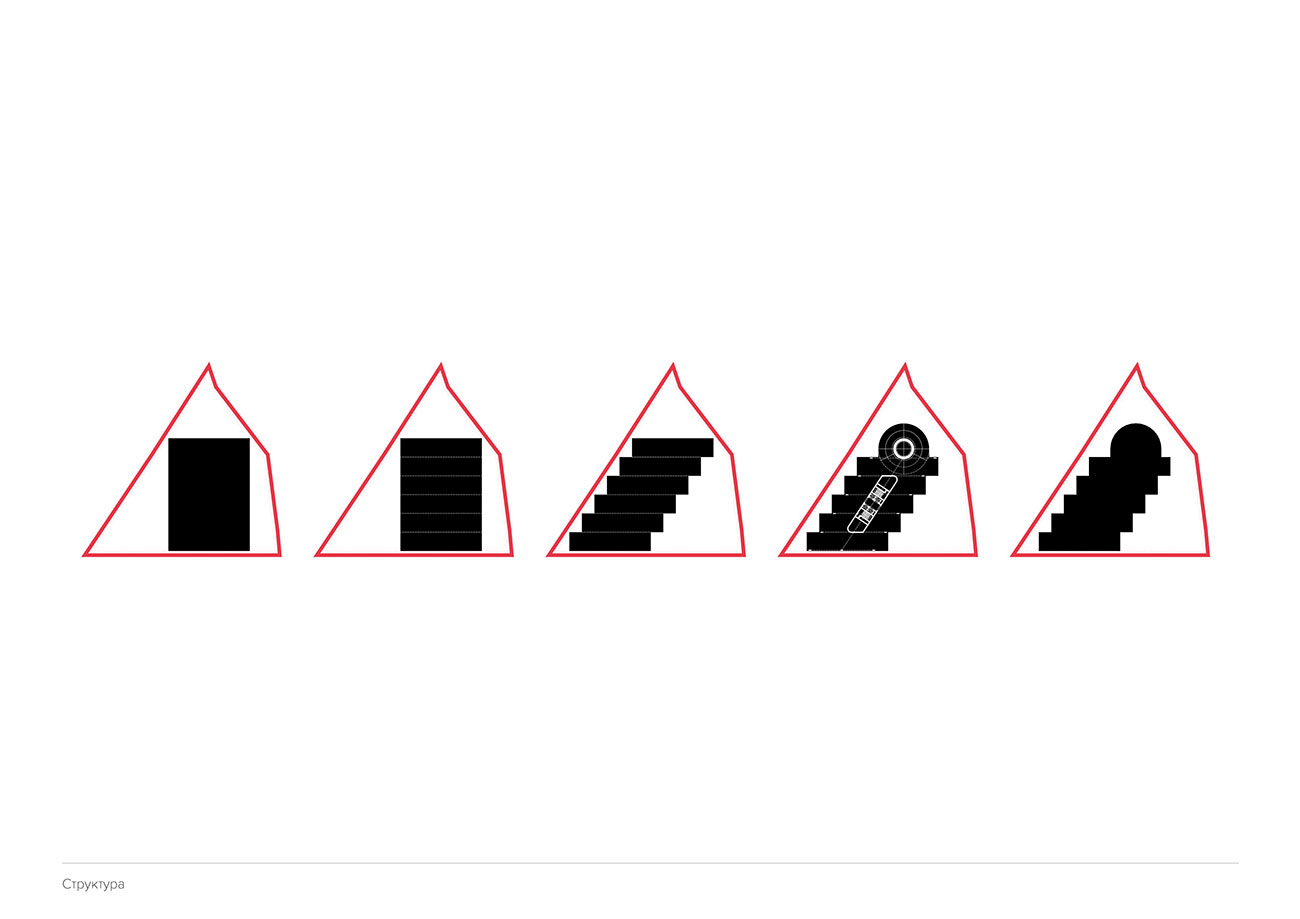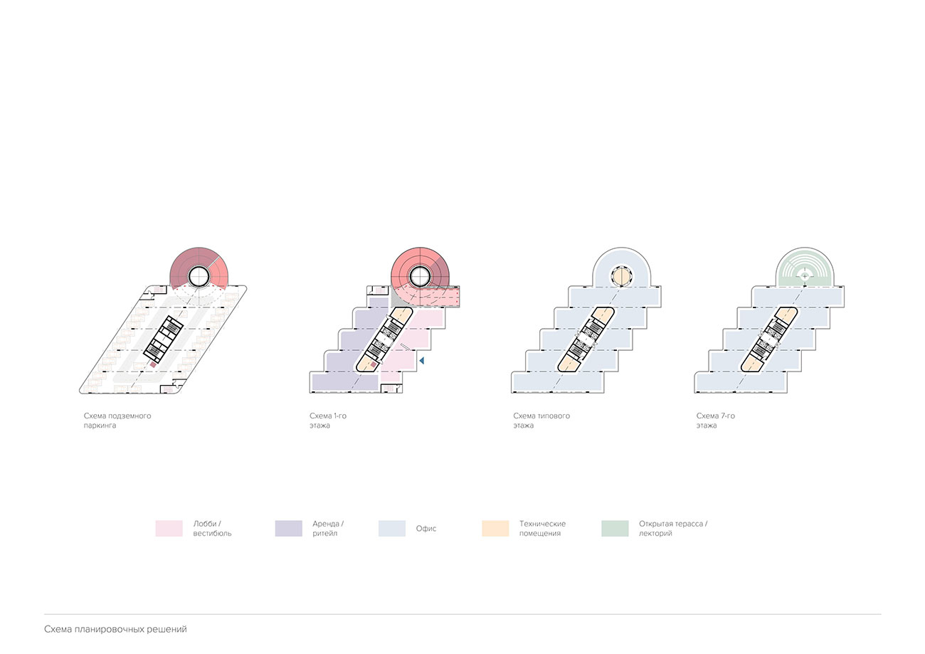 Общая планировочная структура здания — ступенчато-смещенные объемы — обусловлена сложной геометрией участка и влиянием примыкающей к территории сложившейся схемы застройки. Для экономии площади въезд в подземный паркинг организован посредством встроенной в объем здания двупутной кольцевой рампы. На первом этаже расположены лобби с выделенным подъездом и ориентированные на улицу помещения под аренду.