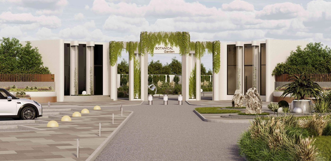 Основная задача проектирования входной группы в ботанический сад — организовать пространство в соответствии с функциональными, экологическими и эстетическими требованиями. Создание яркого и художественного образа и вызвать у человека положительные эмоции при посещении данного участка. Входная группа в Ботанический сад представляет конструкцию из трёх арок. Расположение озеленения на верхней части создают эффект погружения в мир растений уже на самом входе в сад. Природный камень - основной материал при проектировании. Кассовая и охранная зона гармонично вписаны в природную окружающую среду за счёт сочетания конфигурации с аркой. Созданы с учетом баланса между функциональностью и сохранением естественной красоты природного ландшафта. Также учтены экологические аспекты при проектировании этих зон, минимизируя негативное воздействие на окружающую природу. Природный камень — основной материал при проектировании. Зона остановки общественного транспорта также подчиняется стилистическому решению. Повторяя плавно перетекающие линии, образует необычную конфигурацию здания. И уже на начальном этапе изучения сада притягивает к себе внимание посетителей. Парковочная зона рассчитана на 10 автомобилей (из них 1 м/м для МГН). Выполнена организация дорожной разметки и указателей для удобства передвижения и парковки гостей ботанического сада. Пешеходная зона организована с учетом наиболее выигрышных для каждого времени года экспозиций, природных особенностей территории и положения ее по отношению к окружающему ландшафту. В целом все элементы проектирования создают необыкновенную атмосферу на участке ботанического сада.