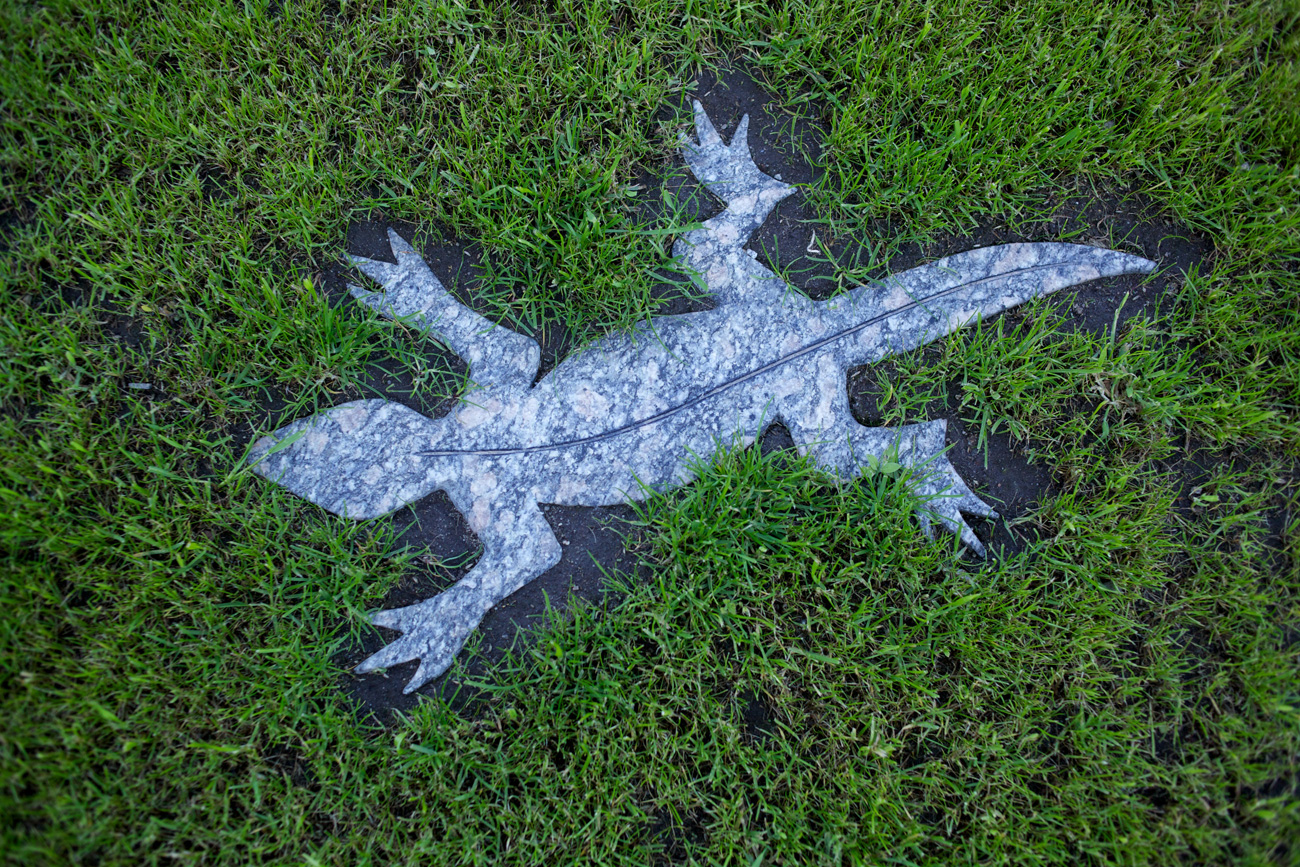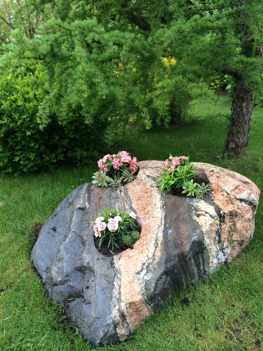 В этом проекте реализованы все идеи заказчика. Созданы массивные клумбы из естественного спила балтийского валуна, из которого в буквальном смысле растут живые цветы. Газон украшен необычными фигурами растений и животных, искусно выполненными из камня художниками и скульпторами Калининградской области.