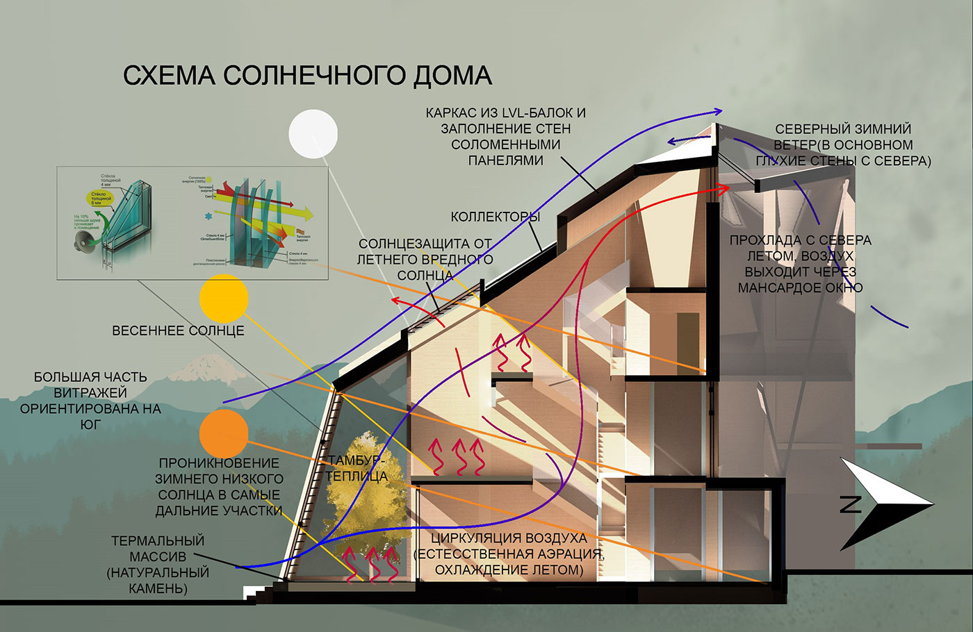 Основой композиционного решения дома является система прямого обогрева пространств здания. Из-за этого с увеличением высоты уменьшается площадь этажа с южной стороны, что позволяет солнечным лучам проходить в самые северные участки дома. Интерьер имеет очень интересную игру света и тени. Из-за стремления к вершине и острых углов в формообразовании проект назван «Скала». У дома имеется большое разнообразие видов блокировки: зеркально, линейно, со сдвигами, с внутренними дворами и т.д. В основном на южном фасаде имеется множество селективных солнцезащитных витражей, а с северной стороны они почти отсутствуют. С севера дом защищен от холодного зимнего ветра массивной стеной. Чтобы в доме не было перегрева, имеются солнцезащитные жалюзи, которые отражают высокое летнее солнце, а зимнее солнце беспрепятственно проникает в самые глубокие части дома за счет большого количества двухсветных пространств. Южный витраж спроектирован под 90° к зимнему солнцу. Блокированный дом оснащен термальными массивами (Direct gain). Имеется также солнечная теплица-тамбур, где можно высаживать огромные пальмы до 8 метров высотой. Объект оснащен также коллекторами и грамотной системой аэрации воздуха для экономии и сохранения энергии в доме.