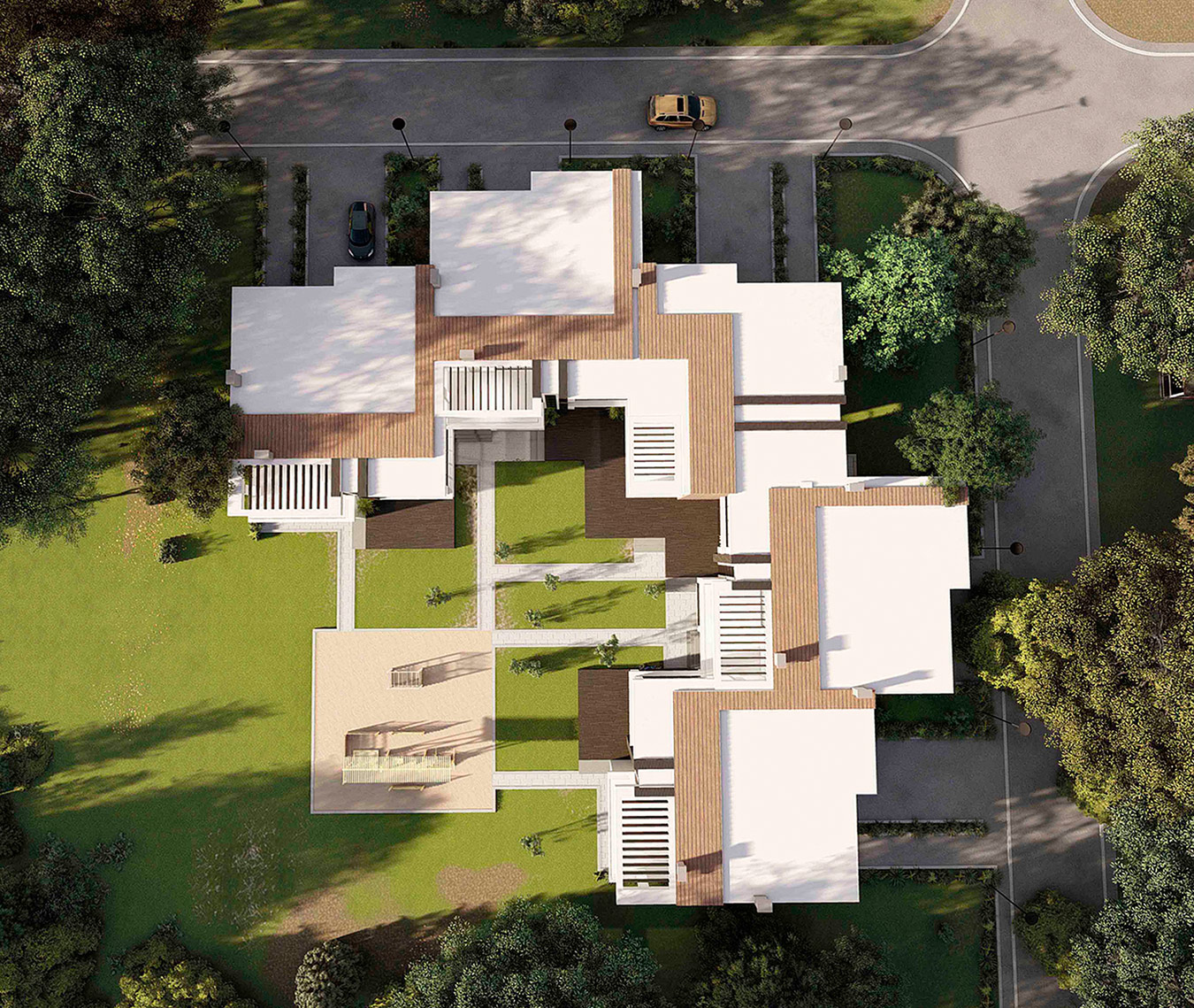 Таунхаус состоит из пяти схожих по планировке двухэтажных блоков, каждый из которых предназначен для проживания одной семьи. Соответственно в каждом блоке предусмотрен изолированный подъезд и вход в таунхаус, но все они имеют общий двор, оборудованный детской площадкой и скамейками. Комплекс спроектирован таким образом, что его удобно расположить на пересечении двух дорог.