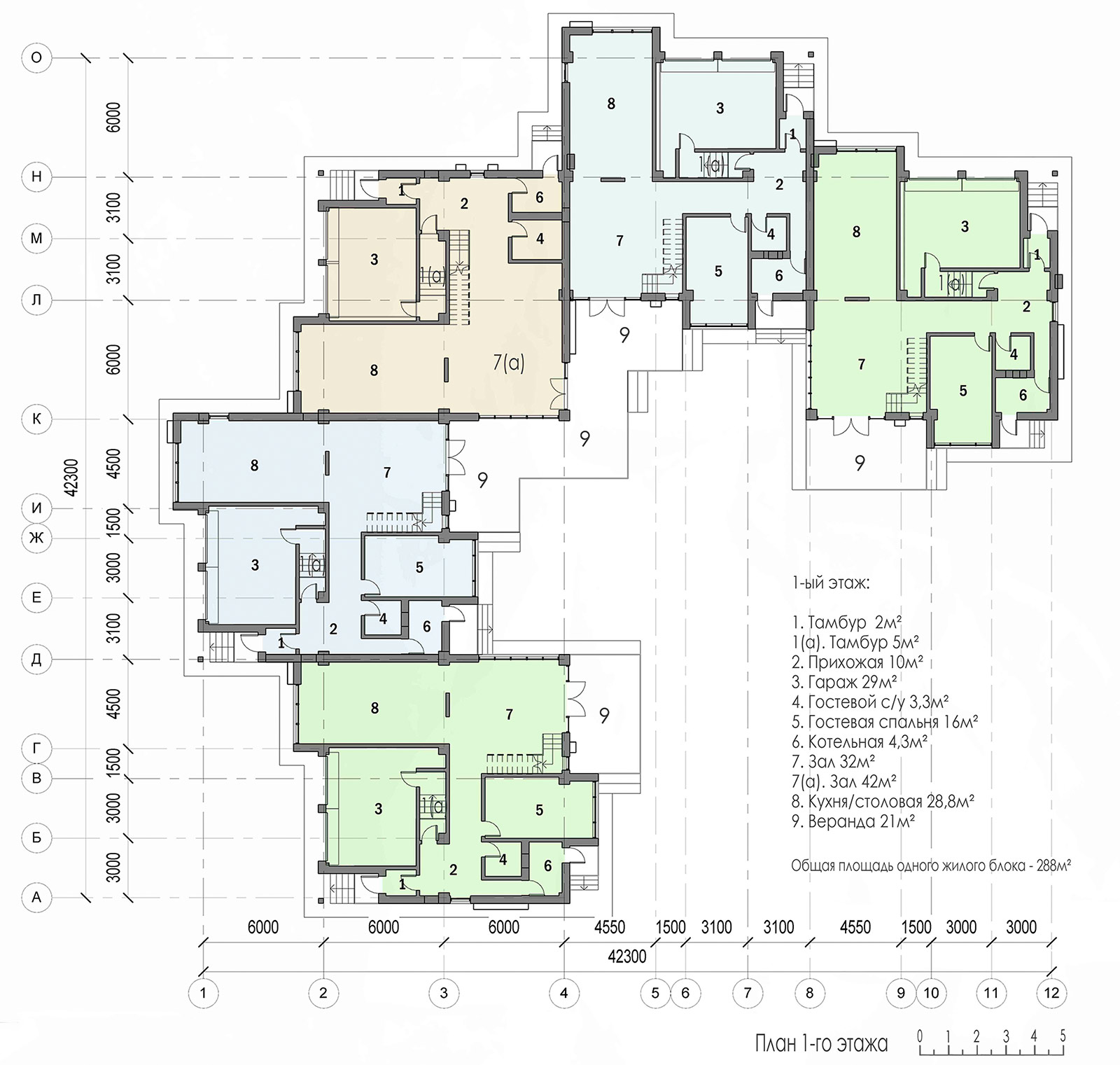 Площадь одного жилого блока составляет 288 м².