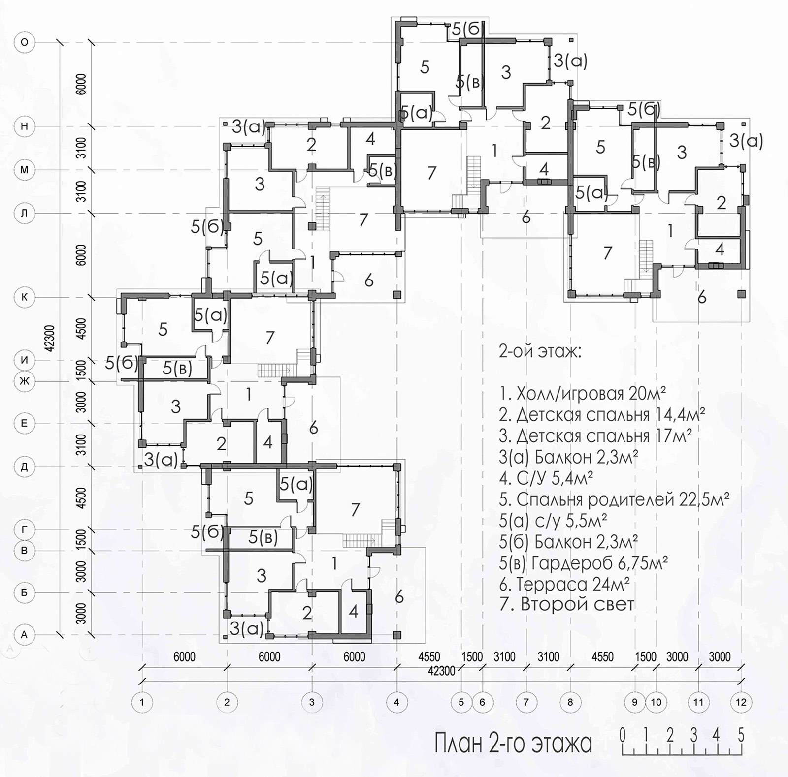 Второй этаж включает в себя мастер-спальню с гардеробной, собственным туалетом и балконом, две детские спальни, игровую, террасу с перголой, защищающей ее от прямого попадания солнечных лучей.