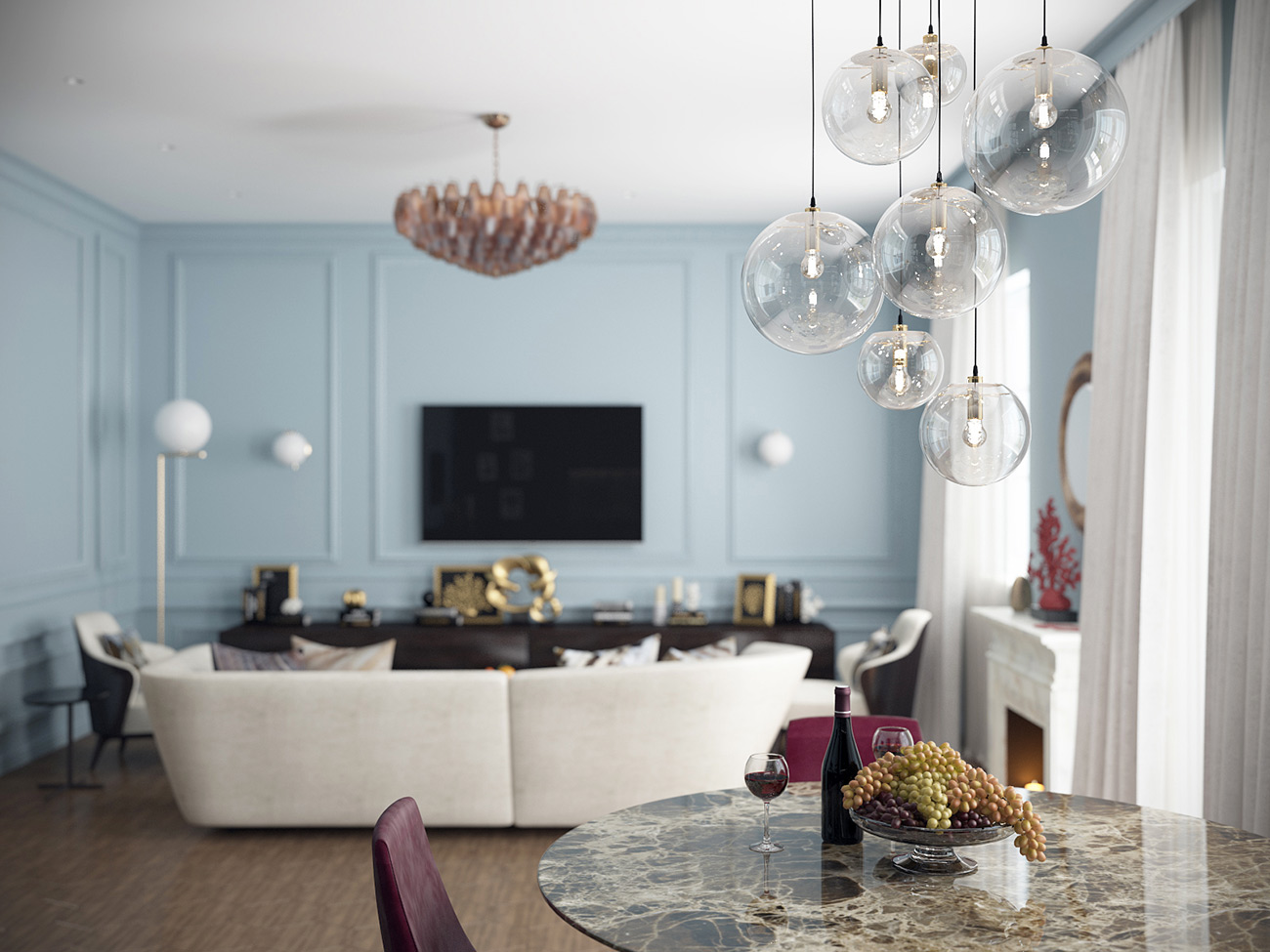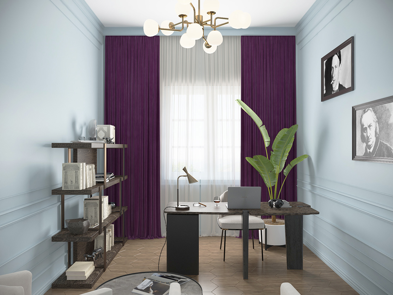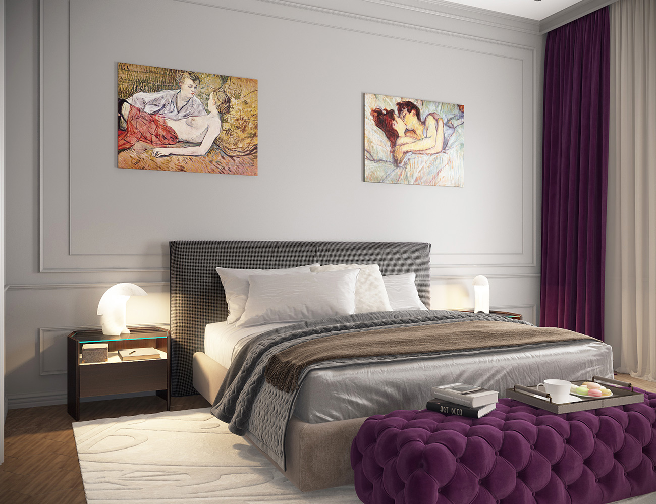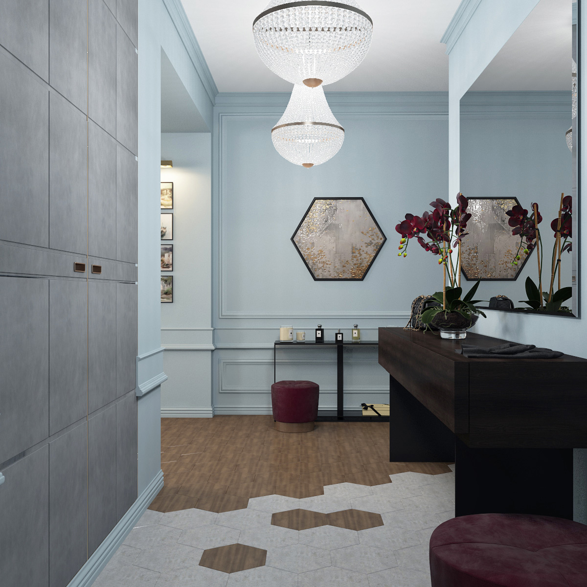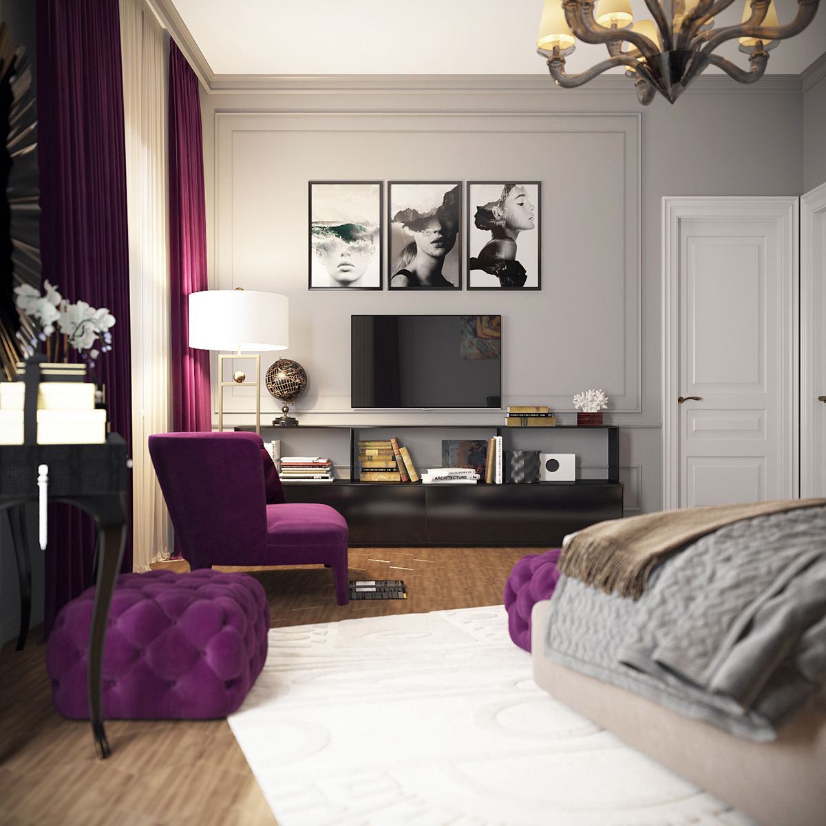 Трехкомнатная квартира площадью около 140 м² находится в ЖК «Донской Олимп» в историческом центре Москвы. Хозяева — немолодая семейная пара — пожелали иметь стильный, яркий, но не вульгарный интерьер. Одним из основных цветов палитры квартиры должен был стать серо-голубой. В этот цвет решили выкрасить стены. Для паркетного пола подобрали теплый оттенок американского ореха и решились на нестандартную восьмиугольную форму плашек. Как основной контраст использовали бордовые и лиловые оттенки. Стены квартиры оформили молдингами, потолок обрамили карнизами, оконные проемы украсили однотонным струящимся текстилем, при этом соблюдая все ключевые особенности парижского стиля.