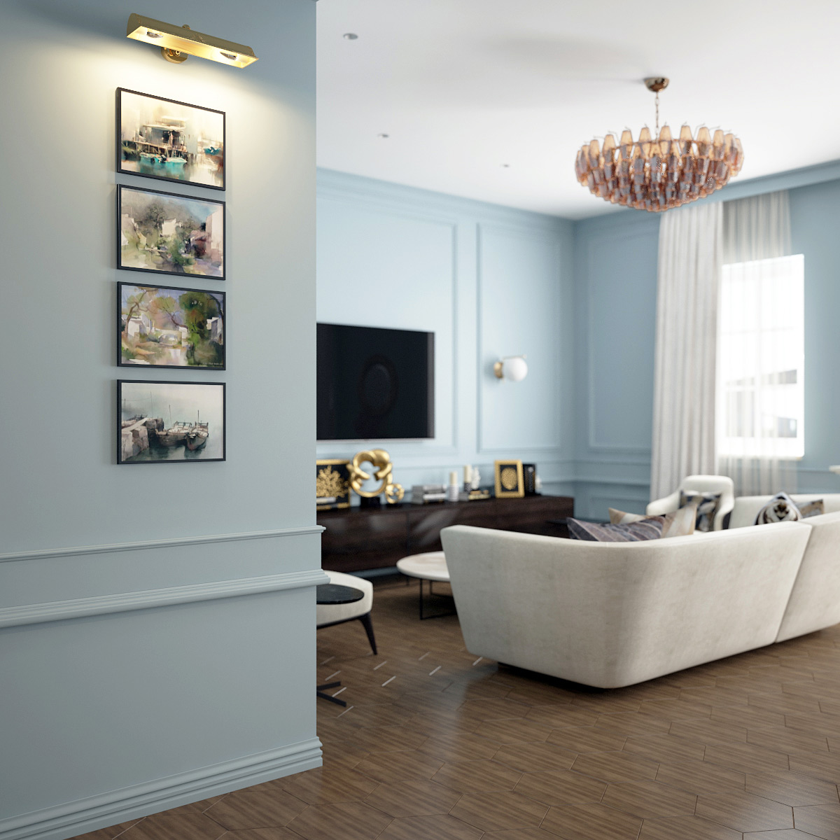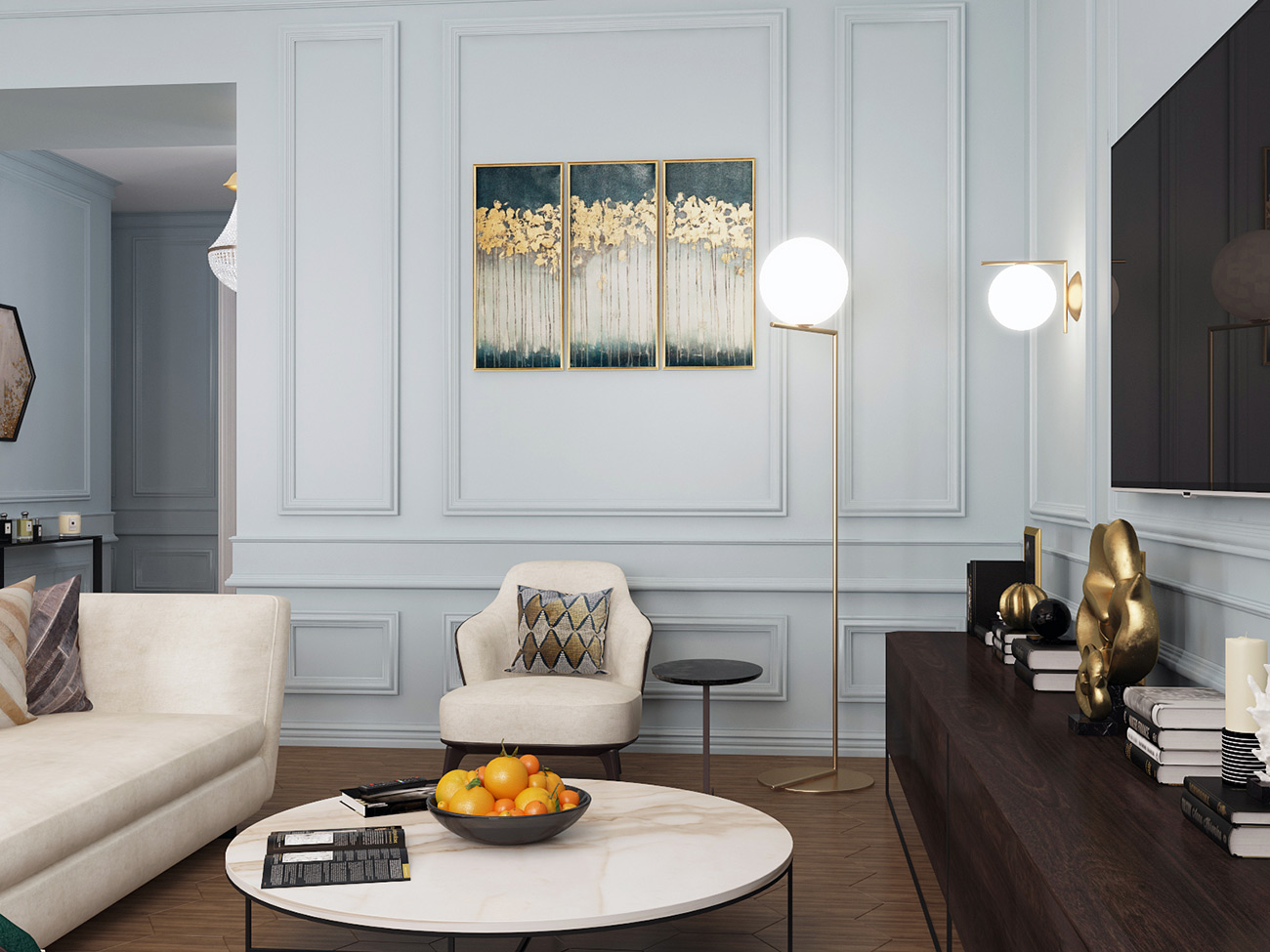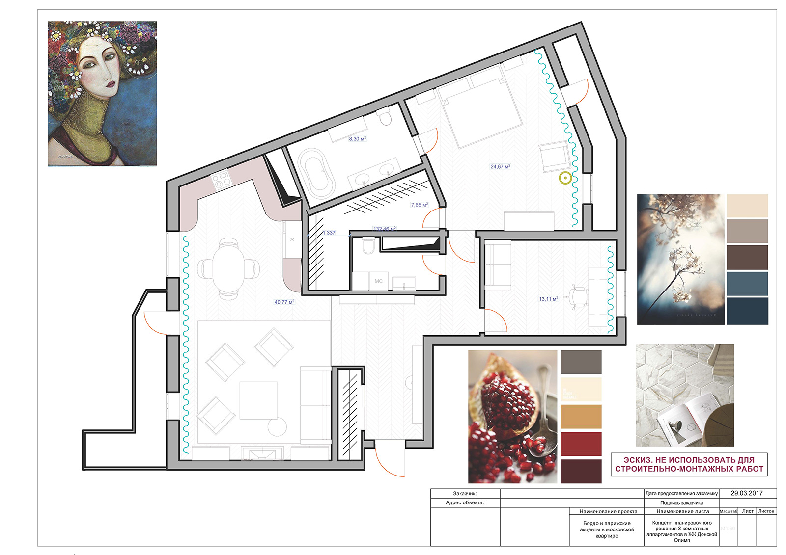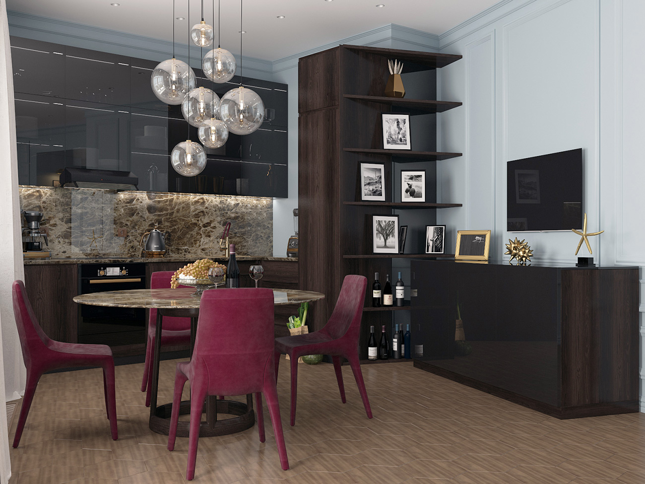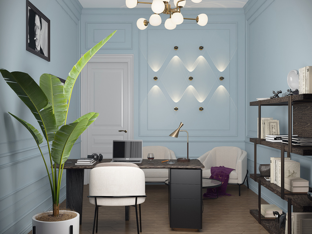 Трехкомнатная квартира площадью около 140 м² находится в ЖК «Донской Олимп» в историческом центре Москвы. Хозяева — немолодая семейная пара — пожелали иметь стильный, яркий, но не вульгарный интерьер. Одним из основных цветов палитры квартиры должен был стать серо-голубой. В этот цвет решили выкрасить стены. Для паркетного пола подобрали теплый оттенок американского ореха и решились на нестандартную восьмиугольную форму плашек. Как основной контраст использовали бордовые и лиловые оттенки. Стены квартиры оформили молдингами, потолок обрамили карнизами, оконные проемы украсили однотонным струящимся текстилем, при этом соблюдая все ключевые особенности парижского стиля.