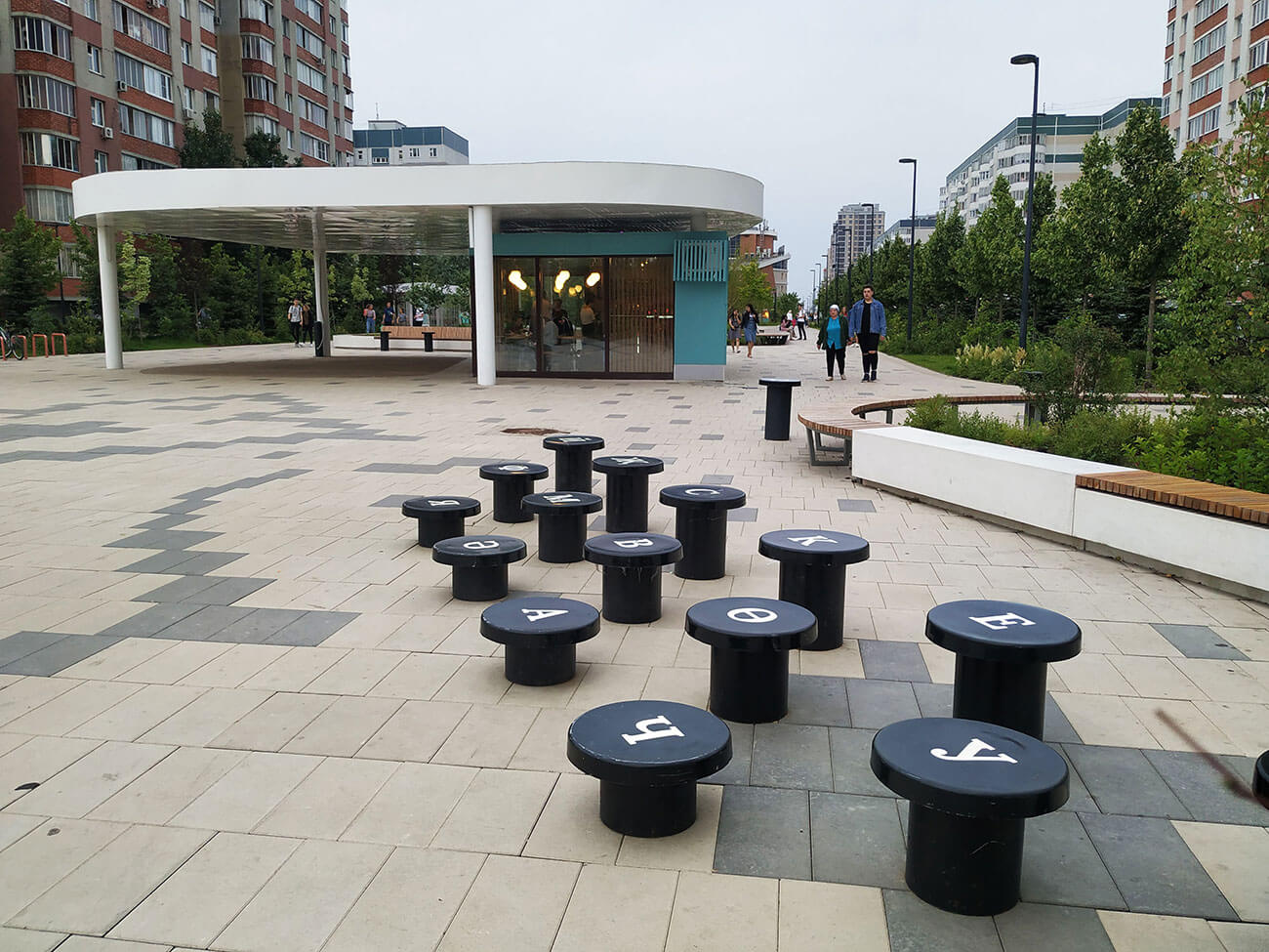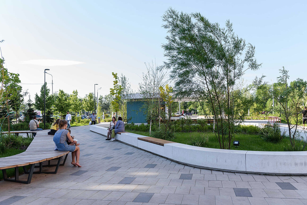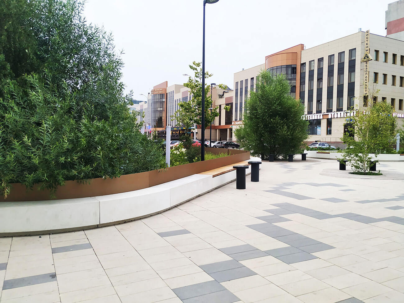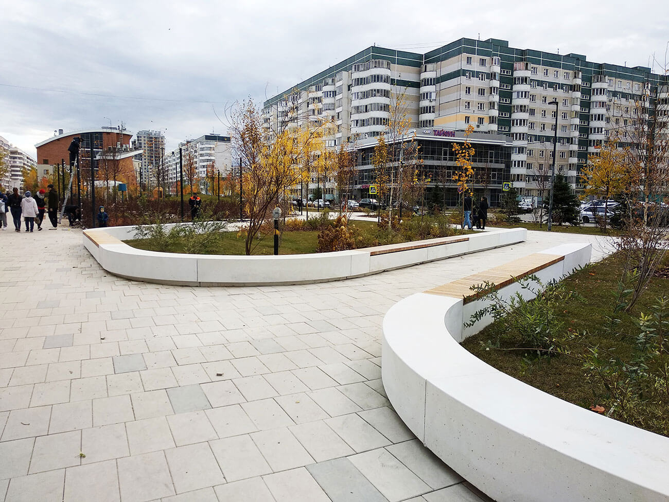 Скамьи из белого стеклофибробетона, обрамляющие зеленые зоны, защищают молодые кустарники от вытаптывания, распределяют пешеходные потоки и являются широкой скамьей для отдыха гостей бульвара. Для этого в бетонные элементы интегрированы деревянные сиденья со спинками. За счет применения бетона скамейки получились вандалоустойчивыми — по ним часто катаются на скейтах и велосипедах.