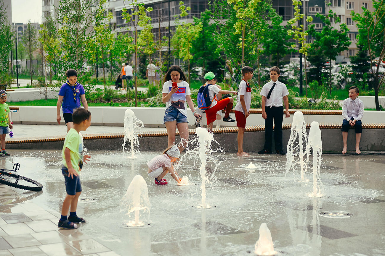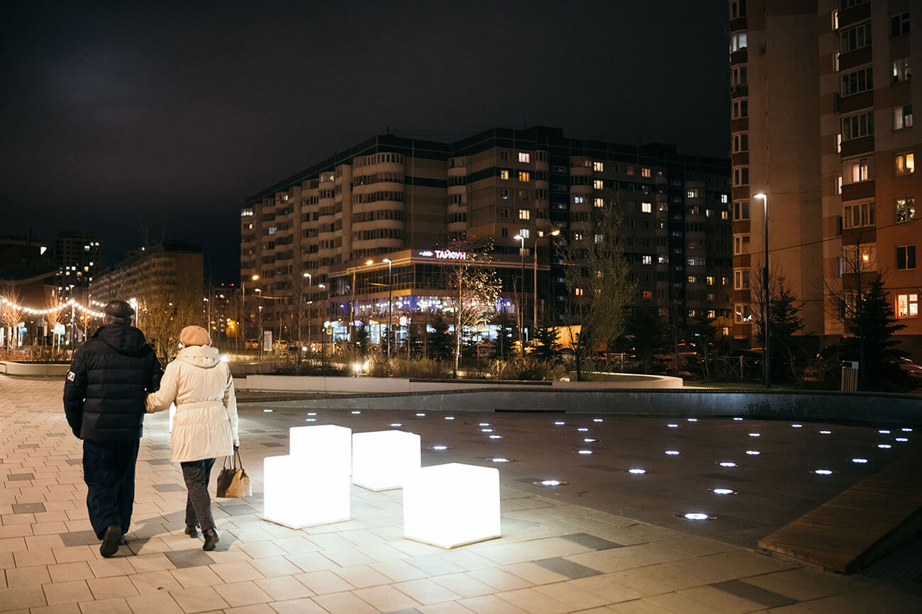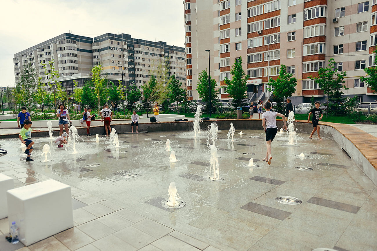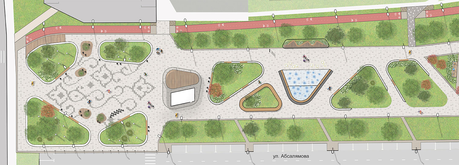 Белая бетонная лента формирует полусухой фонтан, посвященный Абдурахману Абсалямову. Идея построить в память о писателе не просто скульптуру или бюст, а объект для созерцания и взаимодействия впервые прозвучала на общественных обсуждениях с жителями района. Так на бульваре появился необычный полусухой фонтан с кантом из бетонной скамьи, формирующей неглубокую чашу. Здесь можно гулять между струй по сухому покрытию, а можно сесть на скамью и опустить ноги в воду. Место работает и зимой! Белоснежная яркая подсветка форсунок пробивается сквозь снег, а дети играют и раскапывают, как «секретики», мерцающие «белые цветы».