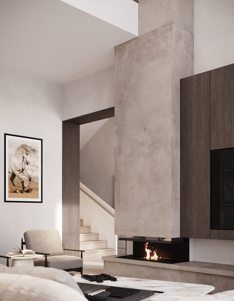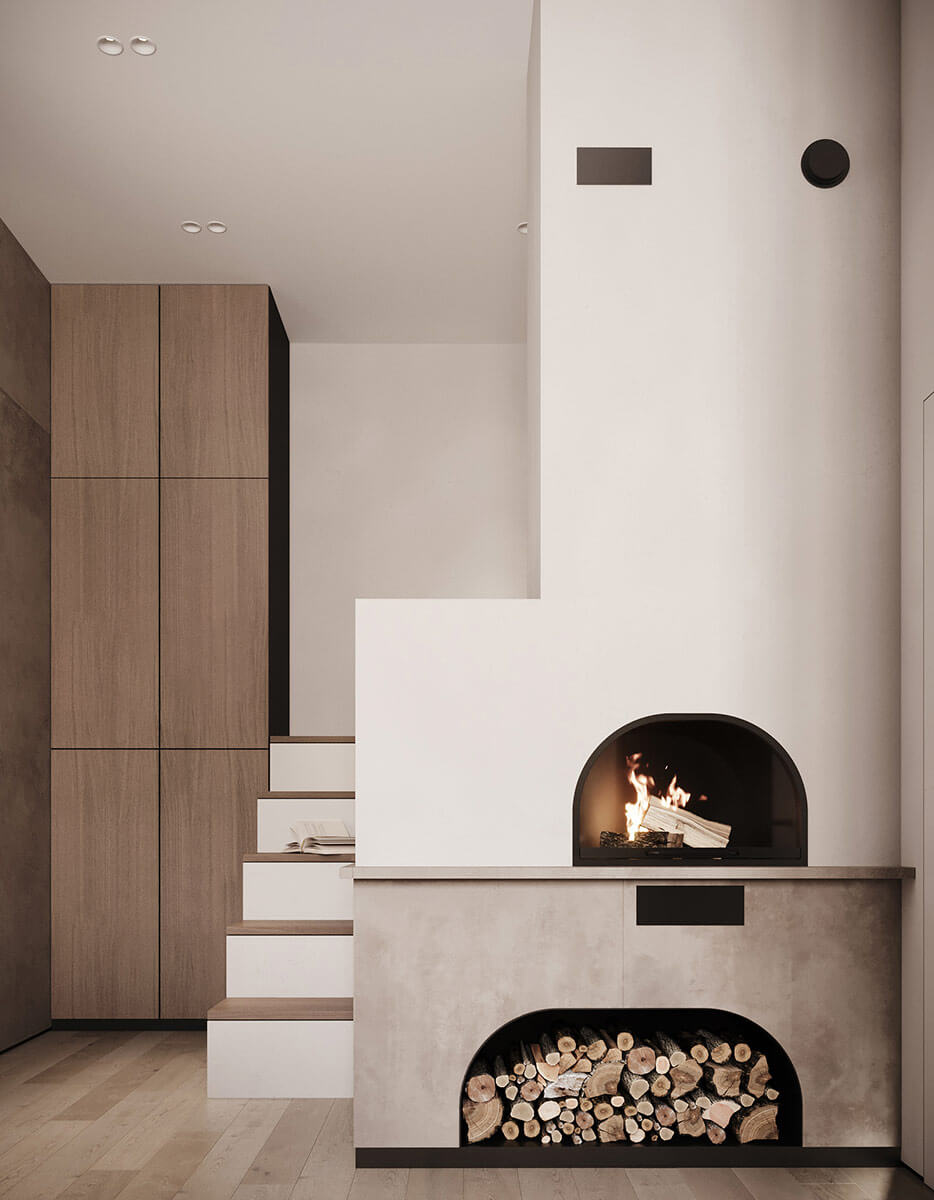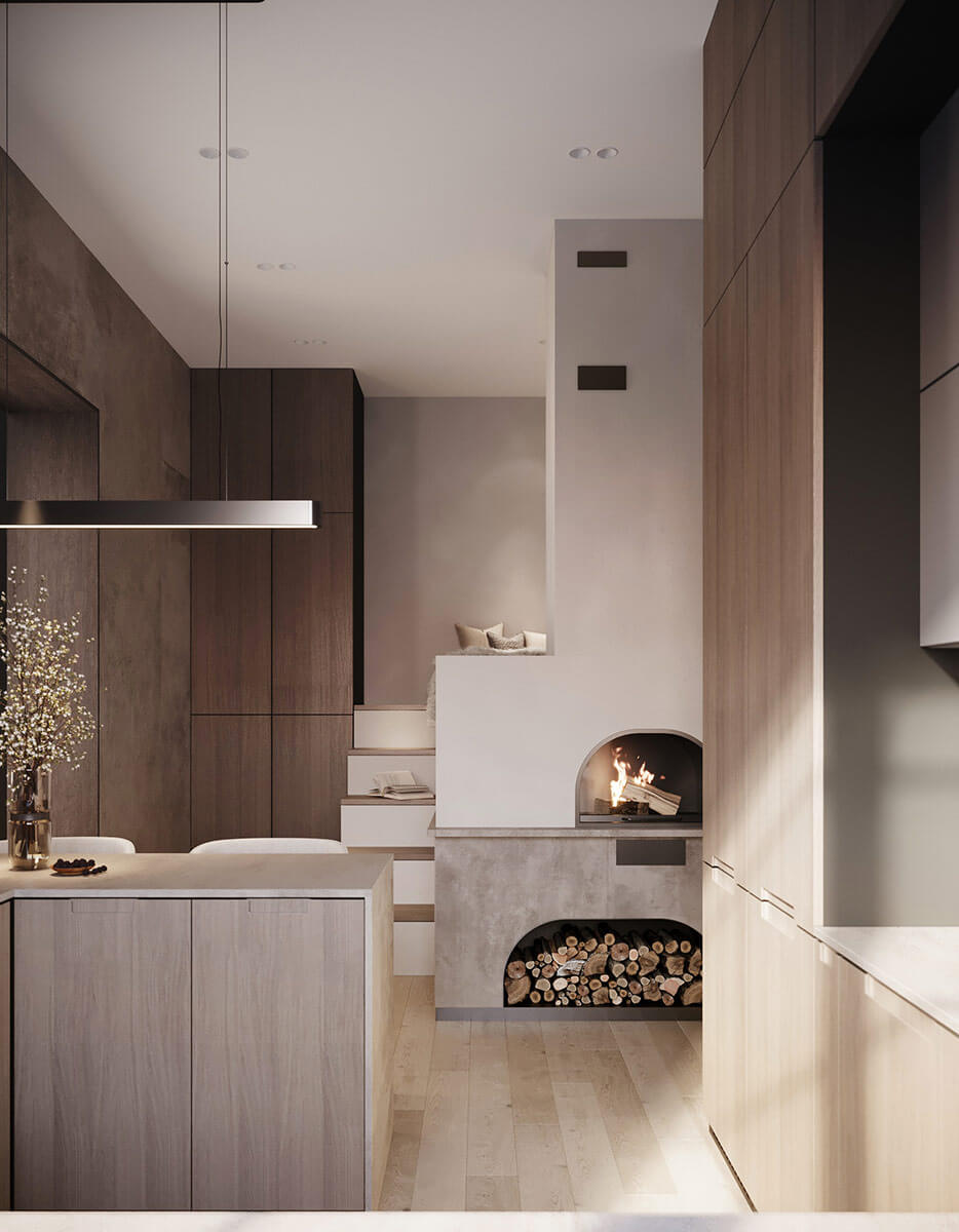 В центре дома находится – зона отдыха, которая включает в себя гостиную-столовую, кухню и главную спальню. В гостиной расположен уютный минималистичный камин. Отделка камина выполнена в песочном цвете, конструкция выглядит очень легко, идеально дополняет интерьер, нисколько не перегружая его.