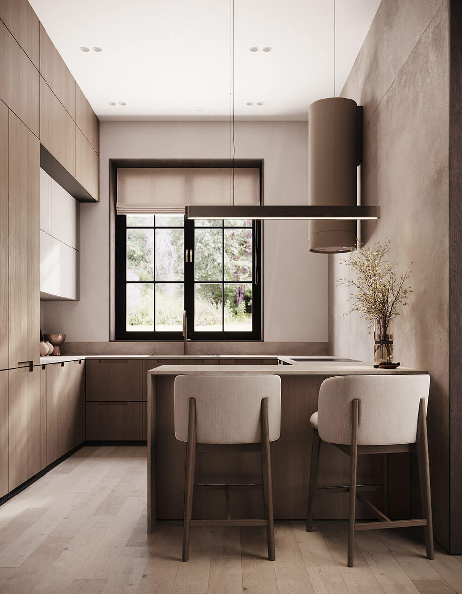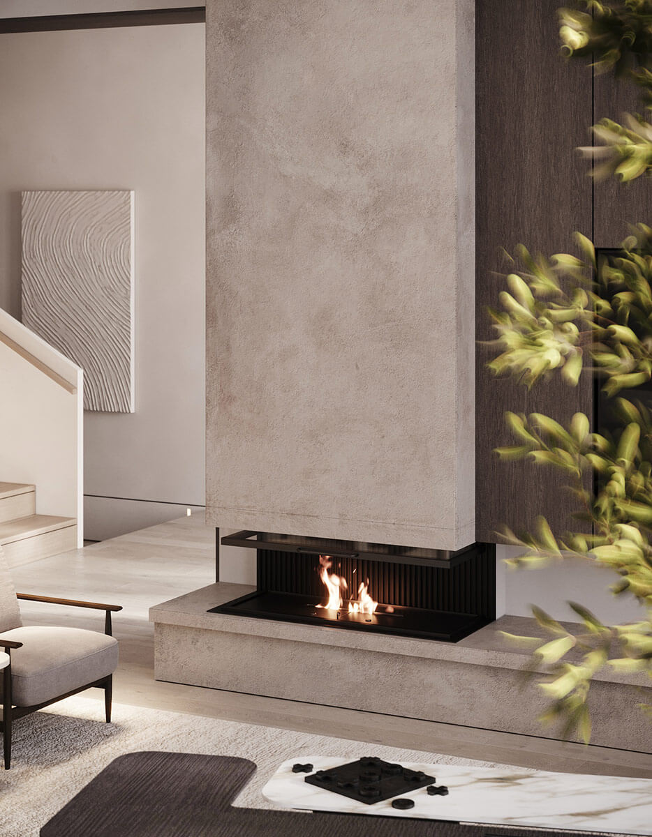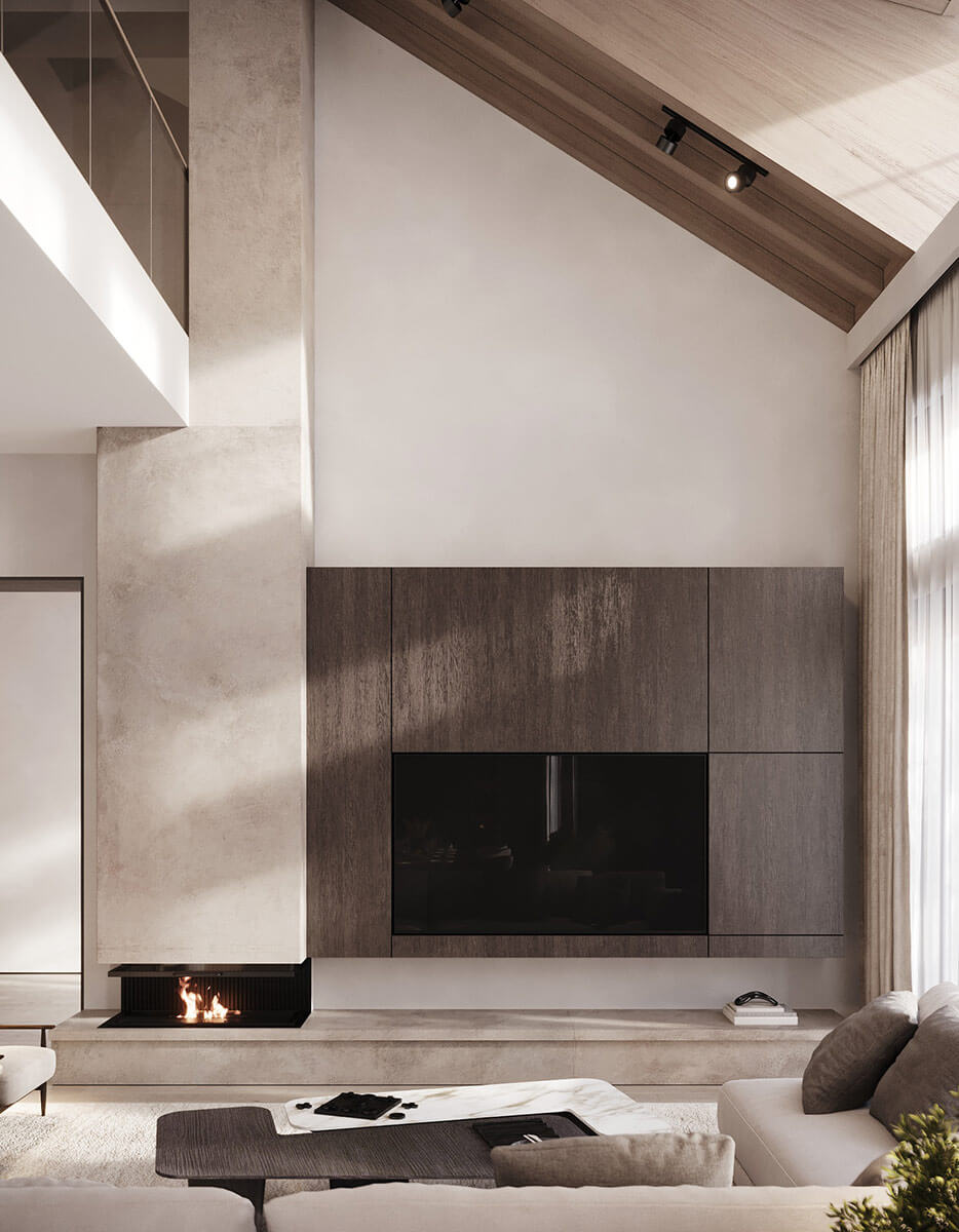 В центре дома находится – зона отдыха, которая включает в себя гостиную-столовую, кухню и главную спальню. В гостиной расположен уютный минималистичный камин. Отделка камина выполнена в песочном цвете, конструкция выглядит очень легко, идеально дополняет интерьер, нисколько не перегружая его.