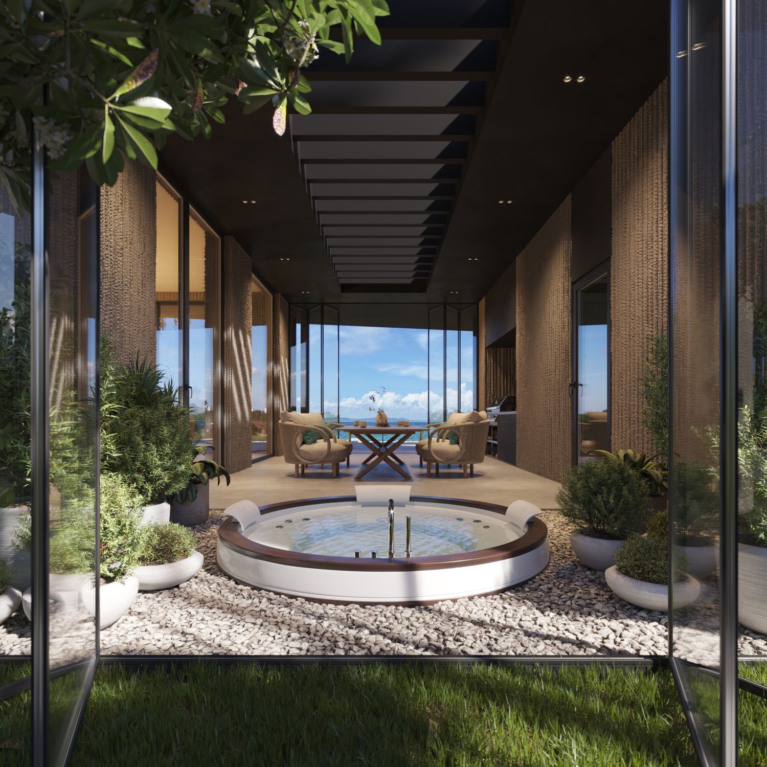 Архитектура здесь не доминирует над природой, а вступает с ней в равноправный диалог. Свет и зелень интегрированы в структуру здания, превращаясь в полноценные материалы наравне с бетоном и стеклом. Биофильная концепция раскрывается и на уровне функционального наполнения: на территории комплекса предусмотрены сауна, бассейн с гидромассажной ванной и купелью, формирующие непрерывную зону релаксации на границе интерьера и ландшафта.