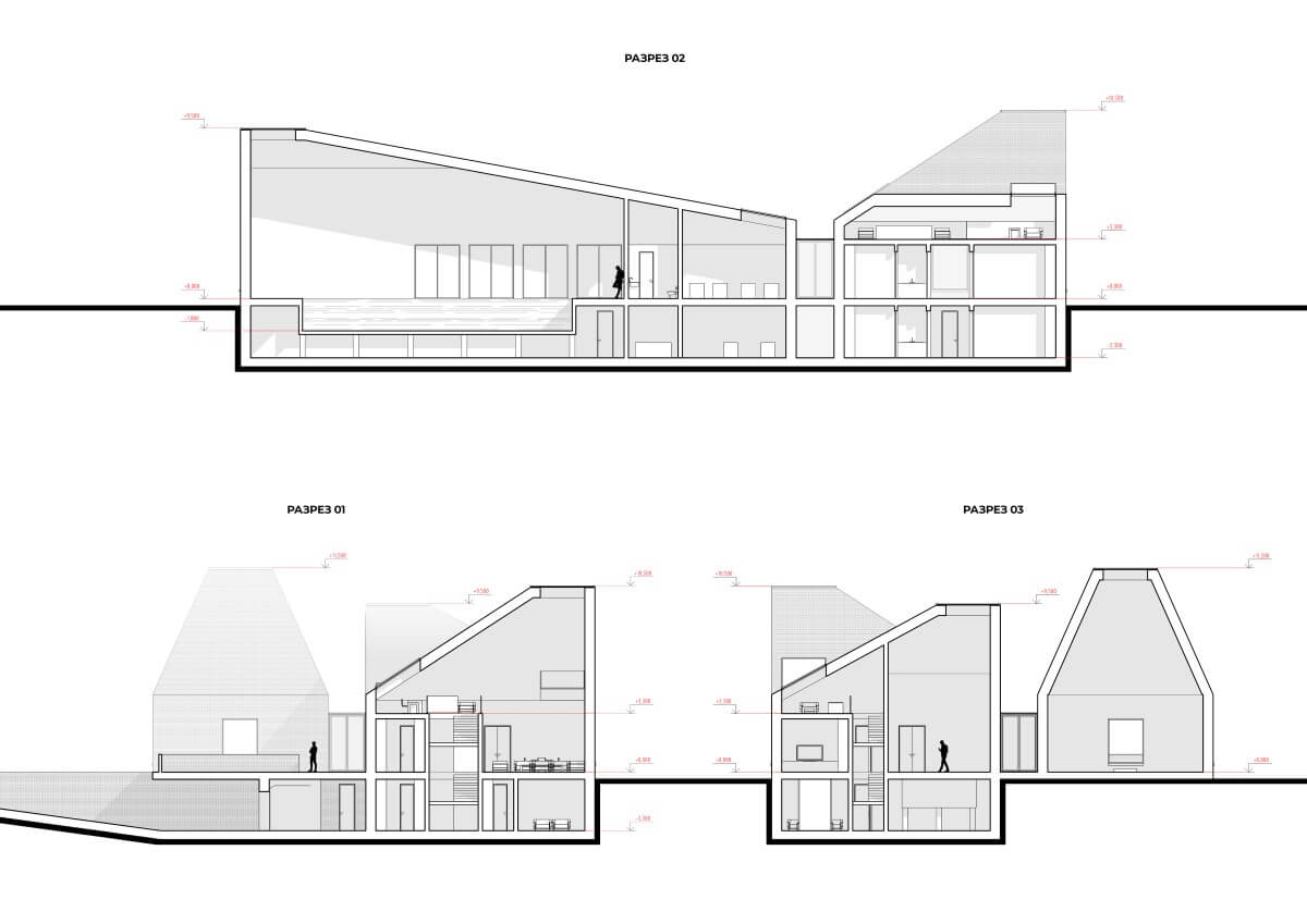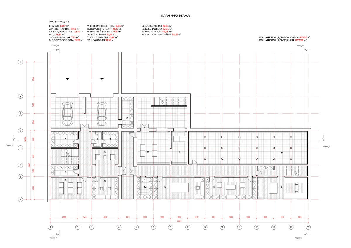 В основе планировочного решения лежит выявление архитектурной формы здания в интерьере и организация комфортного функционального зонирования. На первом этаже располагаются помещения гостиной, кухни и гардеробной в первом блоке. Второй блок представляет собой бассейн, тренажерный зал и жилые комнаты. Третий объем — открытое пространство с каминной зоной. На втором этаже — антресоль, которая является частью гостиной зоны, и комната отдыха при главной спальне. Цокольный этаж включает в себя гараж, технические помещения и пространства для проведения досуга: винный погреб, кинотеатр, бильярдную, библиотеку, мастерскую при главной спальне.