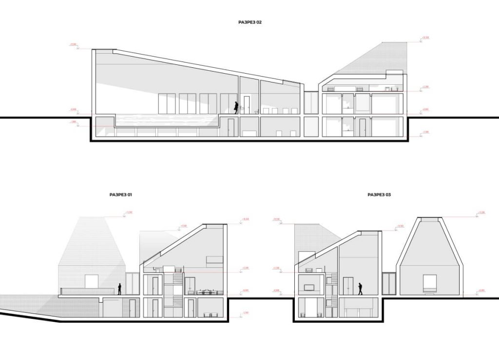 В основе планировочного решения лежит выявление архитектурной формы здания в интерьере и организация комфортного функционального зонирования. На первом этаже располагаются помещения гостиной, кухни и гардеробной в первом блоке. Второй блок представляет собой бассейн, тренажерный зал и жилые комнаты. Третий объем — открытое пространство с каминной зоной. На втором этаже — антресоль, которая является частью гостиной зоны, и комната отдыха при главной спальне. Цокольный этаж включает в себя гараж, технические помещения и пространства для проведения досуга: винный погреб, кинотеатр, бильярдную, библиотеку, мастерскую при главной спальне.
