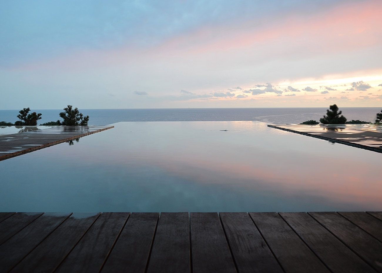 Бассейн имеет переливной лоток по всему периметру. Нависающая часть по боками оформлена природными камнями, что органично вписывает конструкцию в окружающий скалистый ландшафт. Остальная его часть накрыта террасной доской, изготовленной из тиковых пород.