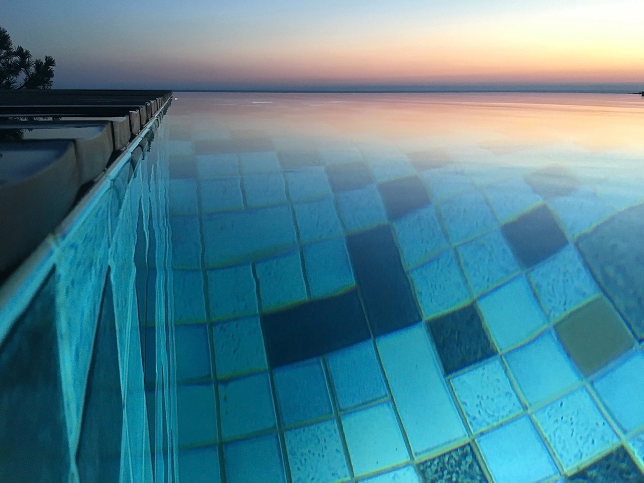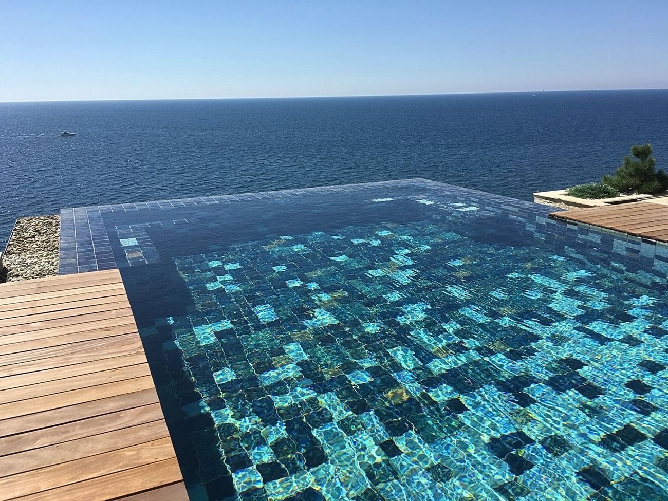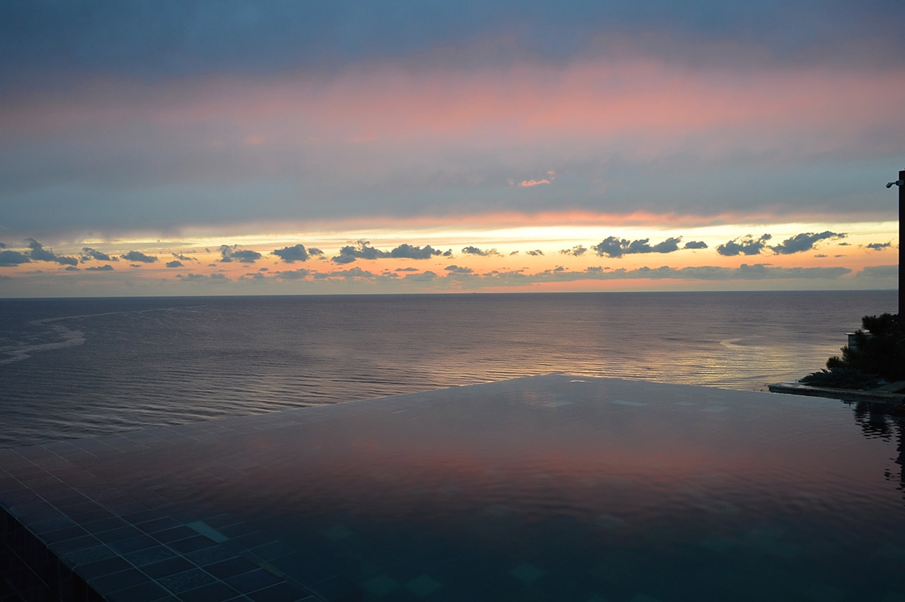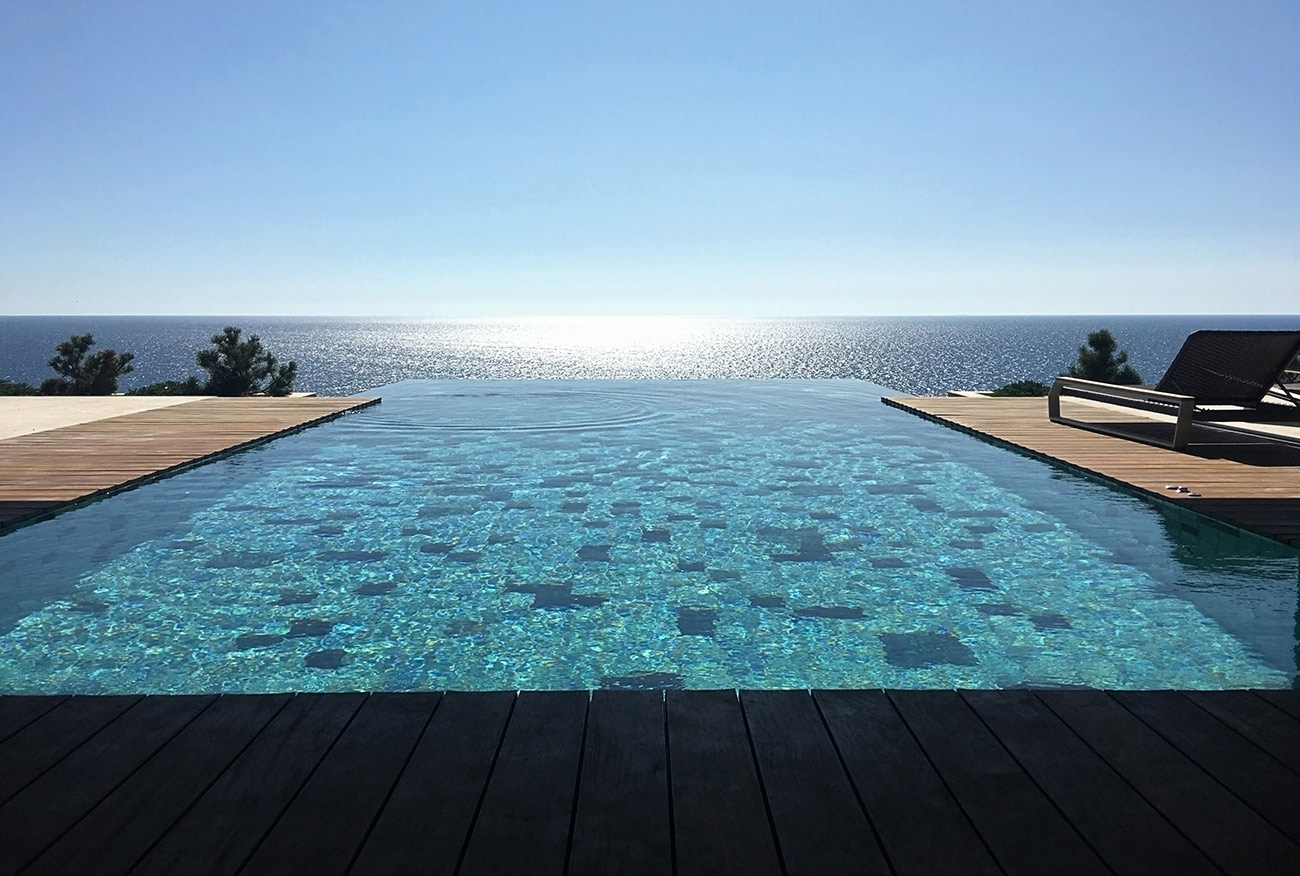 Расположение бассейна говорит о сложности его конструкции. Треть бассейна консольно нависает над обрывом скалы, уходящей в море, благодаря чему создается эффект «Infinity». Облицовка керамогранитом с переходящим градиентом еще больше стирает грань между водой в бассейне и морем.
