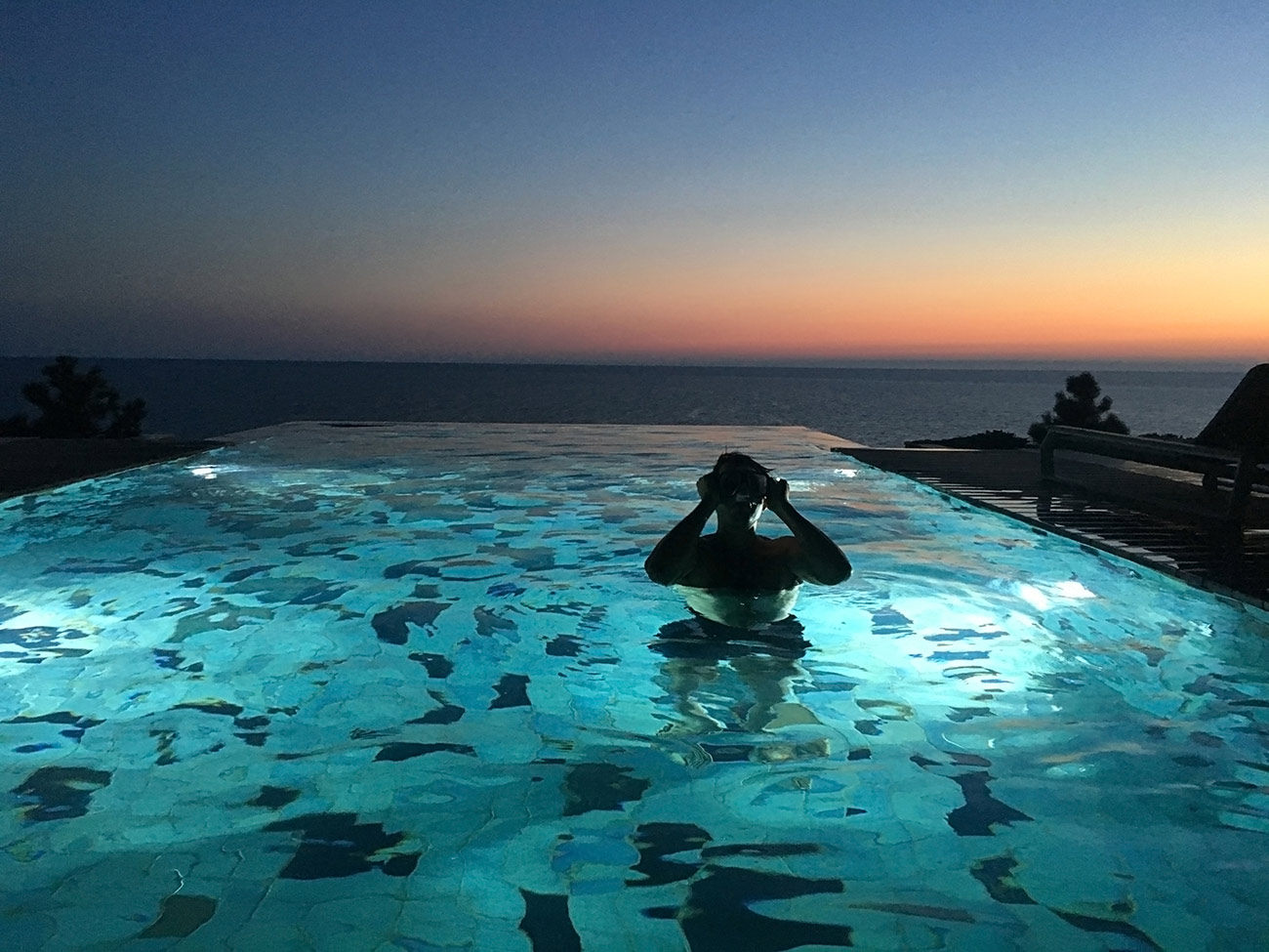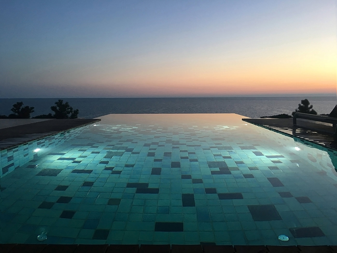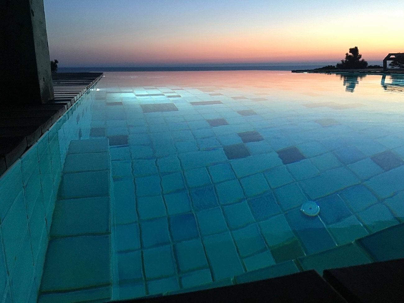 Расположение бассейна говорит о сложности его конструкции. Треть бассейна консольно нависает над обрывом скалы, уходящей в море, благодаря чему создается эффект «Infinity». Облицовка керамогранитом с переходящим градиентом еще больше стирает грань между водой в бассейне и морем.
