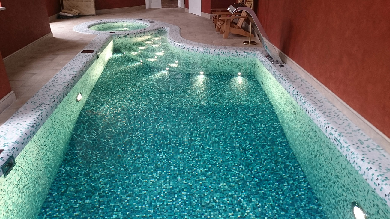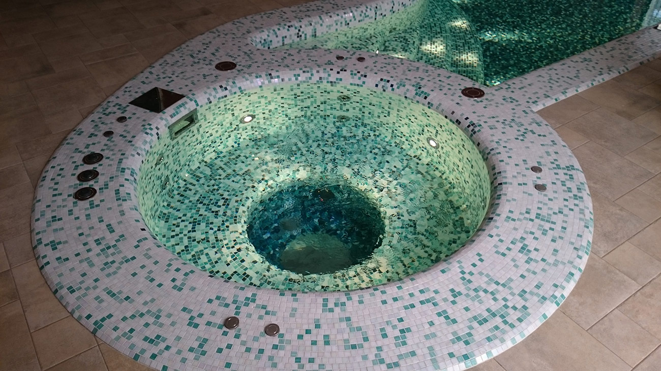 При отделке чаш использовалась стеклянная мозаика Bisazza (Италия). Удобная римская лестница обеспечивает безопасный спуск в бассейн.
