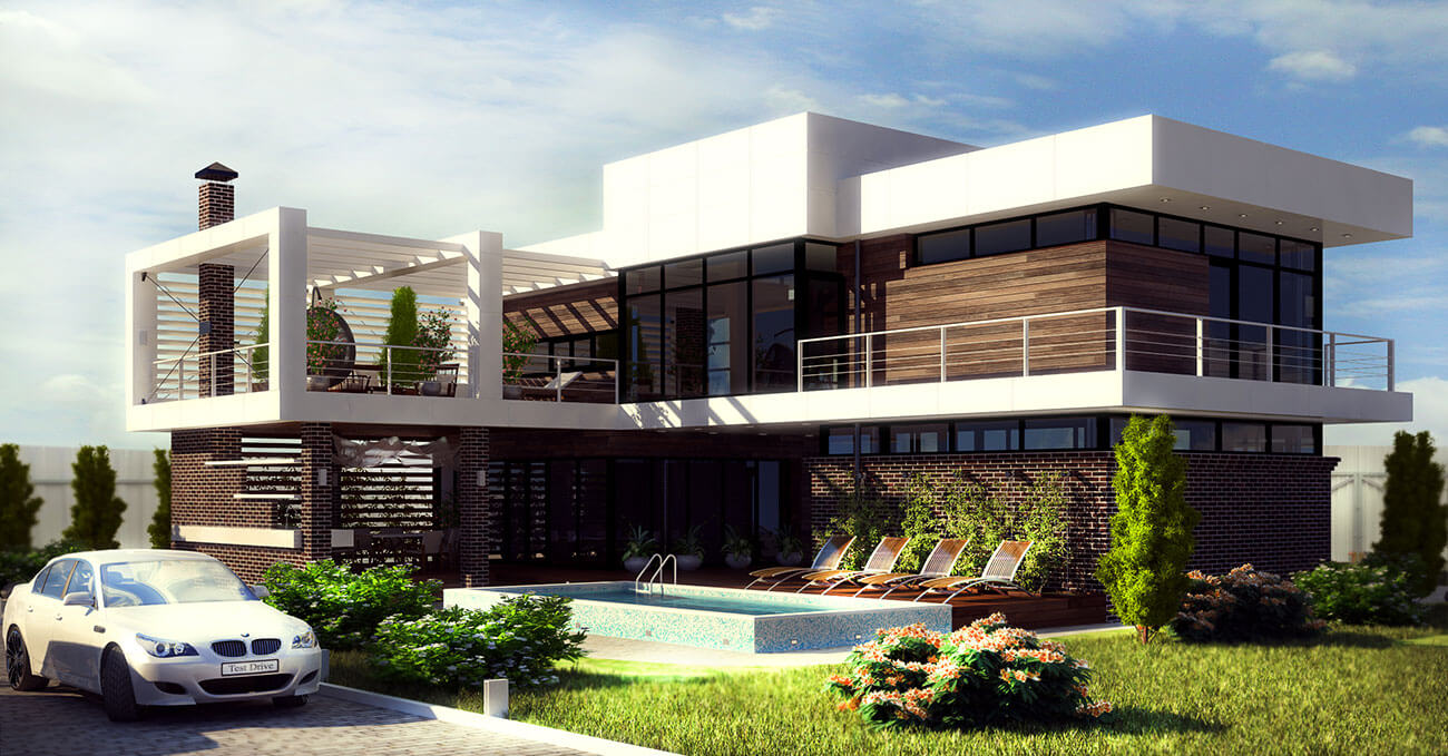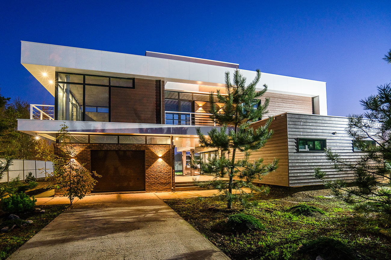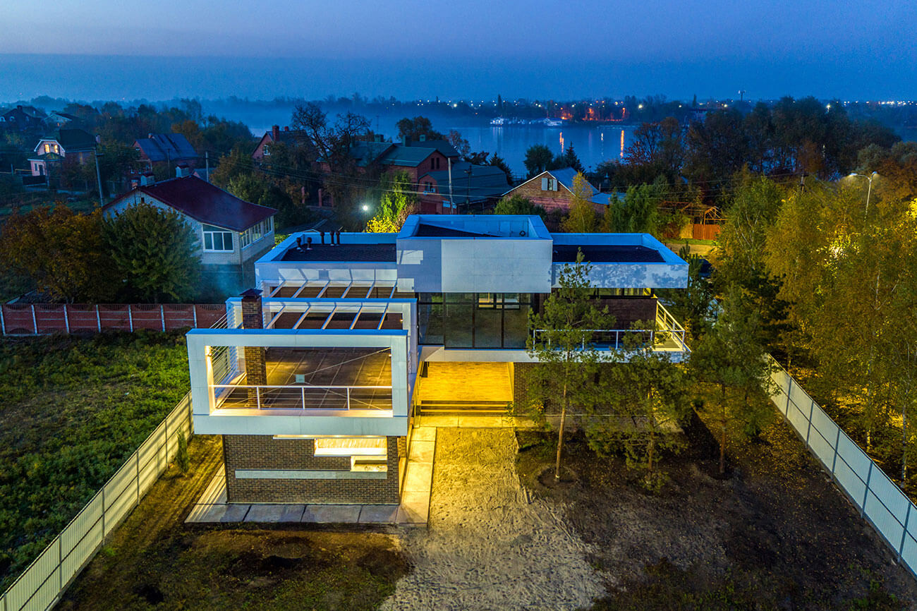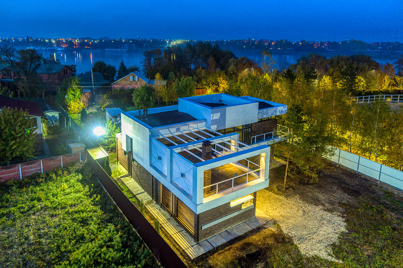 Участок располагается практически вплотную к реке, поэтому у нас возникла идея подарить заказчикам восхитительные панорамные виды со второго этажа дома. Этим и объясняется максимальная легкость всех решений, поддержанная корабельной тематикой. Дом двухуровневый, находится в стадии реализации.