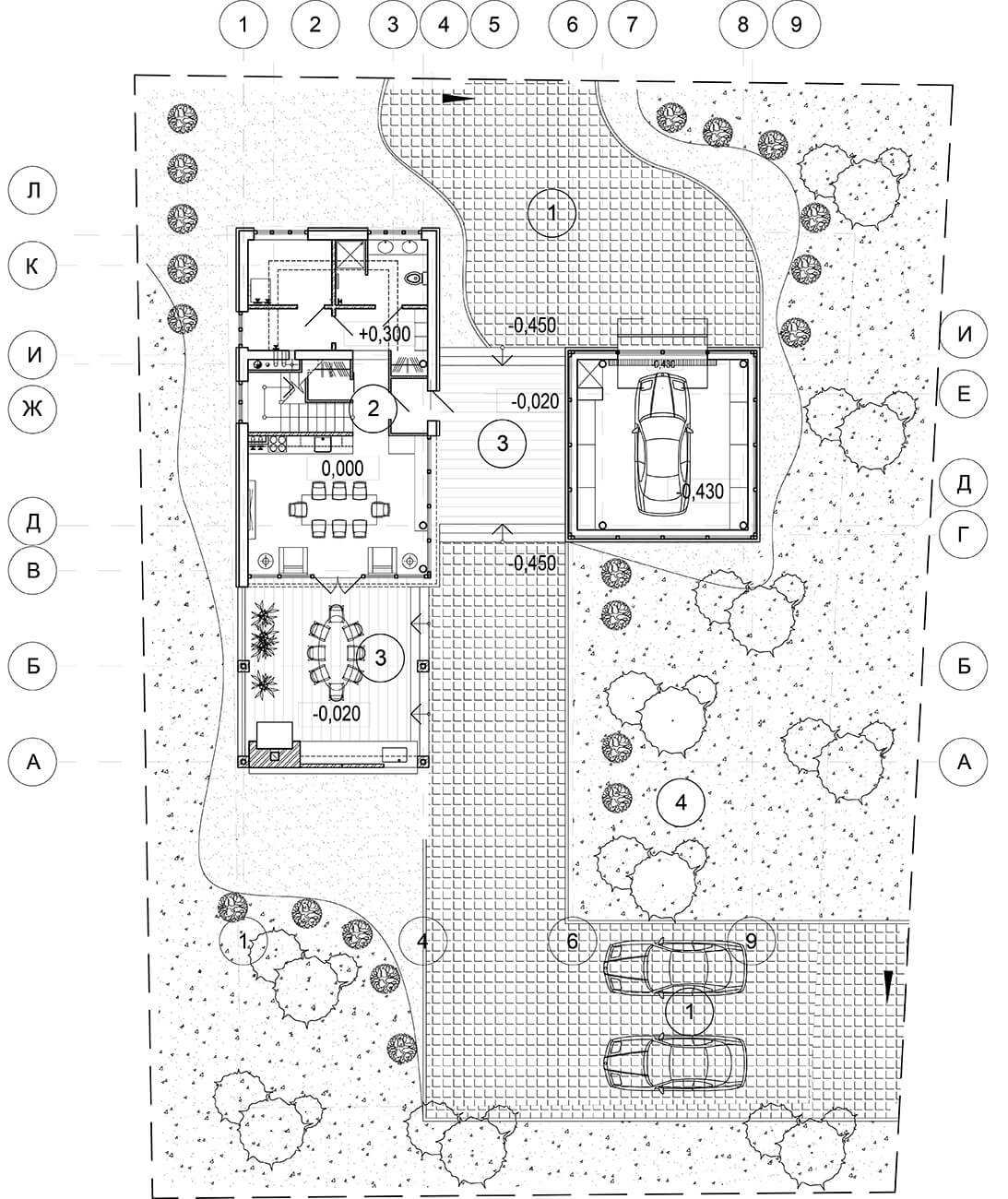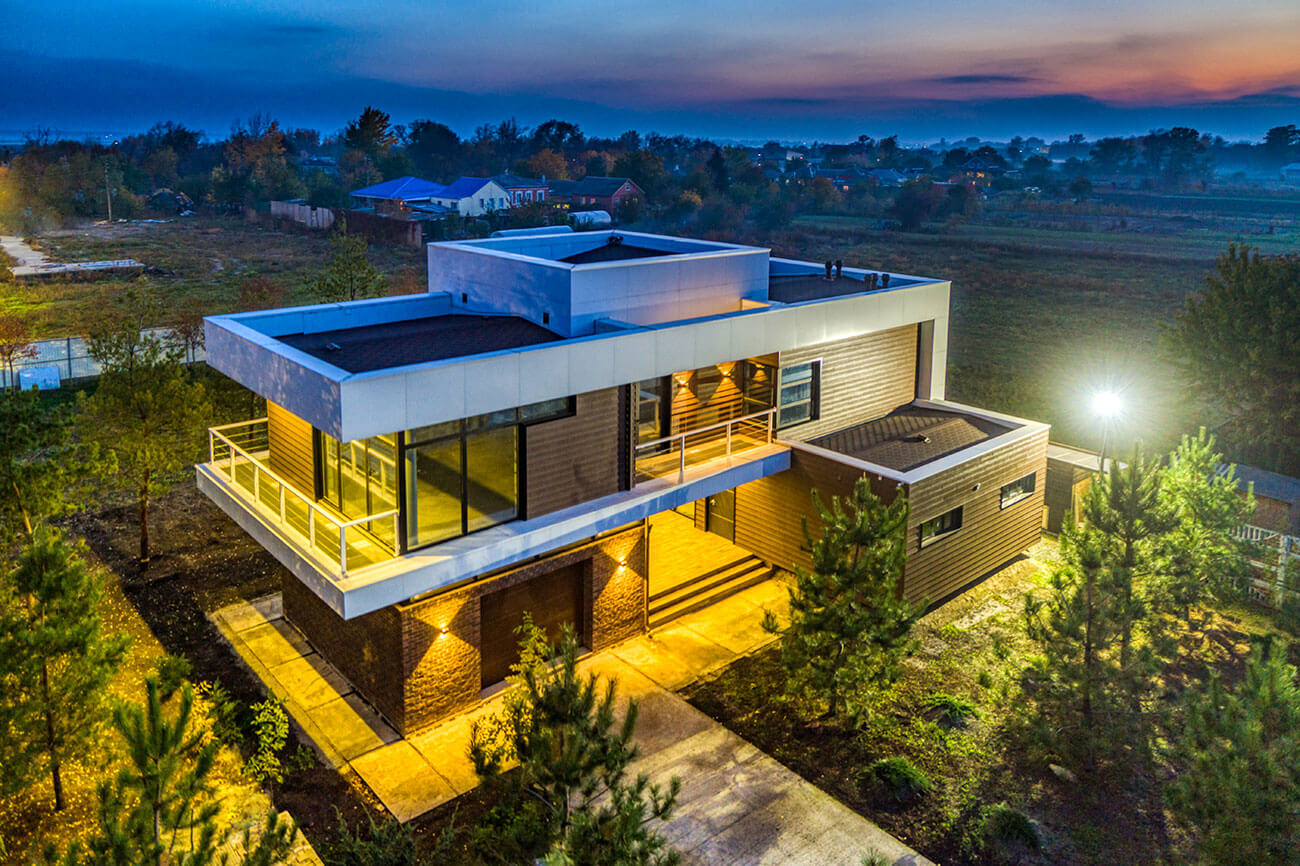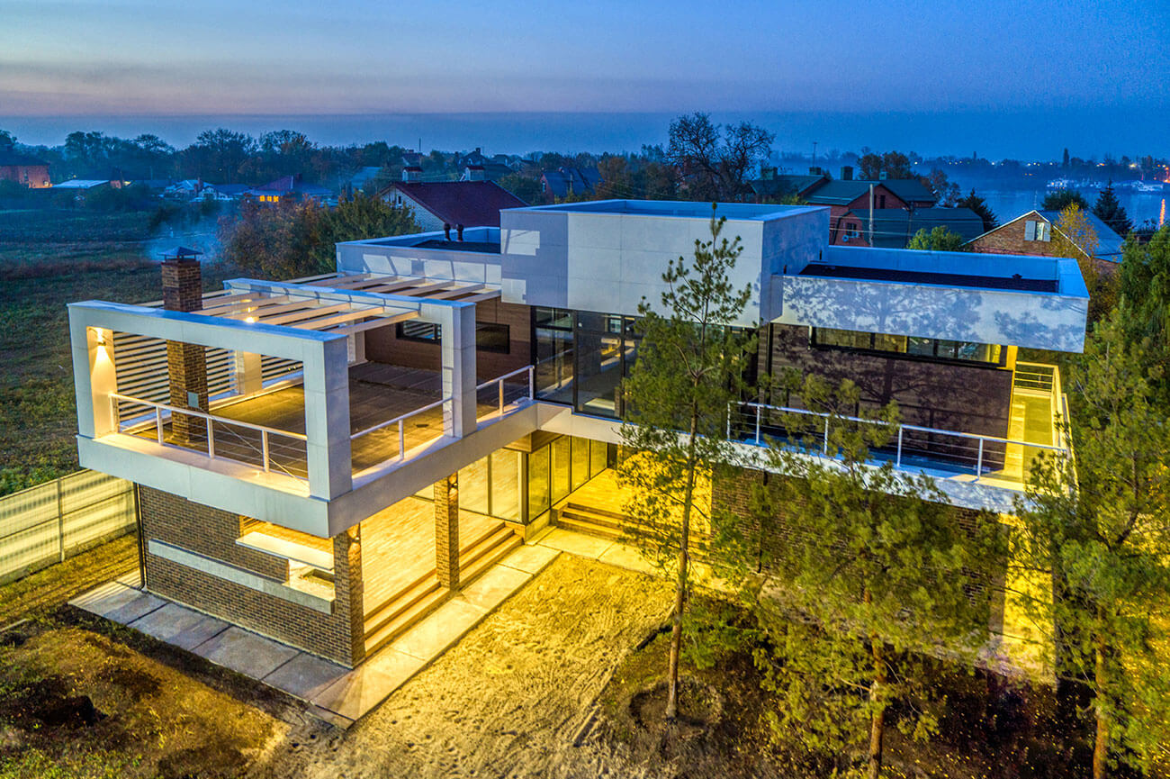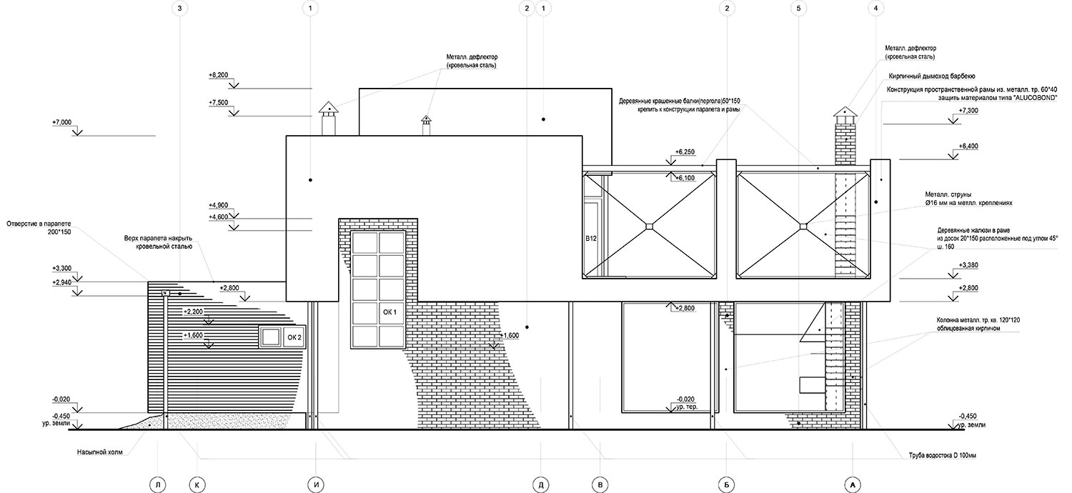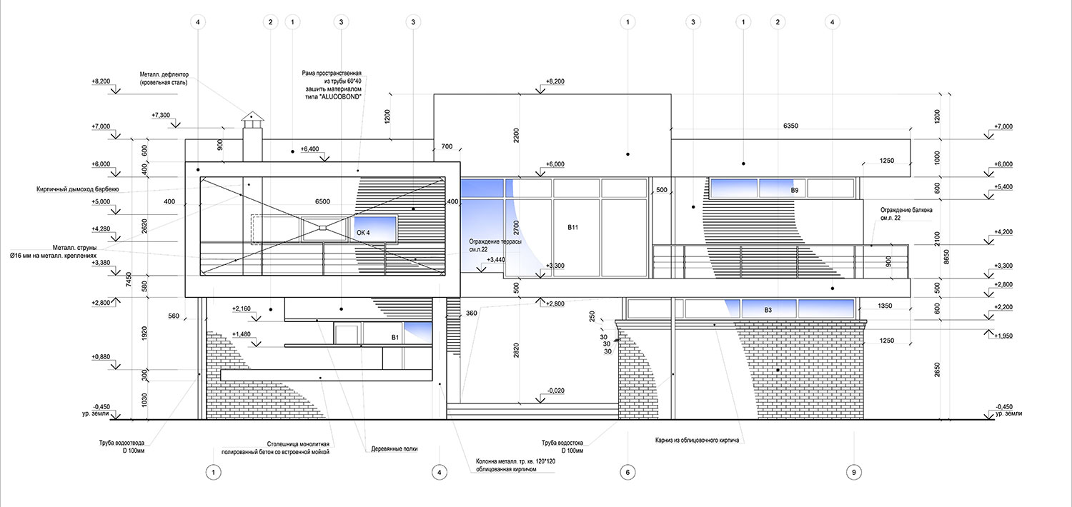 Монолитный железобетонный ленточный фундамент, монолитный железобетонный каркас колонн и перекрытий. Стены из гипсобетонных блоков, облицованные композитными панелями с использованием деревянных вставок в сочетании с состаренным бельгийским кирпичом ручной формовки. Плоские эксплуатируемые крыши. Алюминиевые витражи, террасная доска.