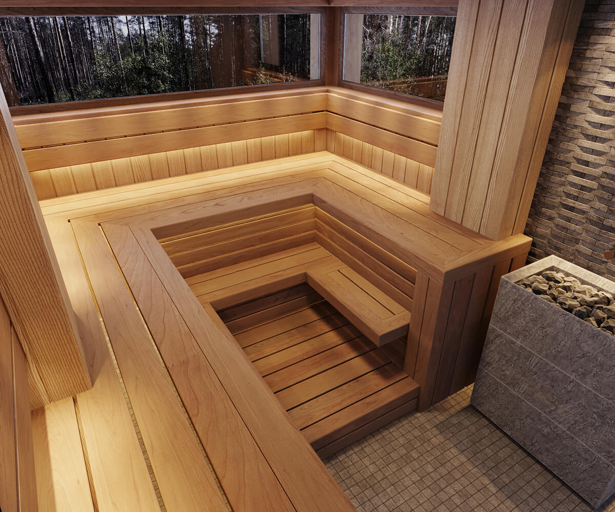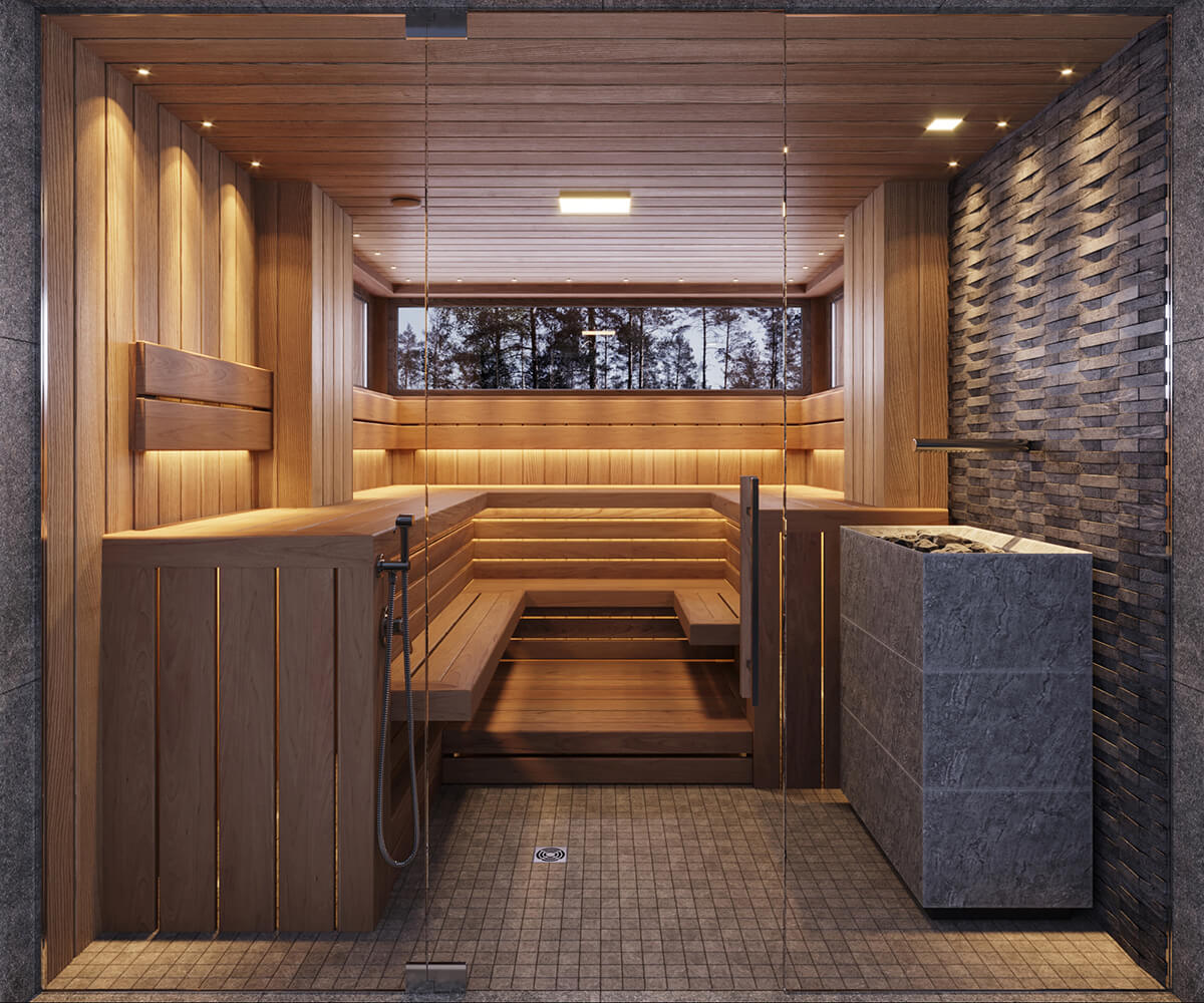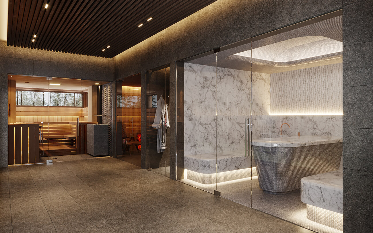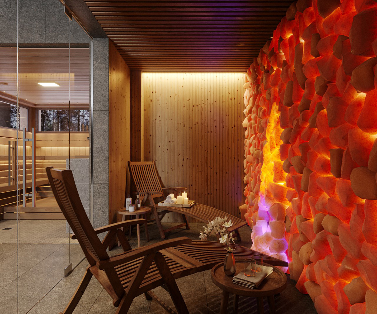 В соляной комнате в отделке используются деревянные 3D-панели финского производства. Все помещения термальной зоны оборудованы системами автоматической подачи воды с ароматом на камни в сауне, соляного раствора с ароматом — в соляной комнате и пенного раствора — для массажных процедур в хаммаме.