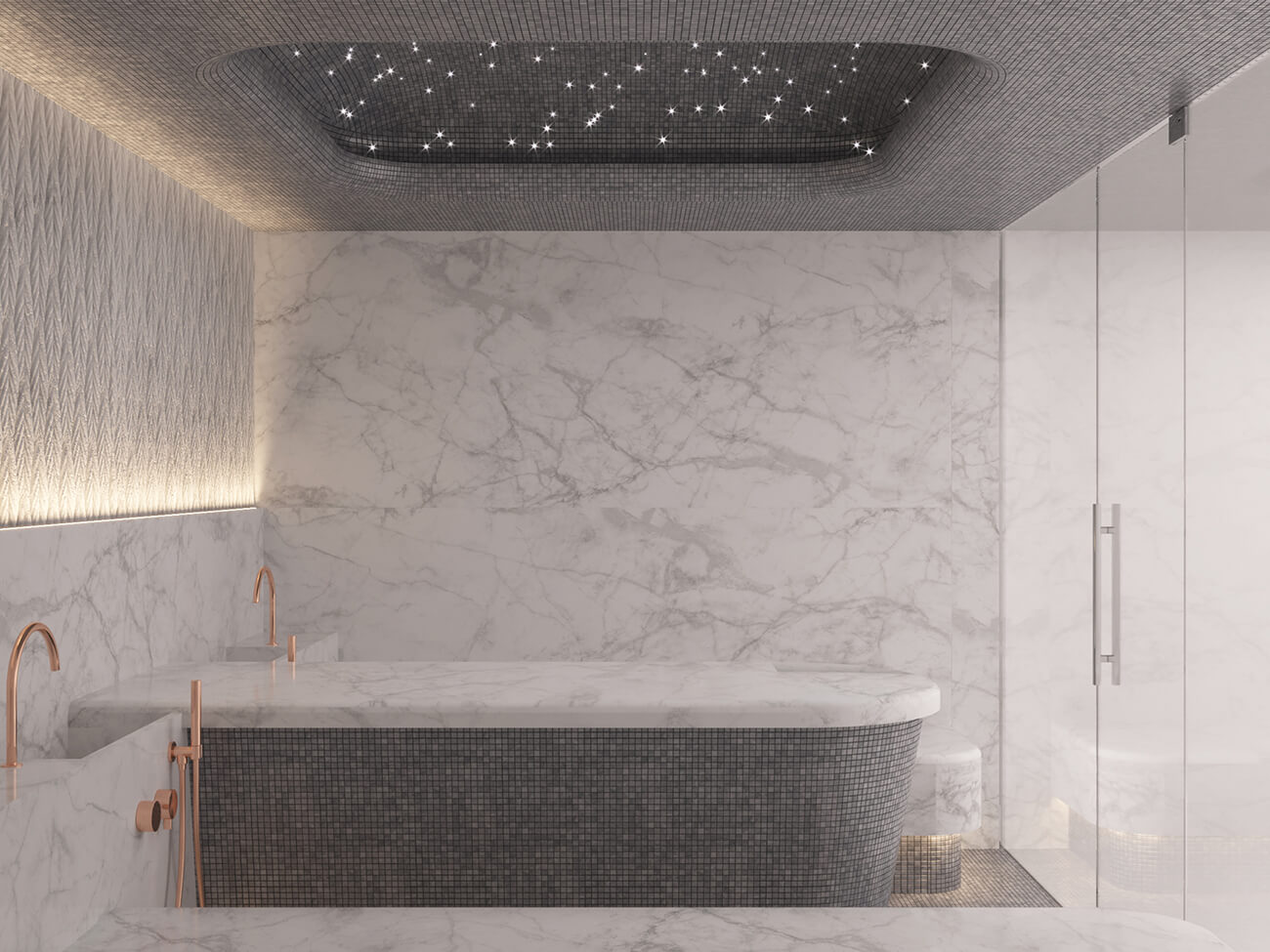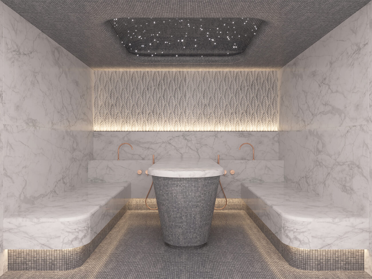 В отделке хаммама используется натуральный камень, основным акцентом является 3D-панно компании Lithos Design (Италия).