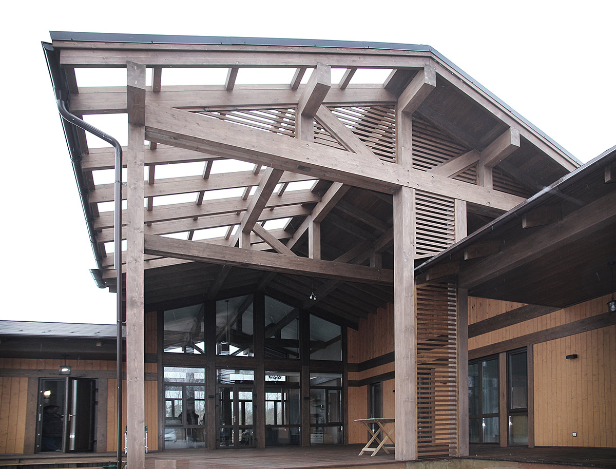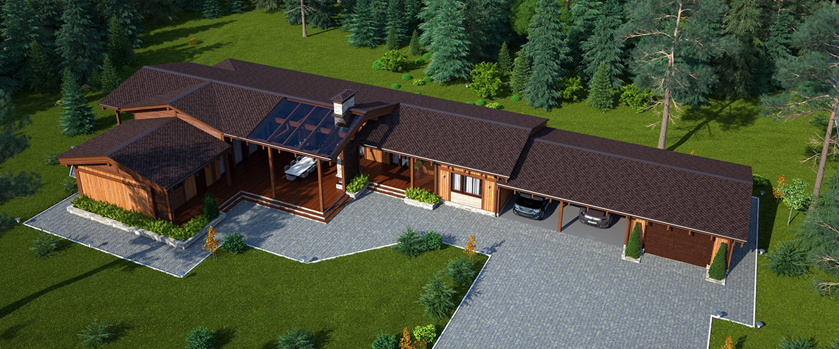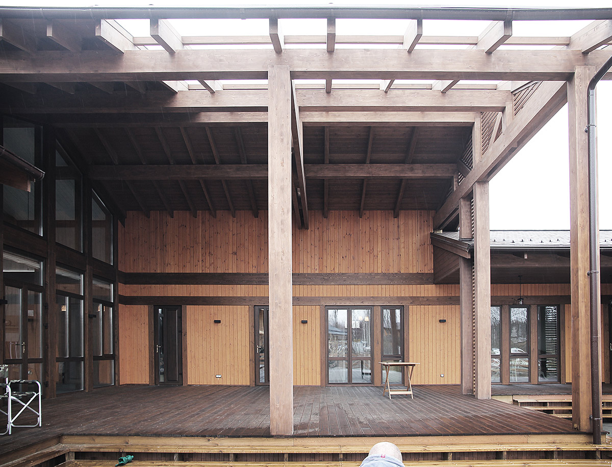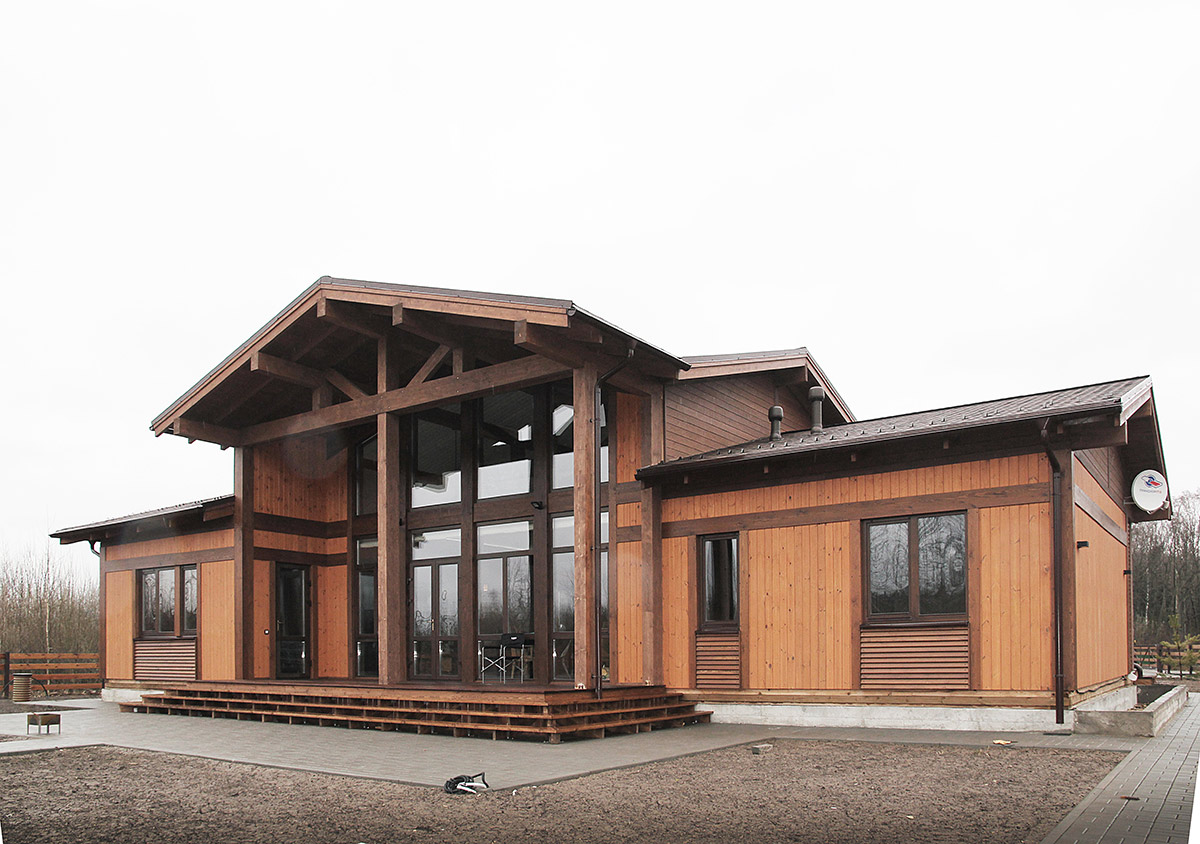 Идея проекта — гармоничное созвучие материала и архитектуры, человека и природы. На него работают как просторная общая терраса, где хозяева и гости могут вместе провести вечер, так и приватная часть террасы с выходом из спальни хозяев. Эту идею поддерживает многофункциональная основная двусветная гостиная. В гостевой части дома предусмотрено все для короткого или более длительного визита гостей. Гостиная с мини-кухней, две спальни, собственный санузел с ванной. Дом имеет современную сауну, навес для автомобилей и гараж для катера, который может использоваться для любых хозяйственных нужд.