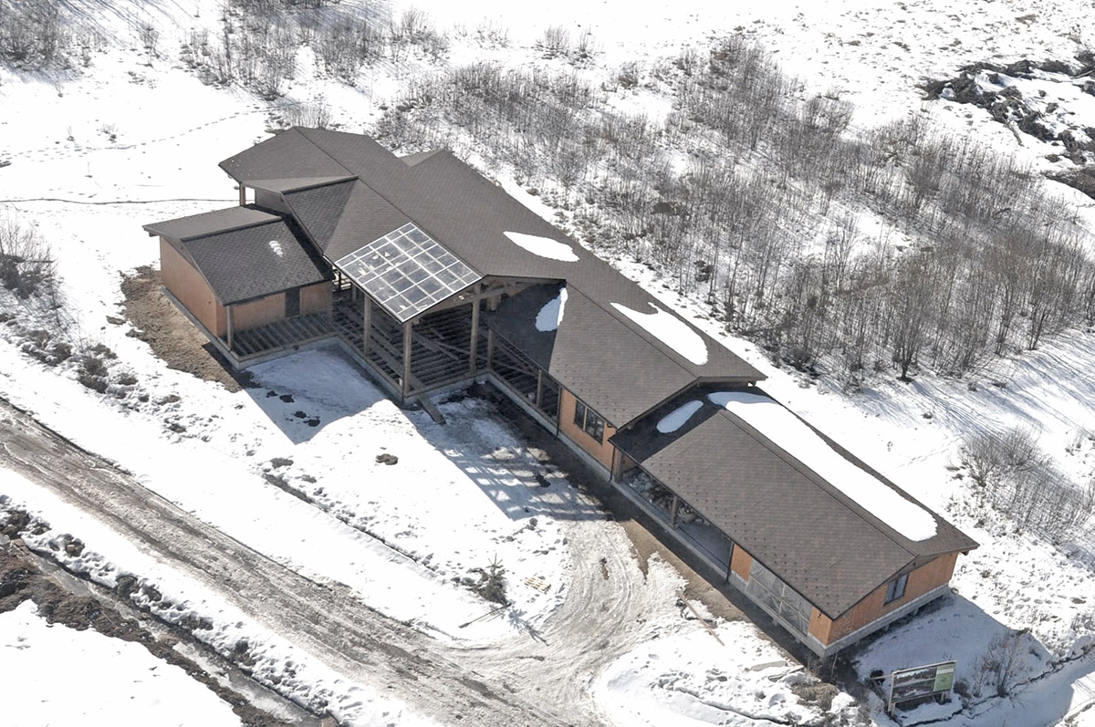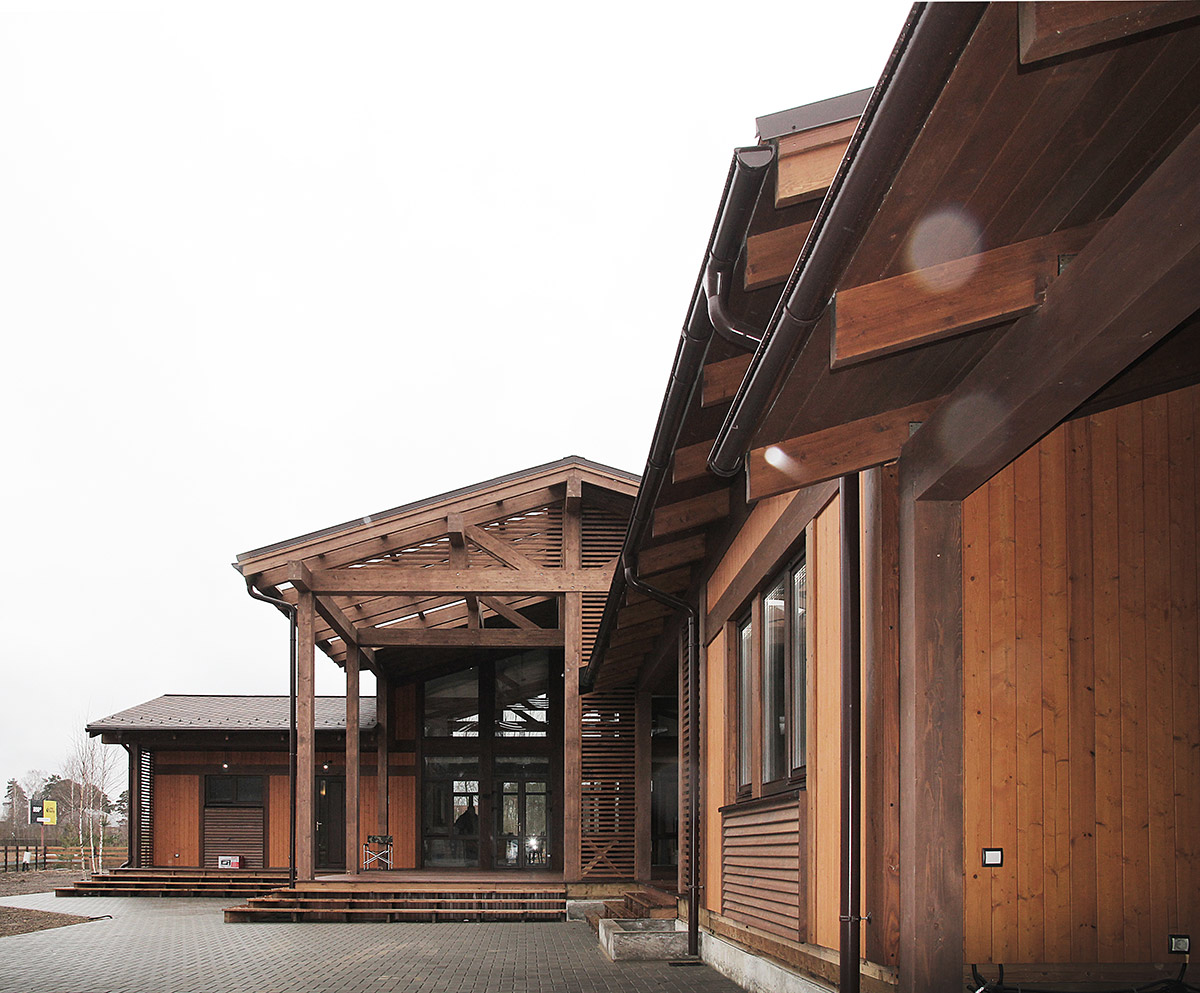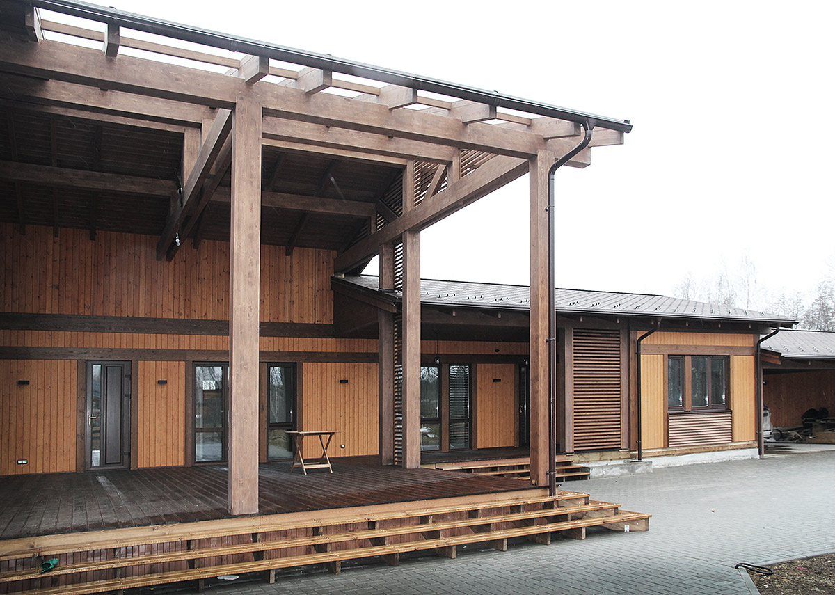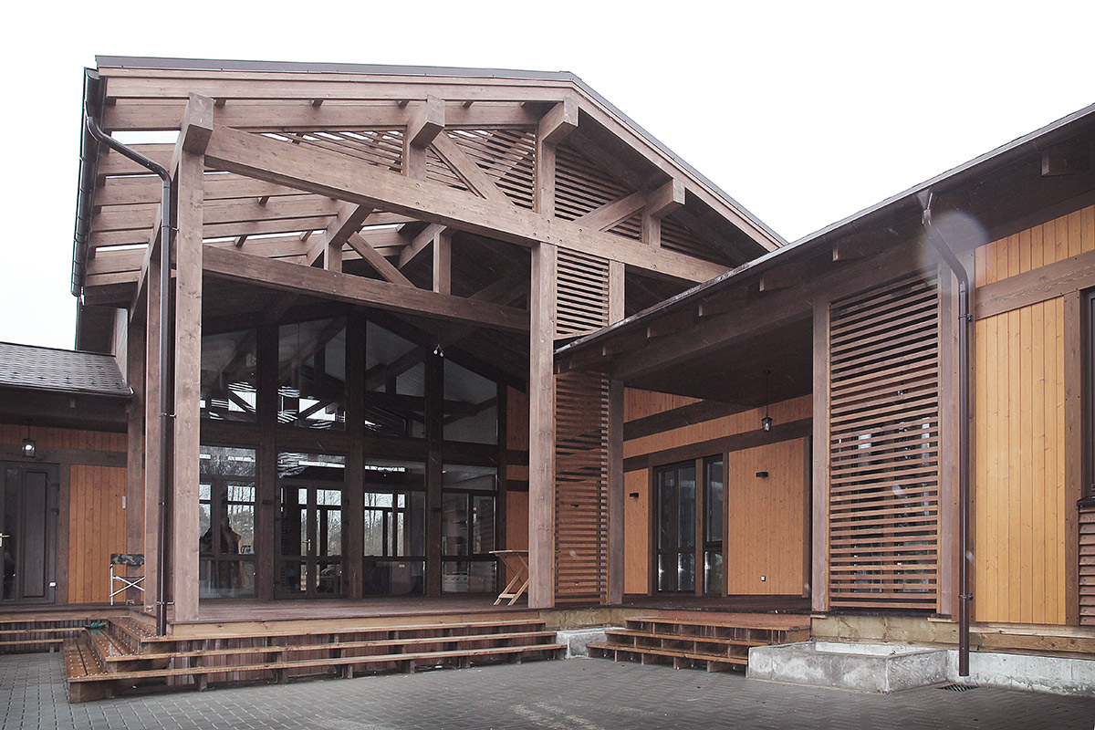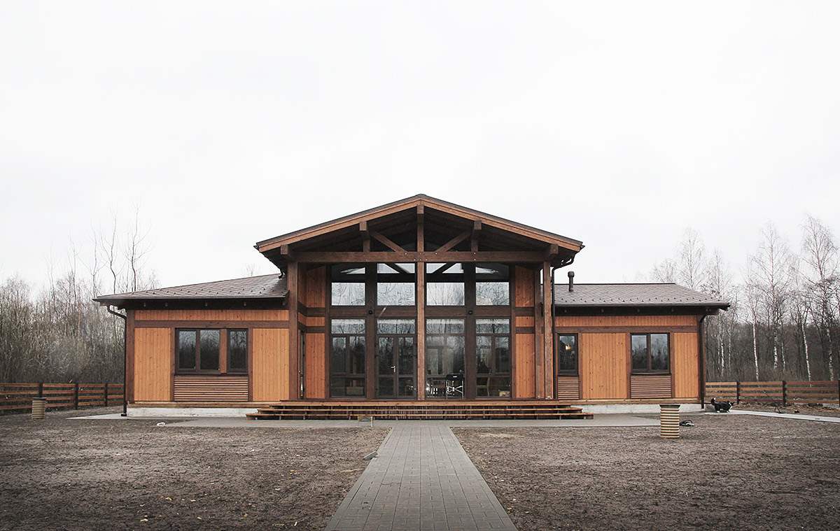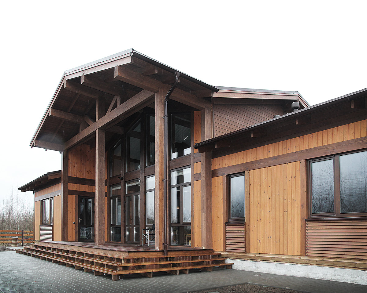 Экологичный, комфортный и функциональный загородный дом скомпонован из нескольких строений. Основной дом, баня, гостевой дом, навес и гараж объединены в одном пятне застройки. Такое решение позволяет наиболее эффективно использовать площадь участка и реализовать индивидуальное времяпрепровождение семьи и гостей.