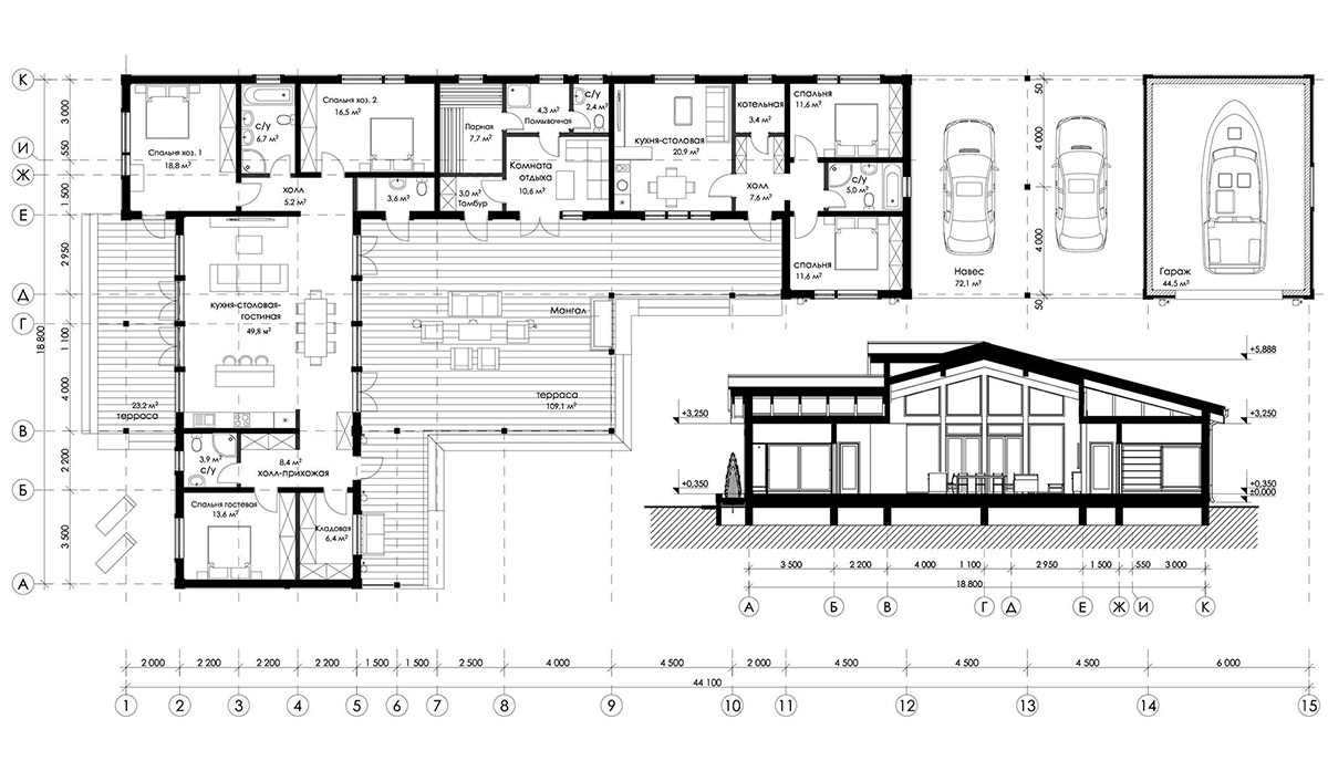 Площадь террас и навеса — 204,4 м²