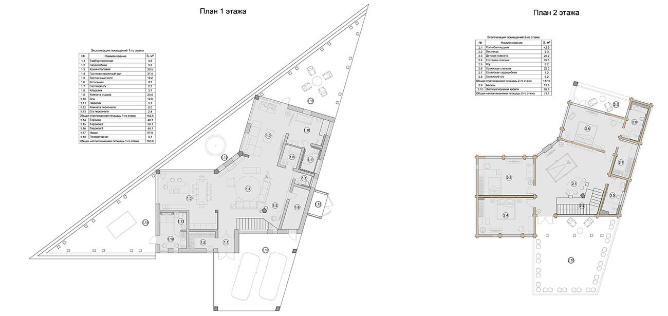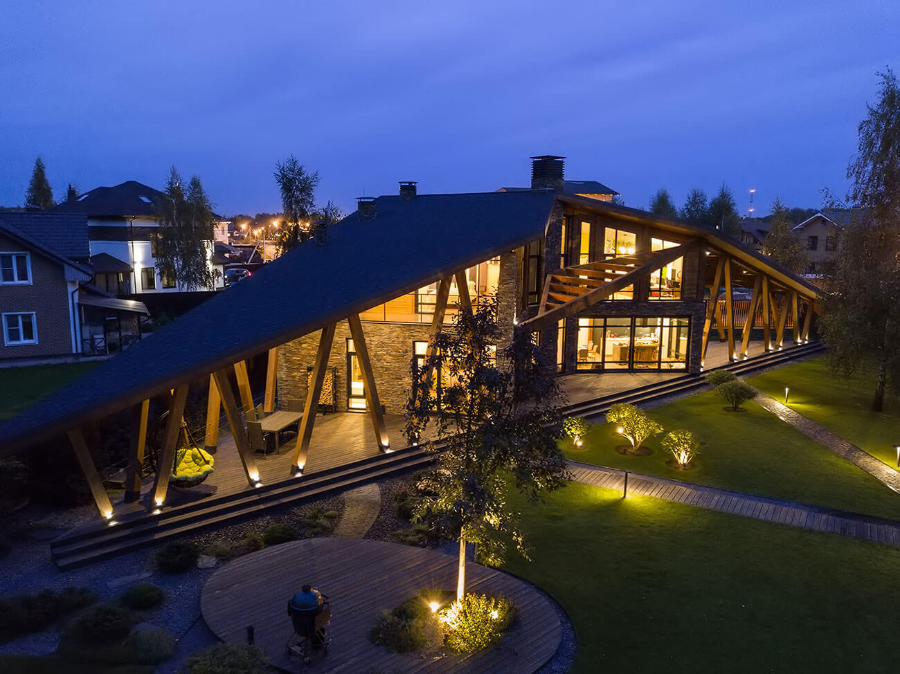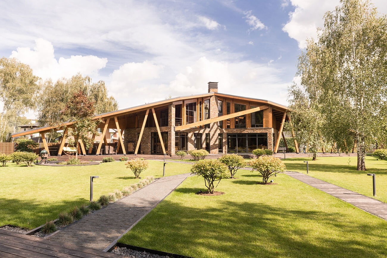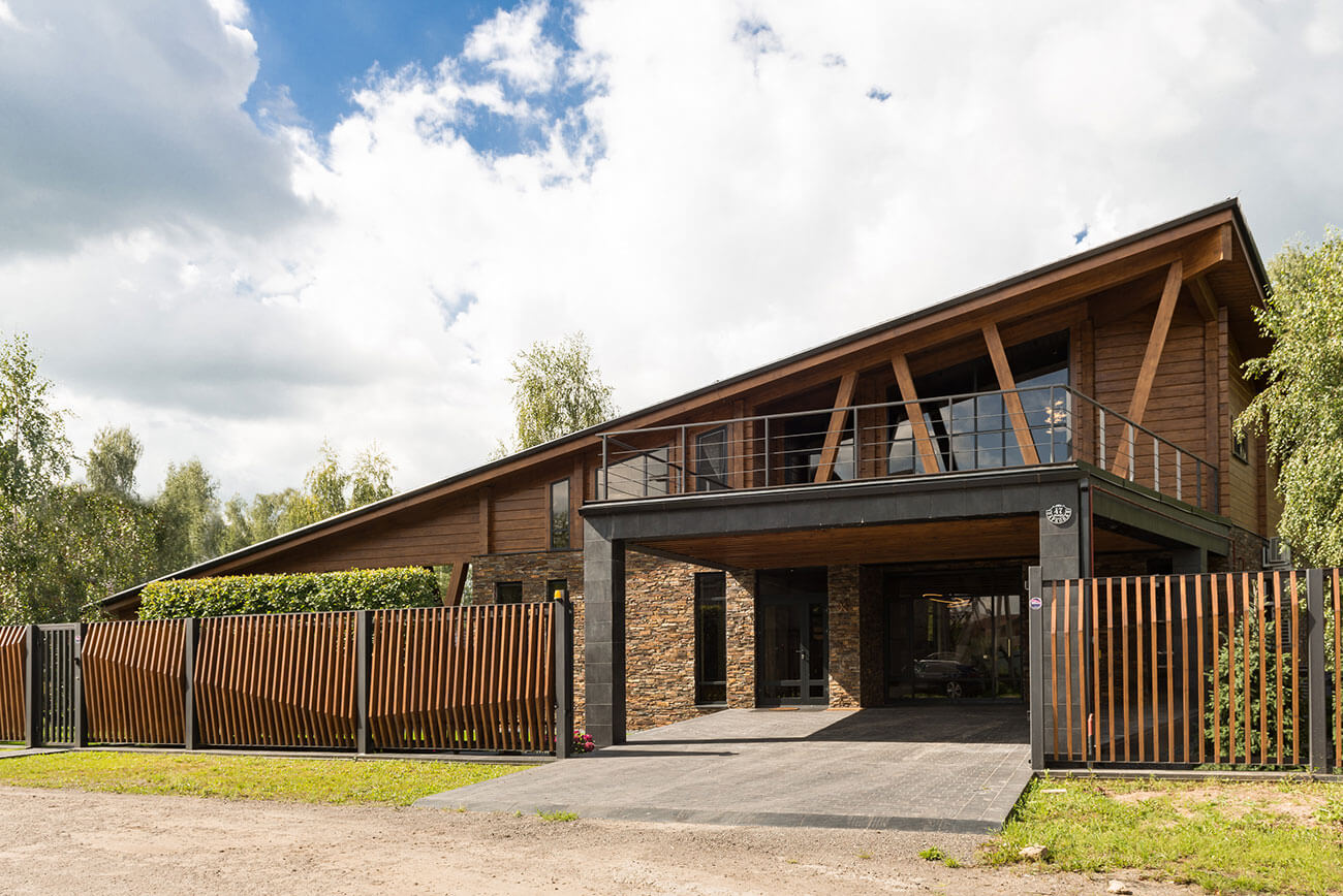 Второй этаж более приватный, со спальными блоками и просторным холлом с бильярдом. Деревянные стены второго этажа придают ощущение уюта и тепла спальням, а также задают особую загородную атмосферу во всем доме. Материал стен нижнего этажа позволяет использовать в наружной облицовке природный камень, а также дает возможность ввести в интерьер элементы современной отделки. Снаружи оба этажа дома объединяются единой кровлей, поддерживаемой фирменными «ногами».