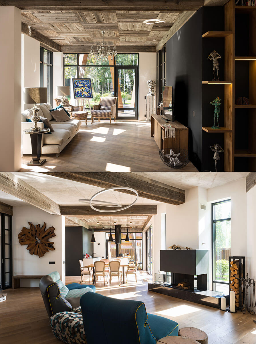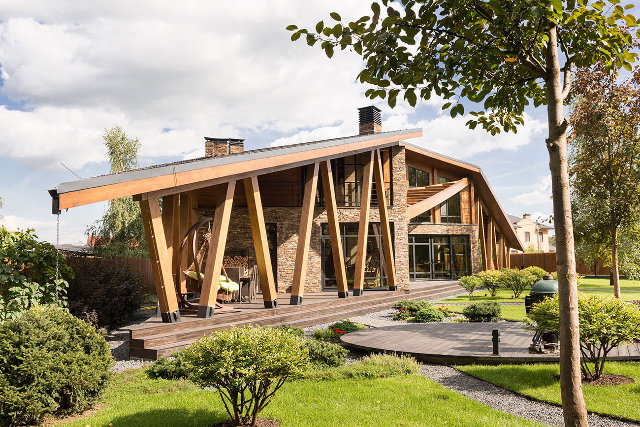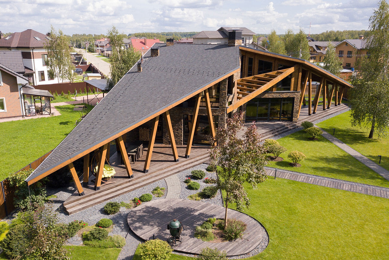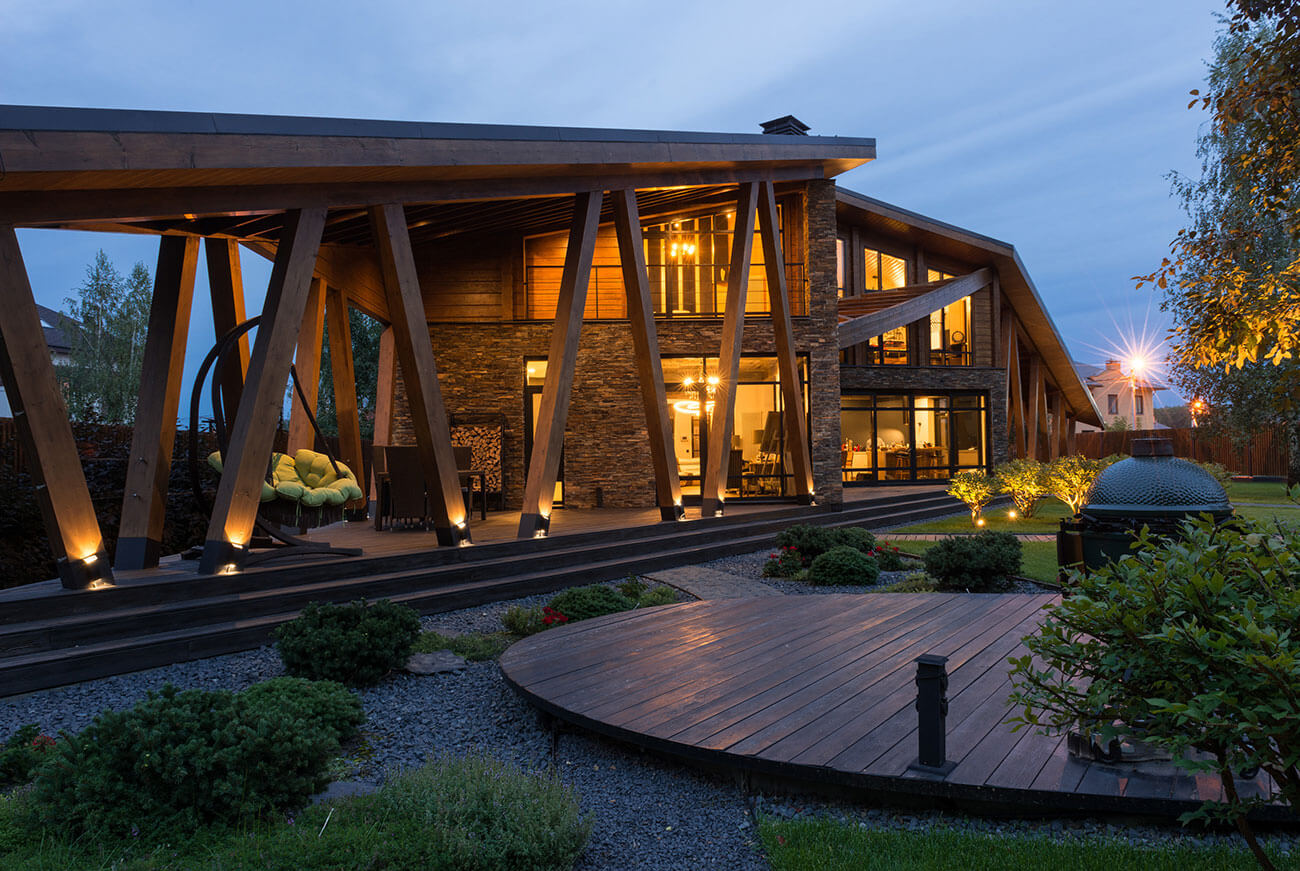 Интерьер дома нельзя привязать к какому-то конкретному стилю, здесь переплелось и соединилось много идей и вкусовых предпочтений. Вместе с тем все объединено и подчинено идее, которую задает общая архитектурная концепция. На участке помимо дома расположена беседка оригинальной архитектуры. Она органично погружена в лесной ландшафт и своей необычной формой как бы отвечает дому. Находясь в беседке, можно любоваться архитектурой дома и ландшафтом участка. Завершает и объединяет композицию всего участка оригинальный забор. С лицевой стороны он имеет «3D-эффект», перекликающийся с архитектурой дома. С разных точек подъездной дороги этот забор выглядит по-разному, приглашая хозяев и гостей скорее зайти внутрь.