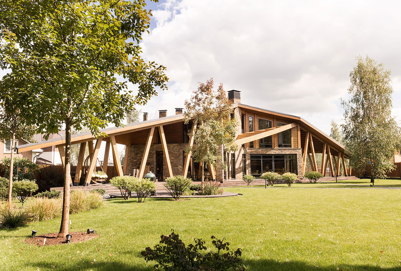 Частный жилой дом расположен на лесной опушке в одном из коттеджных поселков Московской области. Участок слегка неправильной формы, что отразилось на планировочном решении и повлияло на общую архитектурную концепцию дома. Конструктивно дом выполнен по комбинированной технологии: первый этаж — из теплых керамических блоков в сочетании с монолитным железобетоном, второй — из клееного бруса. Межэтажное перекрытие монолитное, что позволяет хорошо звукоизолировать этажи друг от друга.
