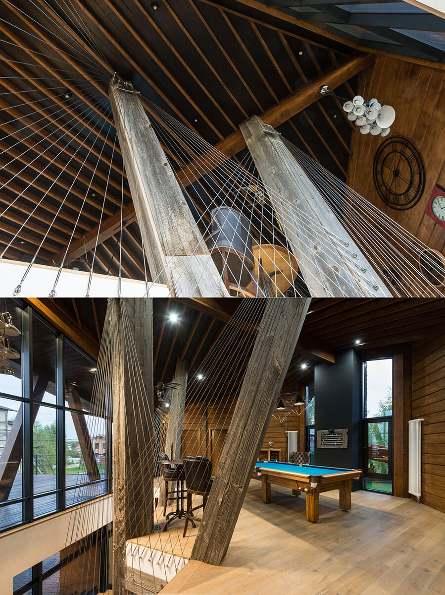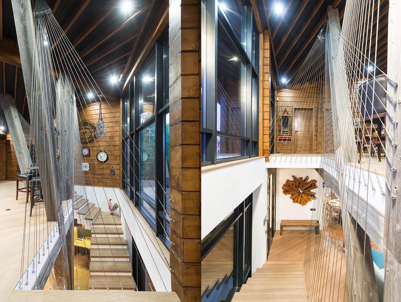 Необычная форма крыши во многом определяет интерьер всего второго этажа. Центральное ядро дома образует камин с трубой, проходящей через весь фасад, и лестница с необычным ограждением из тросов. Каминная труба связывает на фасаде первый этаж со вторым и выходит легкой доминантой на кровле. Ограждение лестницы из тросов объединяет этажи внутри дома и является главной фишкой всего интерьера. Тросы смотрятся максимально воздушно и не разделяют пространство, как традиционные варианты ограждений. При этом за счет хорошего натяжения, создается функциональное и достаточно безопасное ограждение.