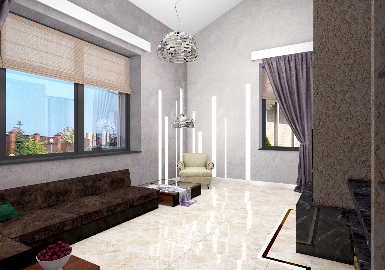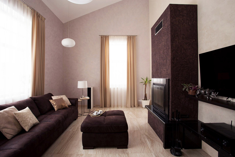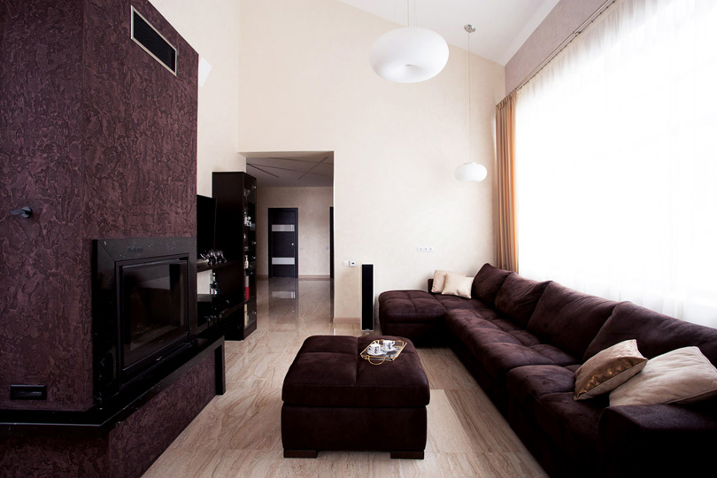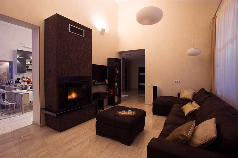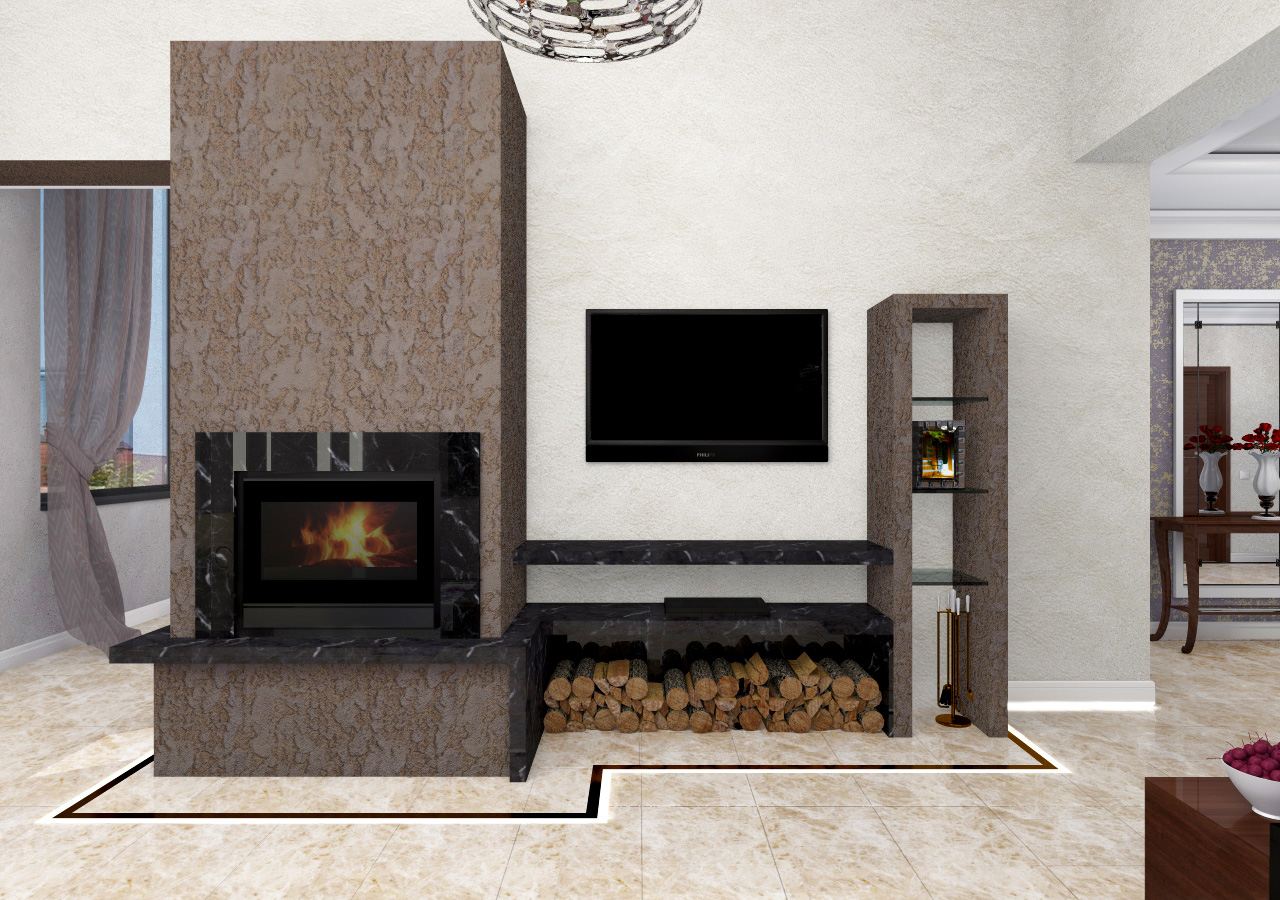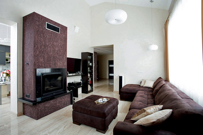 Главная центральная роль в этом коттедже отведена величественному и современному камину. Мы использовали в его обрамлении декоративную штукатурку с глубоким выразительным рисунком, а также не менее выразительный мрамор Nero Marquina.