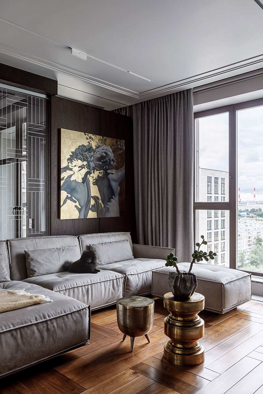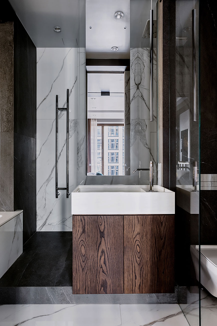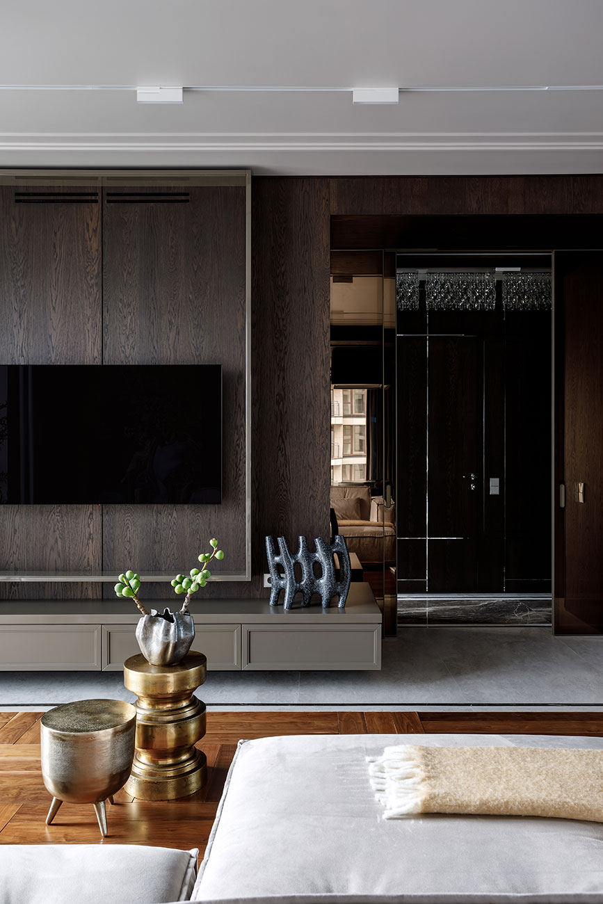 В отделке широко использован натуральный камень, крупноформатный керамогранит, паркетная доска, панели из дерева и вставки в виде латунных профилей.