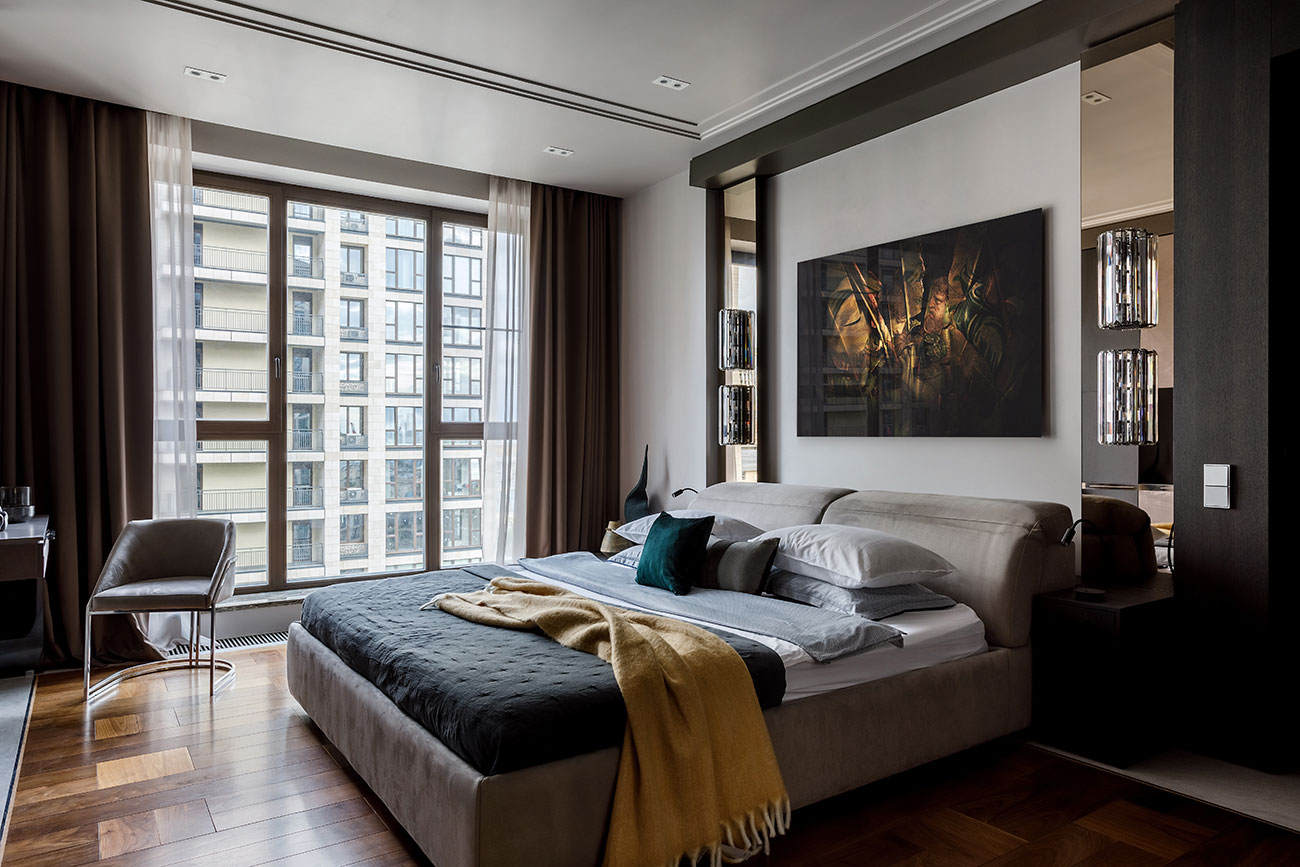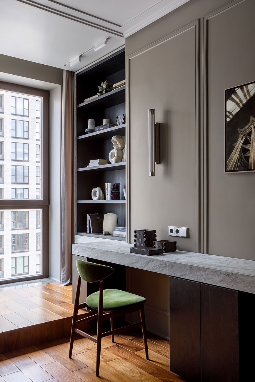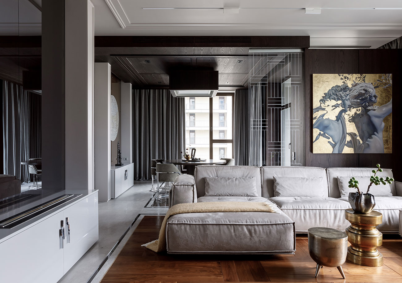 В отделке широко использован натуральный камень, крупноформатный керамогранит, паркетная доска, панели из дерева и вставки в виде латунных профилей.
