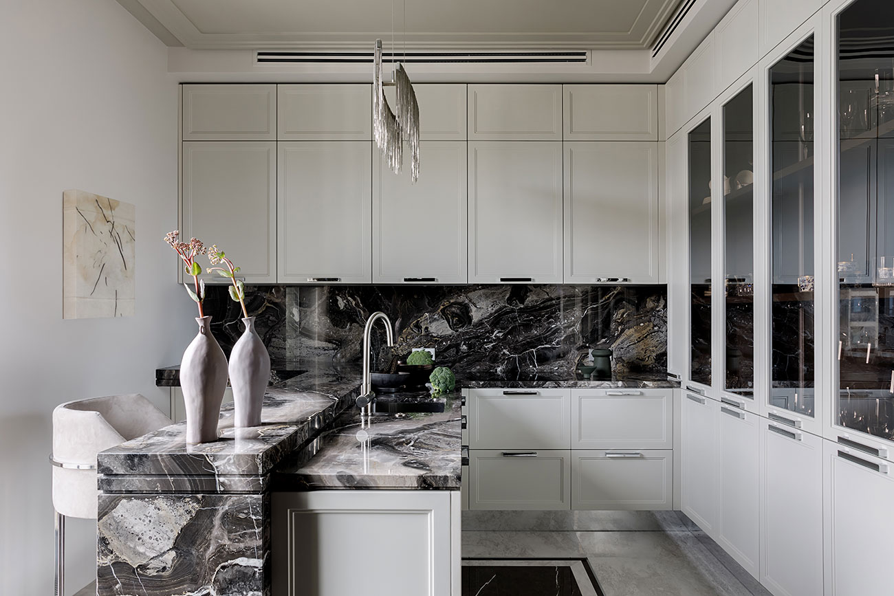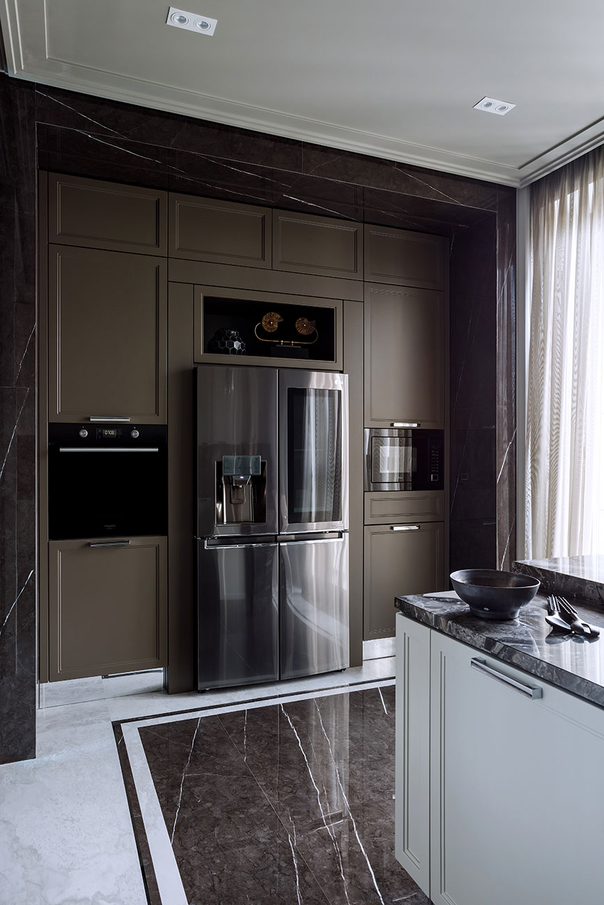 Кухня по заданию была спроектирована в отдельном помещении. Главным пожеланием в кухонной зоне было наличие острова, но небольшая площадь кухни не позволяла сделать остров в классическом понимании. Поэтому высокие колонки с холодильником и другой техникой были вынесены в отдельную нишу, облицованную камнем, напротив разместился кухонный «полуостров» с высокими, но неглубокими стеллажами для хранения посуды и бокалов. Вся композиция объединена двухуровневой столешницей из натурального камня со сложной геометрией торцевых стенок.