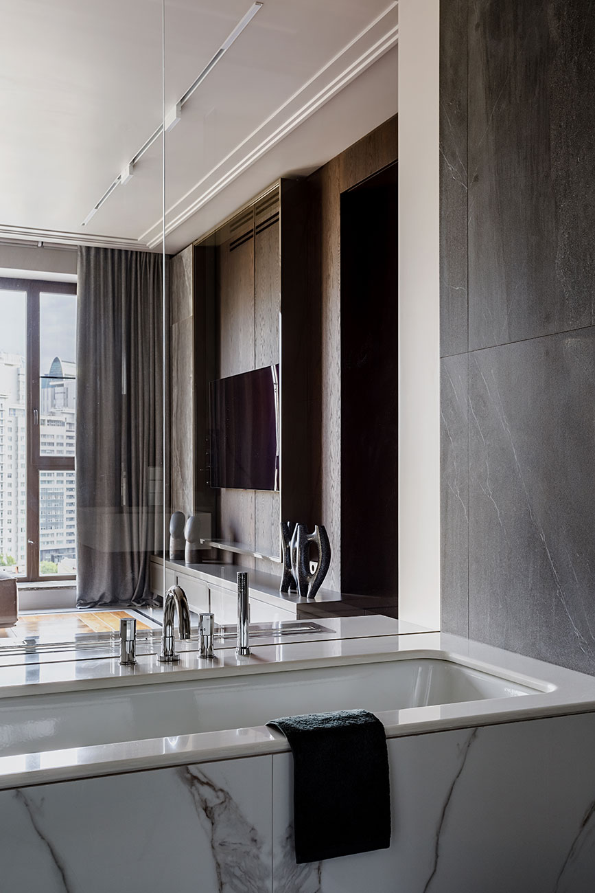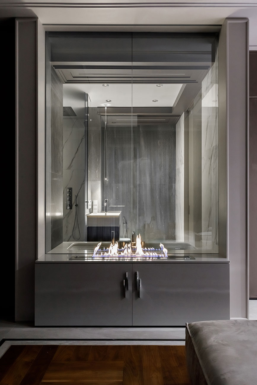 Использование стекла позволило открыть вид на живой огонь биокамина, ставшего центром притяжения гостиной и, кроме того, создающего фантастическую атмосферу во время приема ванны. В отделке этой зоны квартиры активно используется натуральный камень.