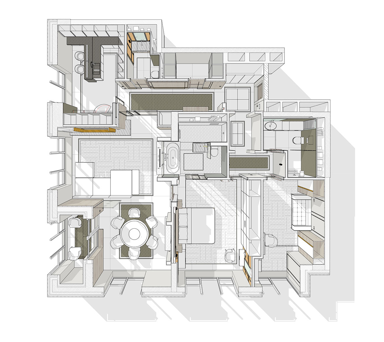 В приватной части квартиры предусмотрены системы хранения: гардеробные для верхней одежды, шкафы для обуви и сумок, технические шкафы и т.д. Все эти системы вписаны в геометрию помещений, благодаря чему имеют четко отведенное место и не бросаются в глаза.
