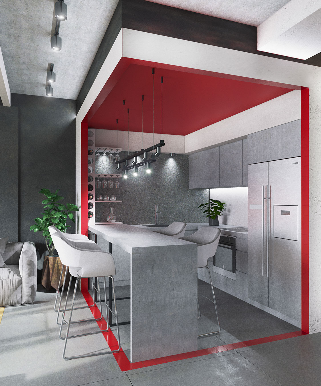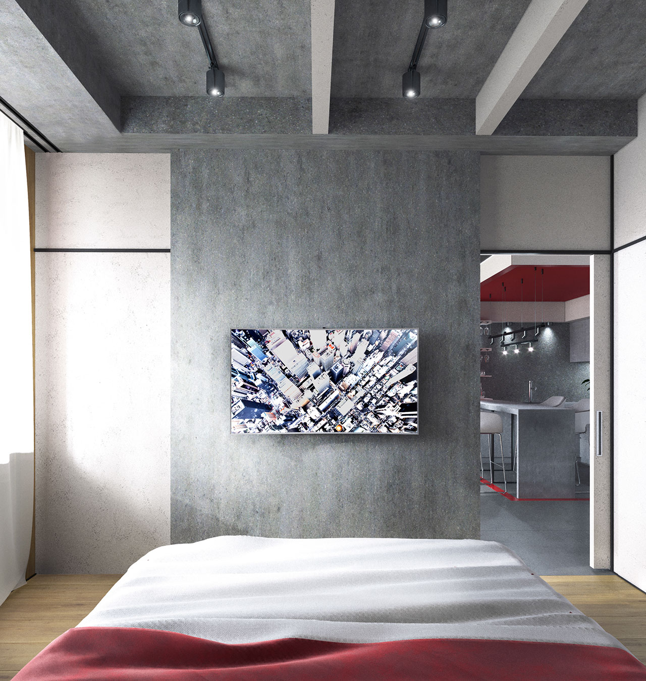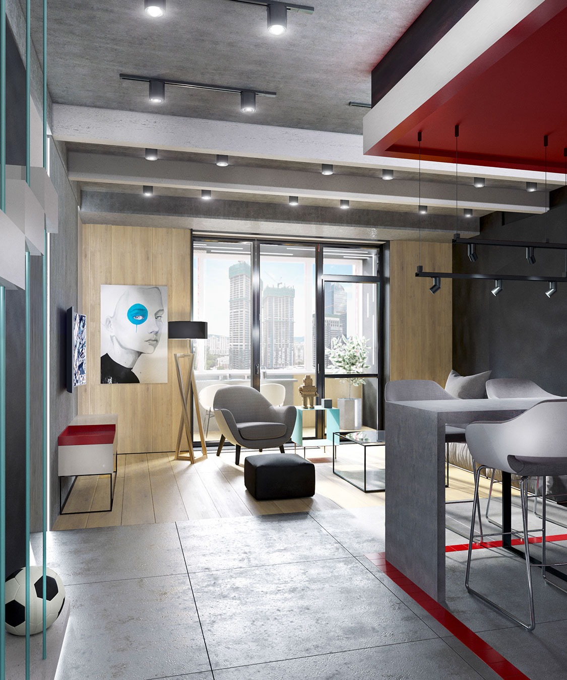 Фактурные материалы серых оттенков (бетон, камень) контрастируют с выкрашенными белыми и черными поверхностями стен и балок на потолке. Главный цветовой акцент — «красный куб» в зоне кухни. При свободной планировке квартиры зонирование цветом оказалось удачной идеей.