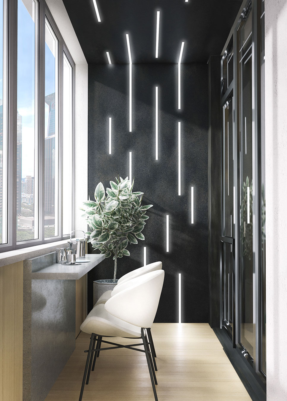 В интерьере отсутствует привычная обеденная зона со столом, так как для молодого владельца квартиры это не актуально, но при этом предусмотрена большая барная стойка для четырех человек, а также столик на закрытой лоджии, с которой открывается великолепный вид на Москву.