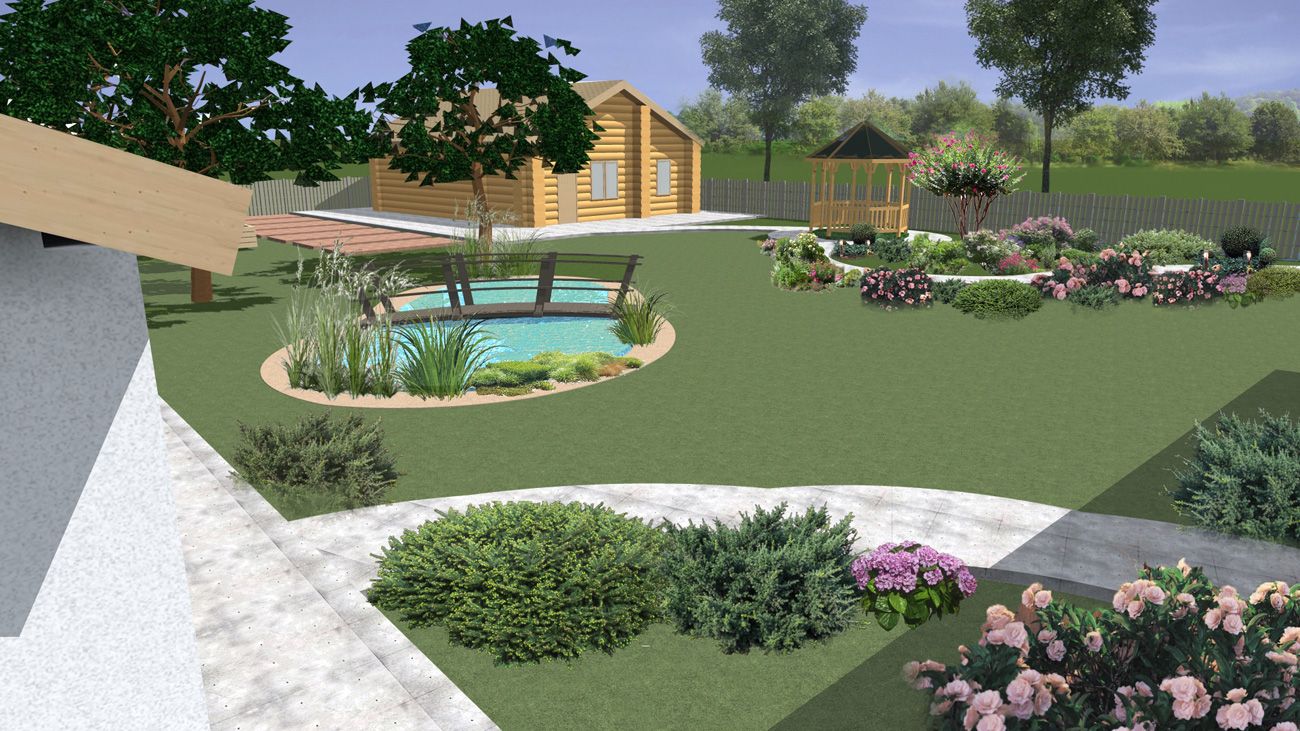 В другом конце участка находится деревянная баня с открытой террасой. Для отделки напольного покрытия использована террасная доска. С этого ракурса открывается вид на внутренний двор с садом, беседкой и декоративным водоемом. Баня связана с другими постройками с помощью дорожек изломанной формы, вдоль которой растут многолетние кустарники (можжевельник казацкий и горизонтальный, можжевельник лежачий, гортензия, спирея, роза парковая, роза плетистая разных видов и цветов, туя, пионы), цветы однолетние и многолетние (герань, хризантемы, очиток, мускари, ирисы, хосты ), декоративные деревья (сирень).