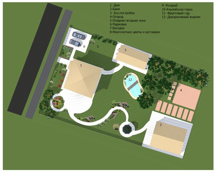 Проект имеет диагональную ось, по которой располагаются все необходимые строения на территории: парковка, дом, баня. Все остальные зоны зависят от диагонали и связаны между собой дорожками из твердого покрытия и газоном.