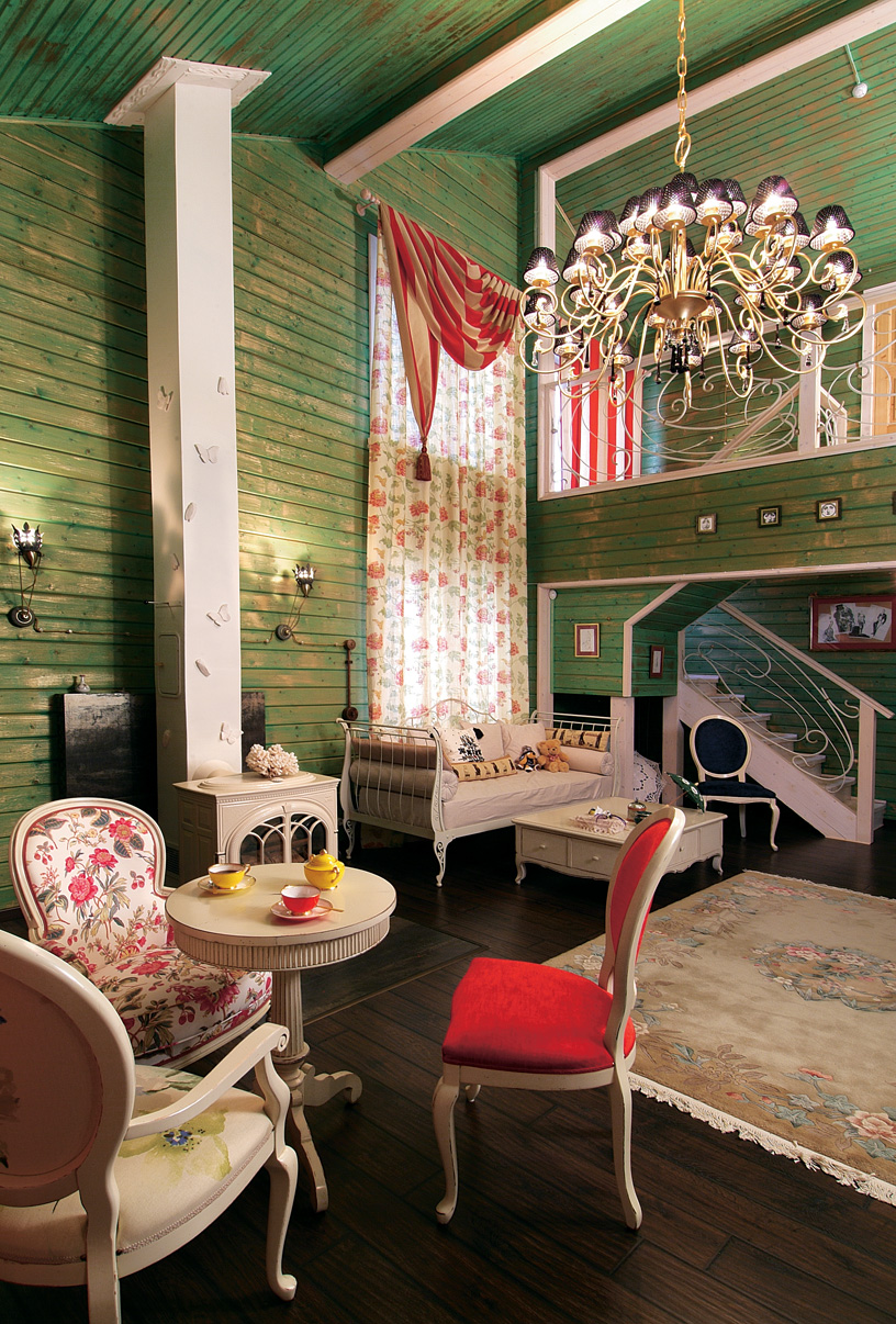 В текстильном декоре интерьера доминирует цветочная тема. Обивка стульев, занавески и ковер, постеленный посередине гостиной, объединены флористическими узорами. В общую тональность вписана роскошная итальянская люстра, витые узоры которой перекликаются с изящными перилами лестницы и изгибами цветочных завитков текстиля.