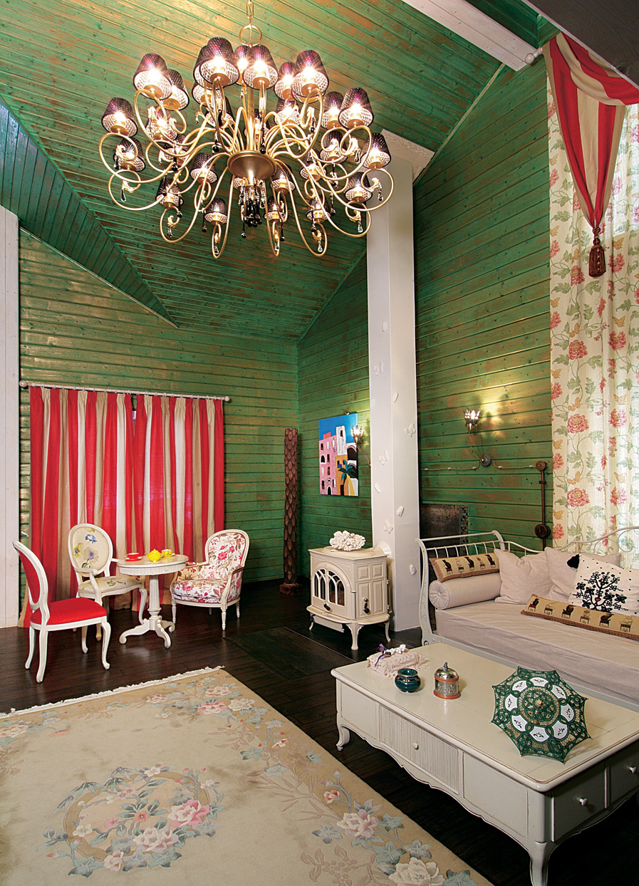 Основную часть первого этажа занимает двусветная гостиная, объединенная с кухней-столовой. Обстановка отсылает к традициям французских интерьеров XVIII–XIX веков. Ведущий цвет в оформлении высоких стен — насыщенный травяной. Он позволяет обыграть предметы мебели, подчеркнув яркость и нежную красоту белого лака.