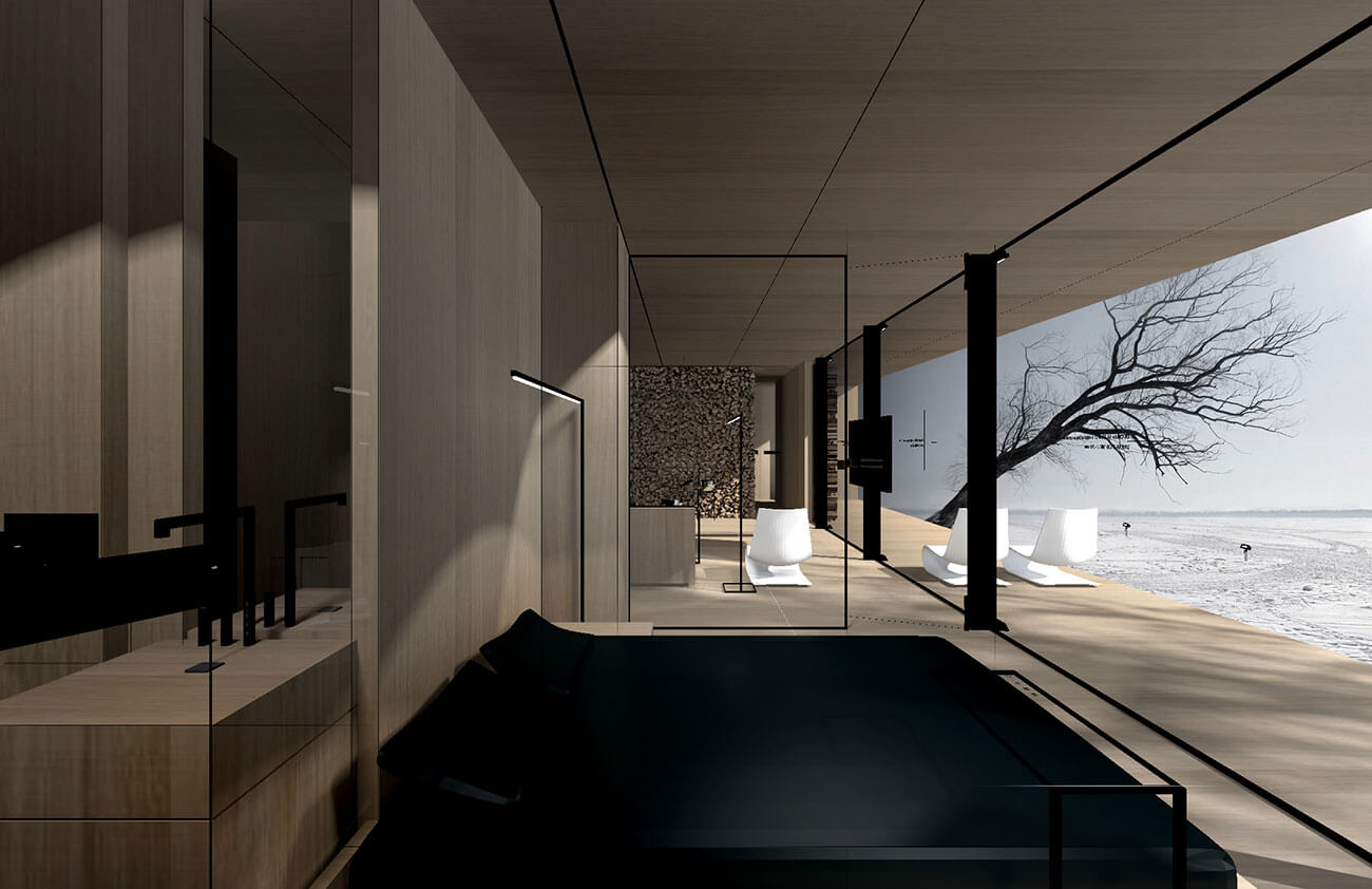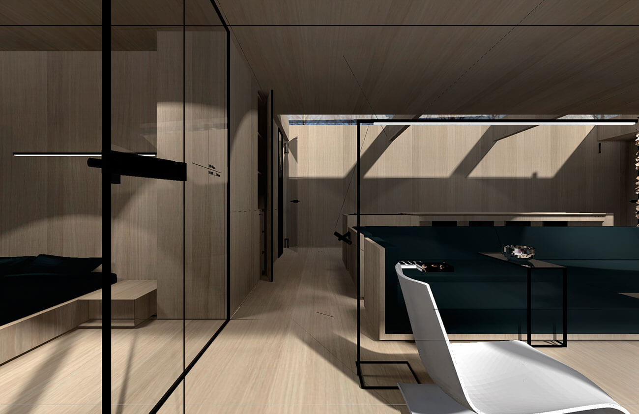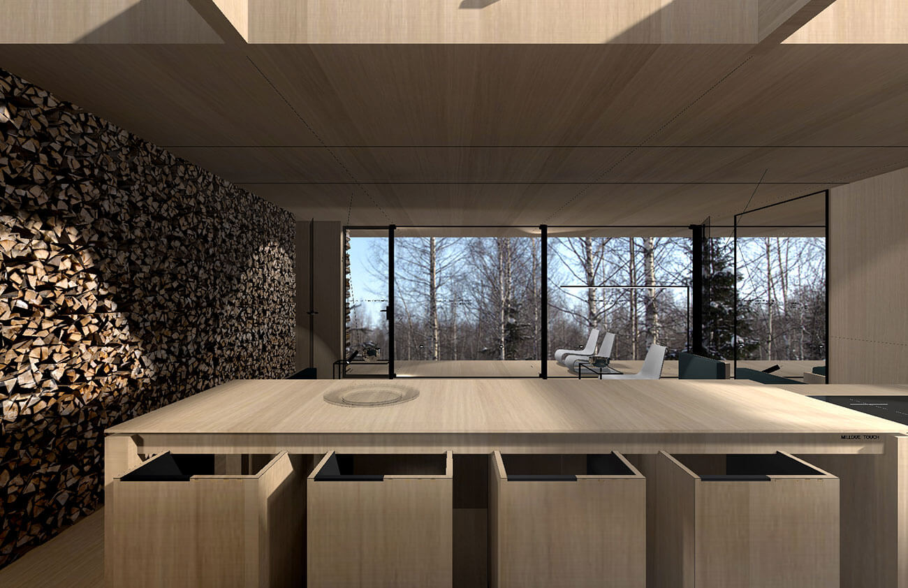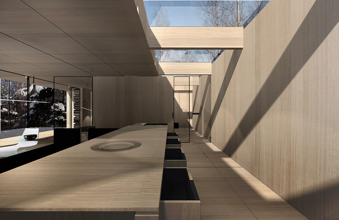 Благодаря линейной планировке в центре дома расположены гостиная, кухня и столовая, по двум сторонам от которых предусмотрены три спальни и ванные комнаты. Вся мебель для резиденции изготавливается строительным способом прямо на месте.