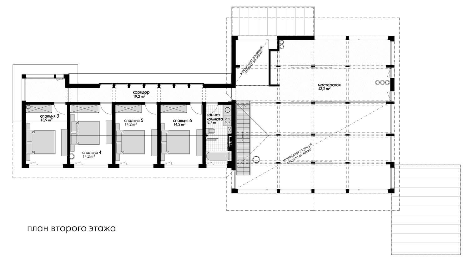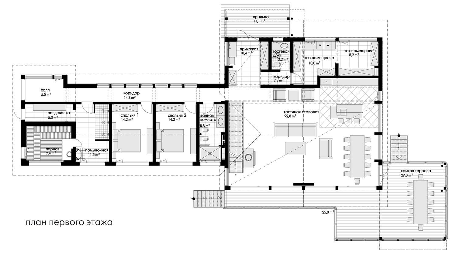 Спальни, санузлы с душевыми, банный блок отнесены в двухэтажное крыло дома.