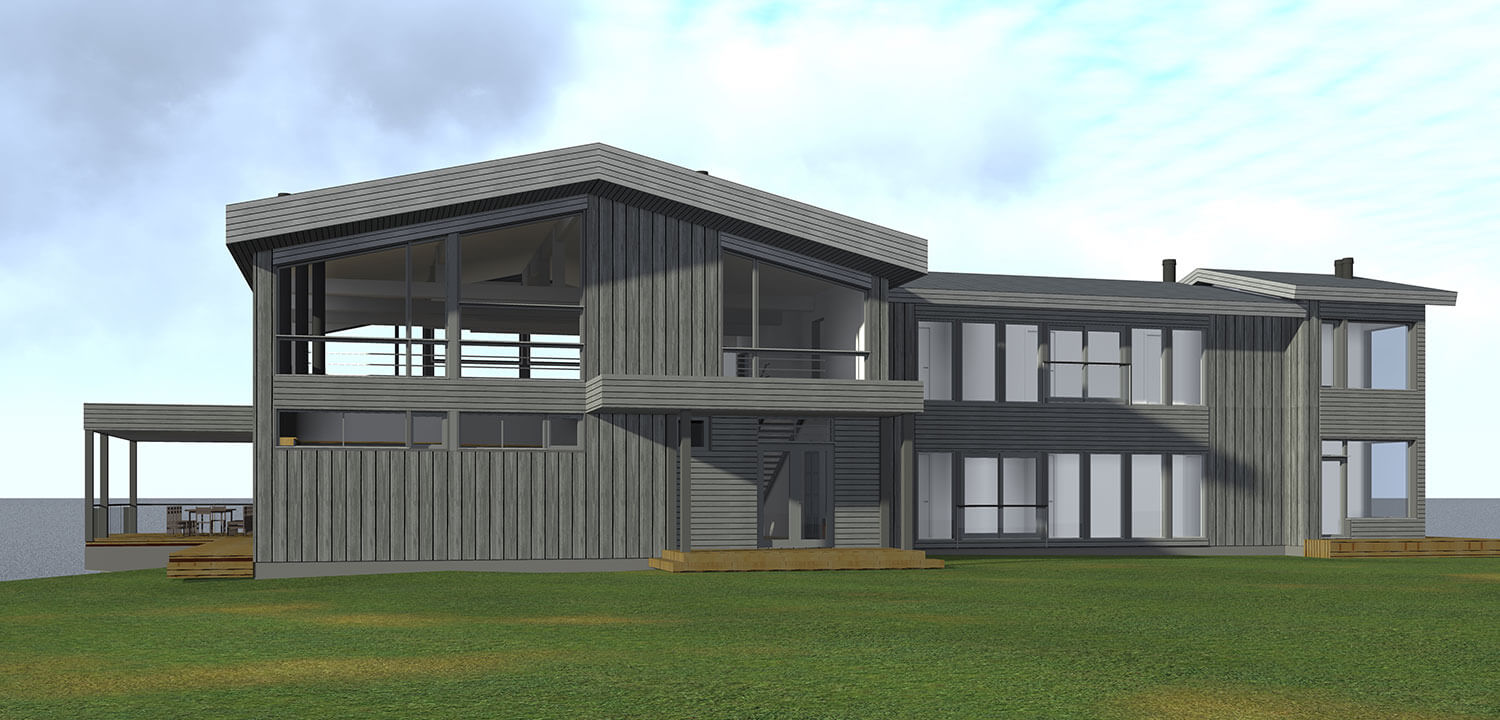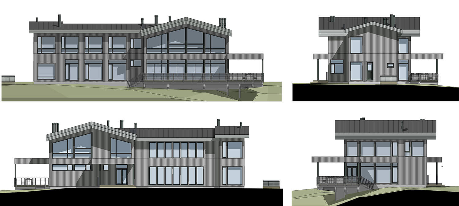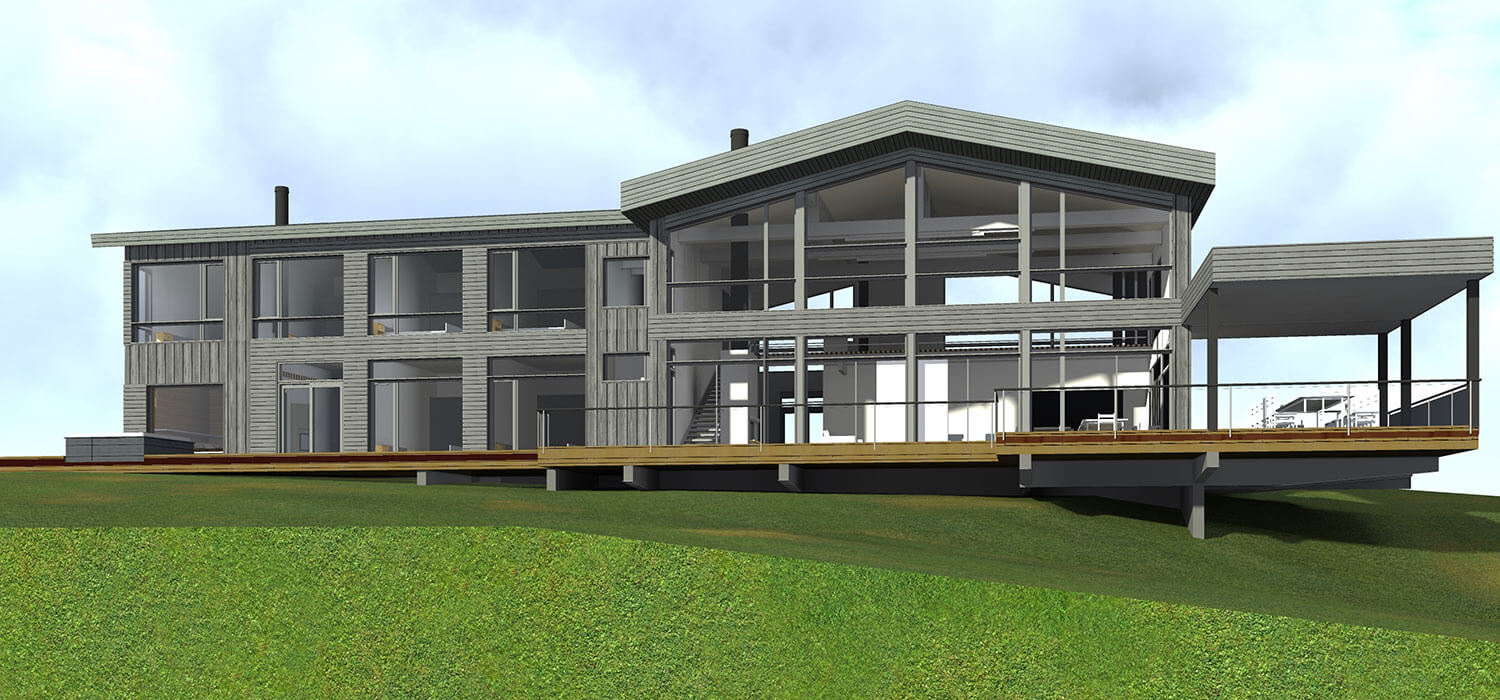 Ядром дома является большая двусветная гостиная с зоной кухни-столовой, камином и легкой лестницей на 2-й этаж. Чтобы усилить присутствие природного окружения, площадь остекления сделана максимальной. Из гостиной можно выйти на просторную террасу, зависшую над оврагом, спускающимся к берегу. Применение легкого свайного фундамента позволило сохранить деревья, вплотную подступающие к дому.