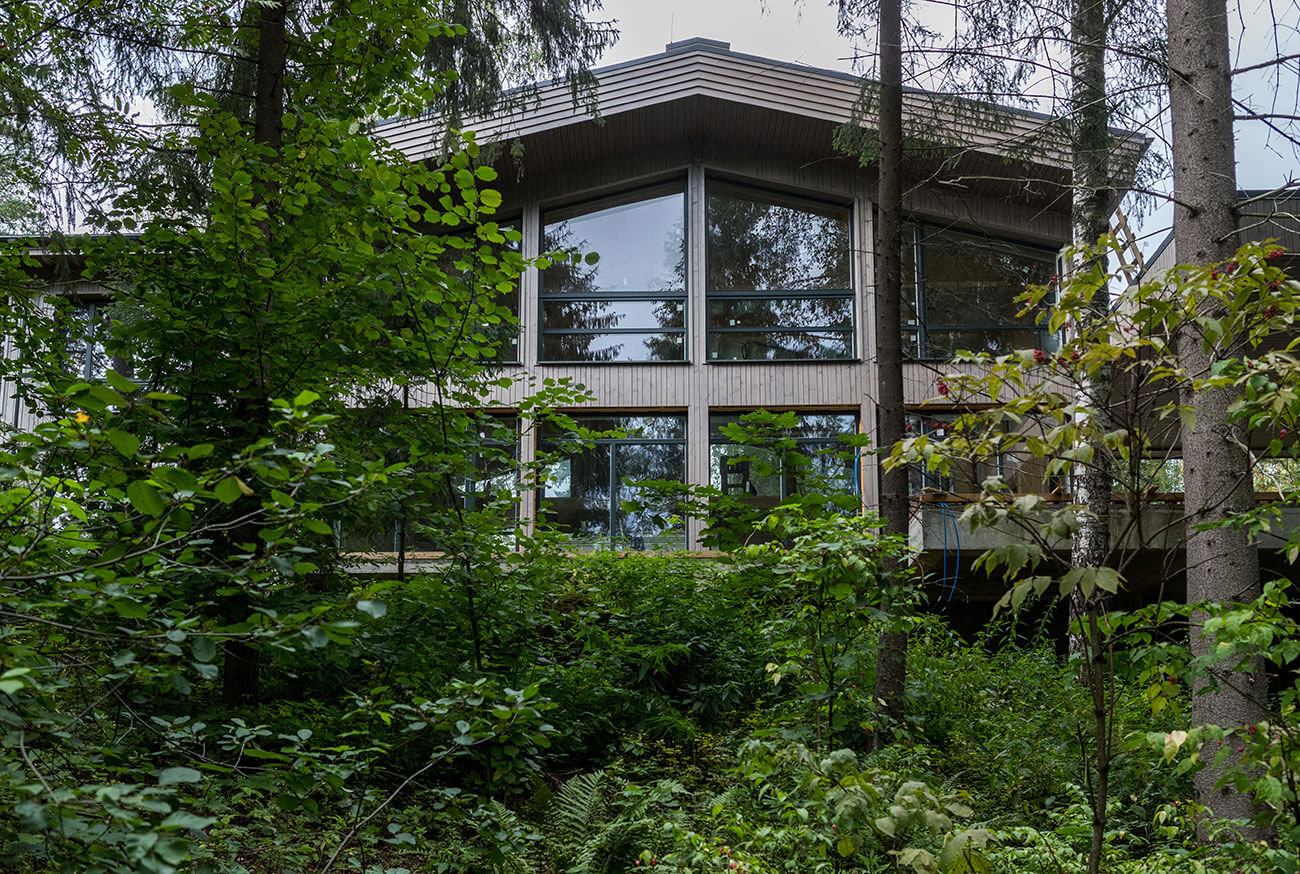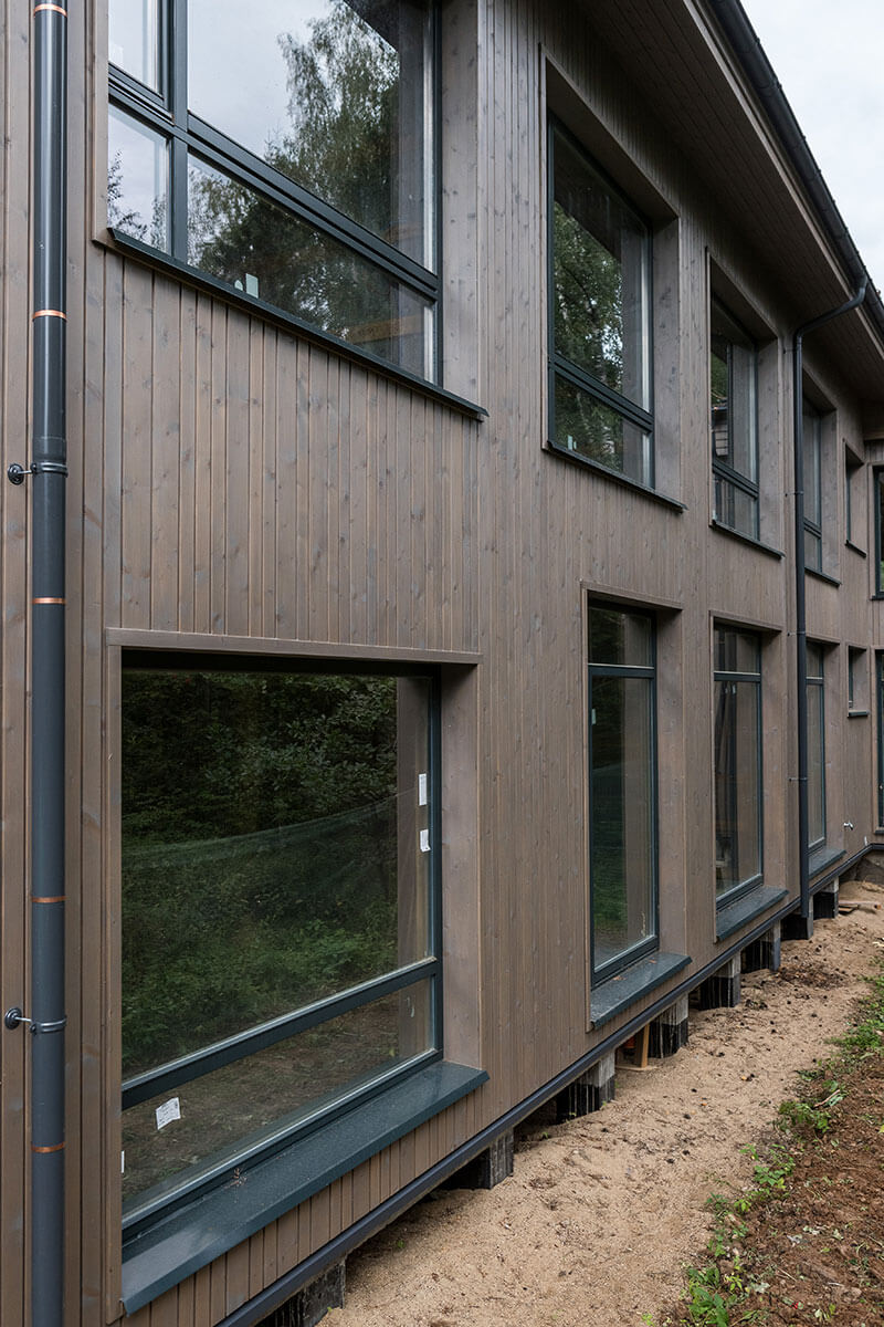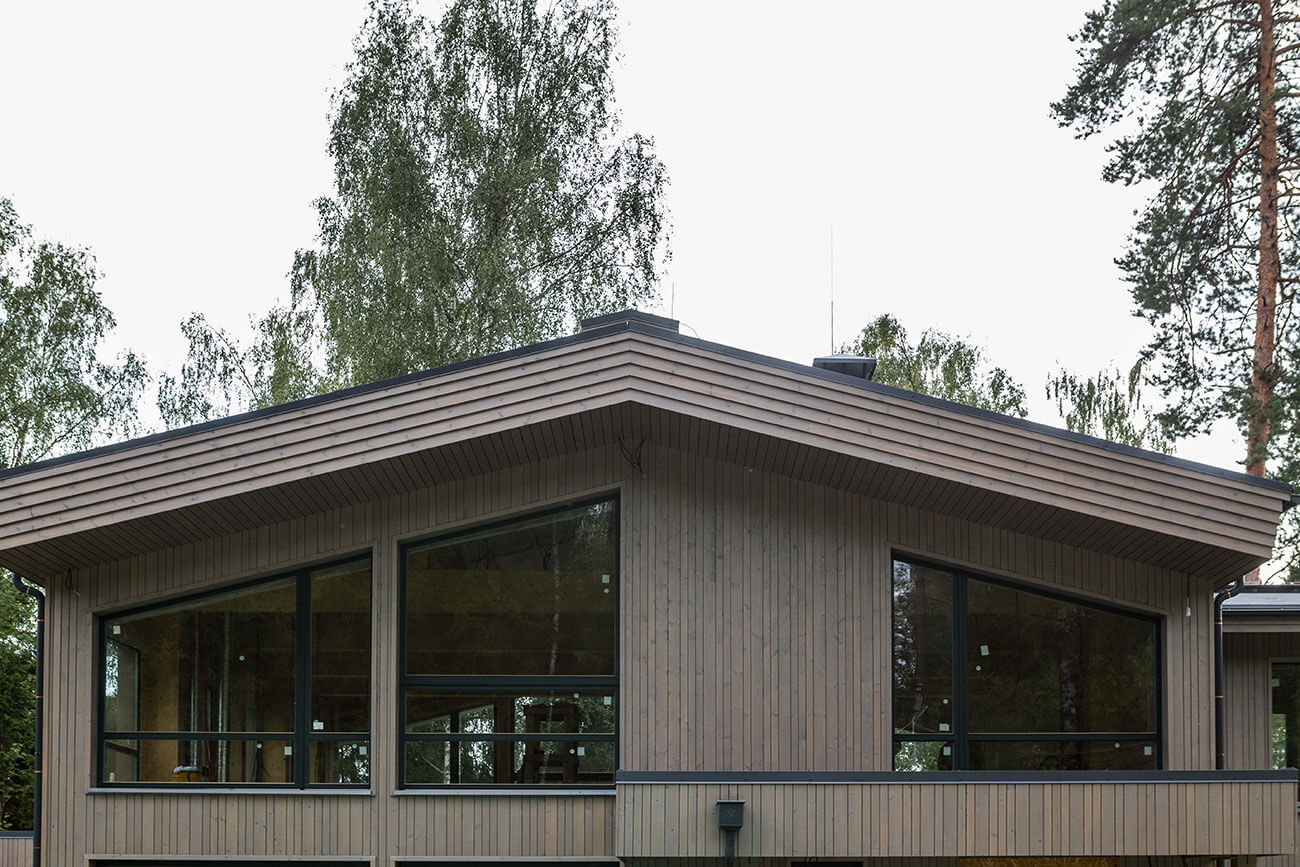 Стены дома выполнены из деревянного каркаса с заполнением экологически чистым базальтовым утеплителем, наружная деревянная облицовка — вертикально направленной стеновой панелью из древесины хвойных пород, окрашенной специально подобранным защитным покрытием. Цвет окон и стен дома в оттенках хвойного леса подчеркивает слияние дома с природным окружением.
