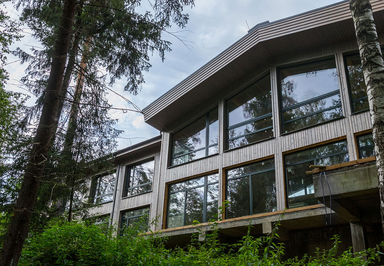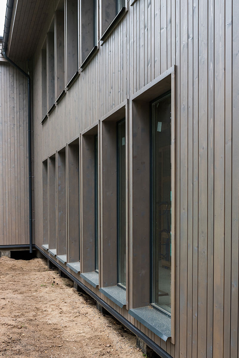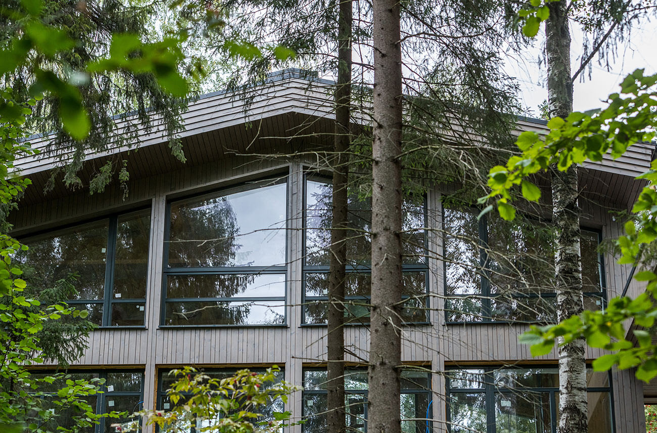 Стены дома выполнены из деревянного каркаса с заполнением экологически чистым базальтовым утеплителем, наружная деревянная облицовка — вертикально направленной стеновой панелью из древесины хвойных пород, окрашенной специально подобранным защитным покрытием. Цвет окон и стен дома в оттенках хвойного леса подчеркивает слияние дома с природным окружением.