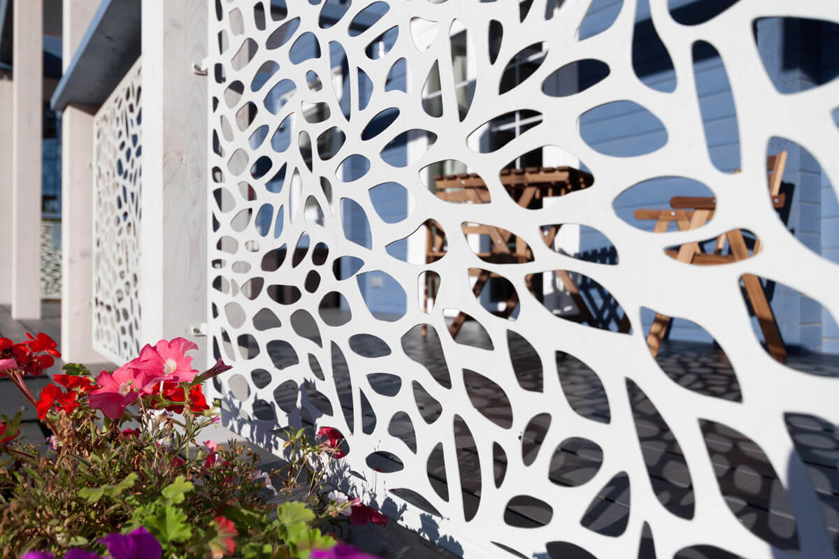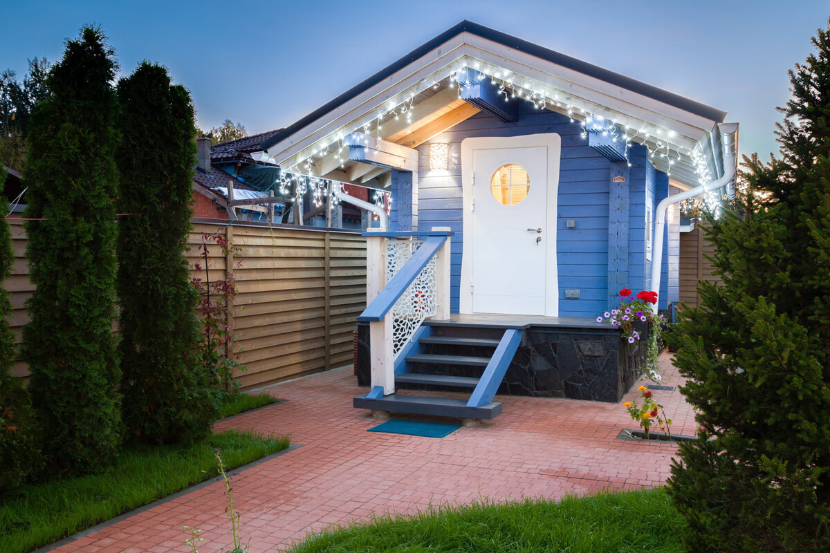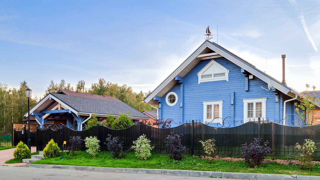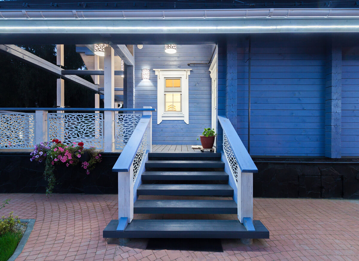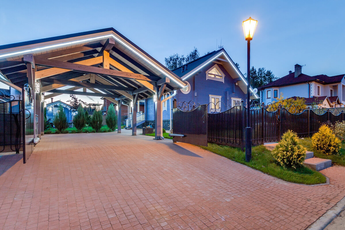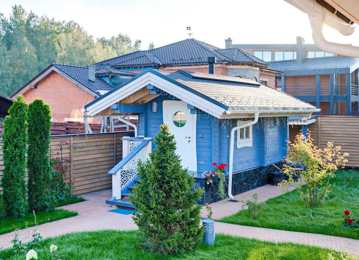 Для объединения всех строений усадьбы в гармоничный ансамбль применили единое цветовое решение Lavender, одинаковый рисунок отделки торцов кровли и ее покрытия для всех строений, разработали дизайн ограждений террас и наружных светильников усадьбы. Круглое окно — иллюминатор туалетной комнаты дома и круглый иллюминатор входной двери бани. Вот как-то все и объединилось.